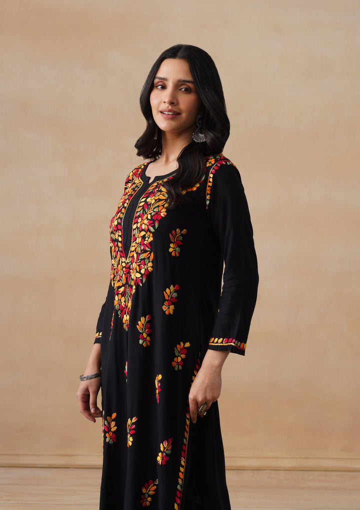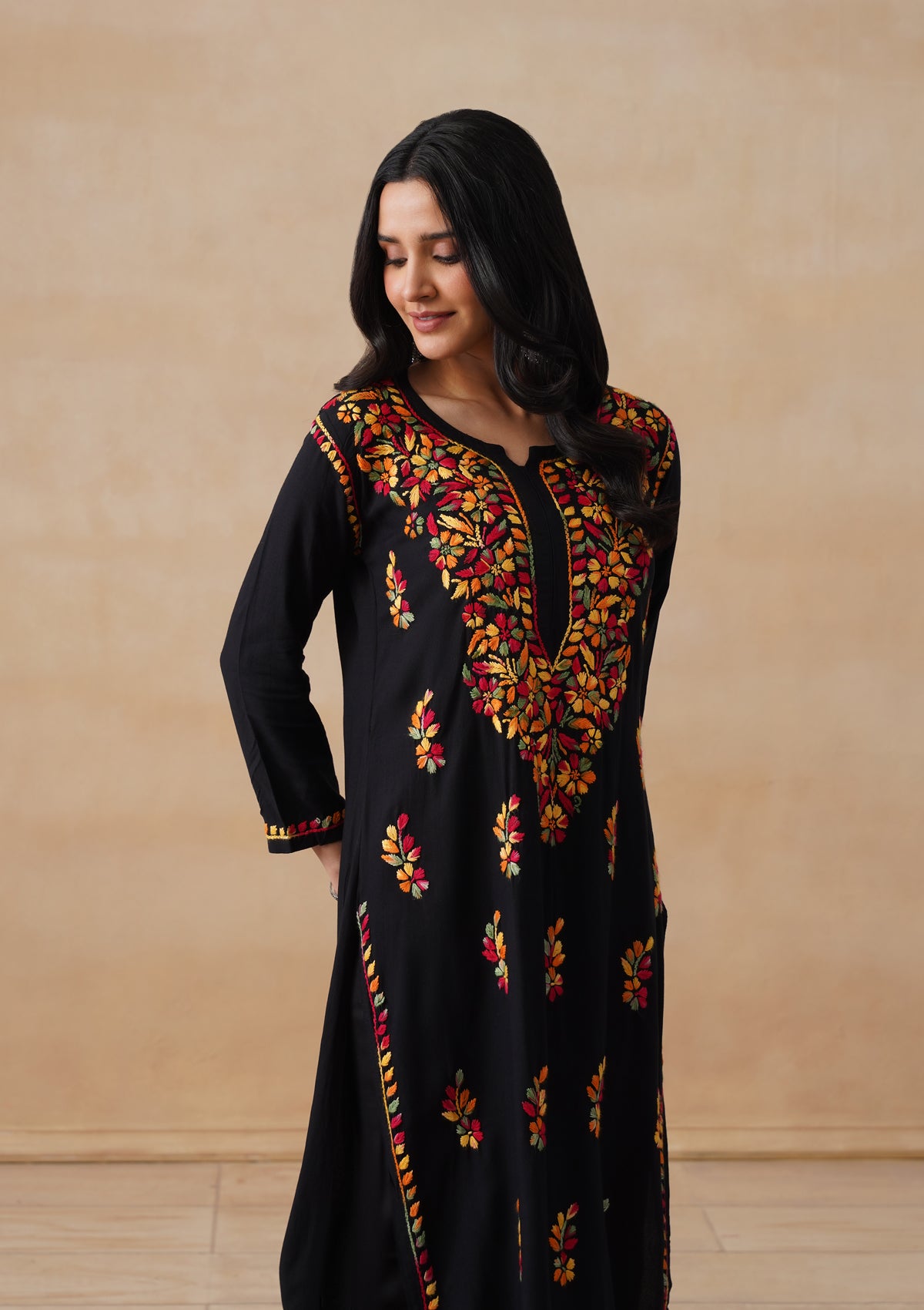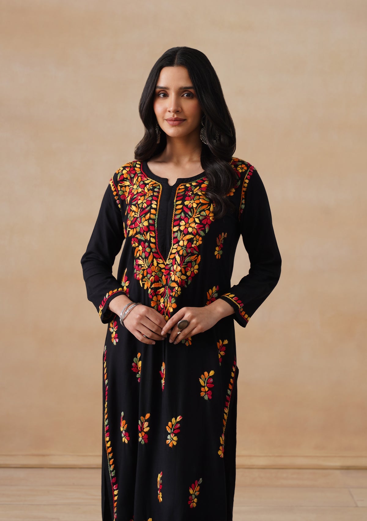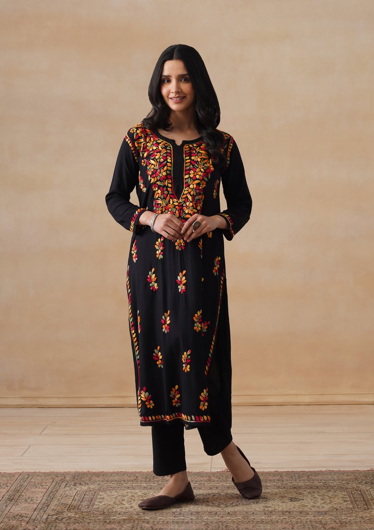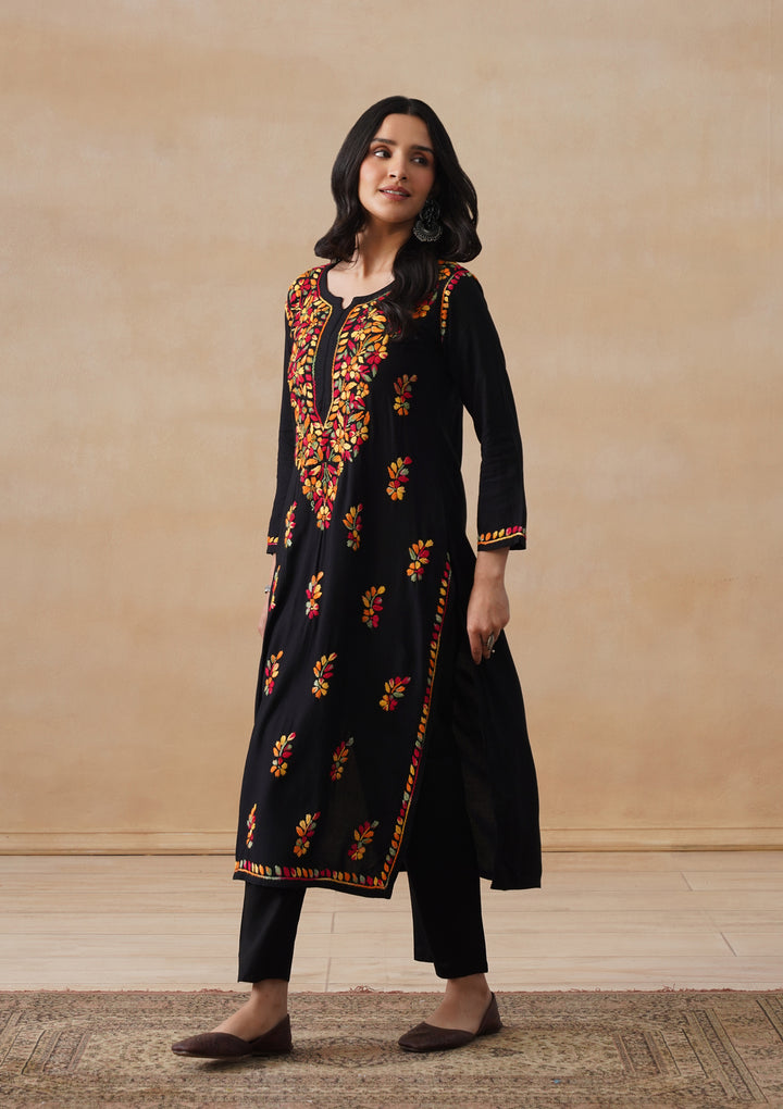 HOC Rayon Chikankari Solid Women's Long Kurta - Black