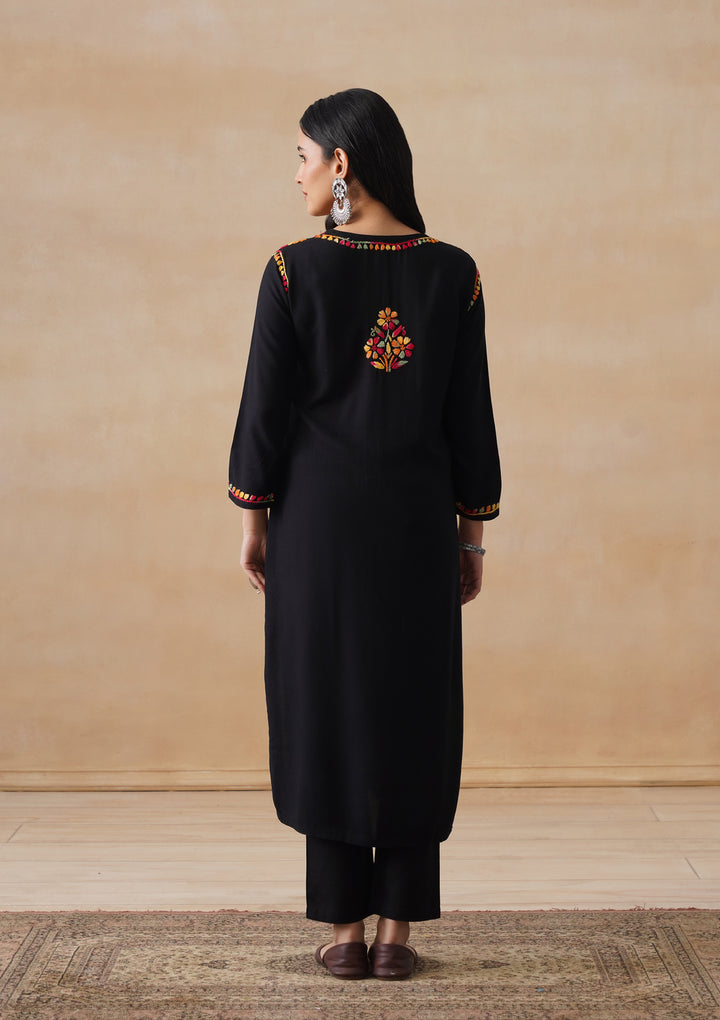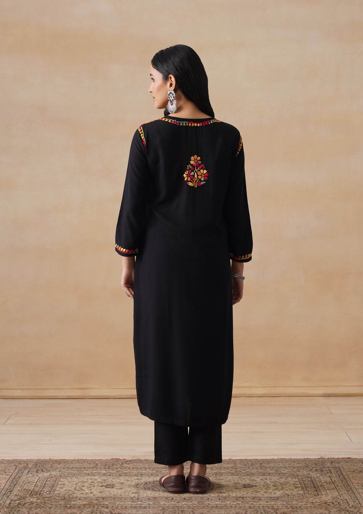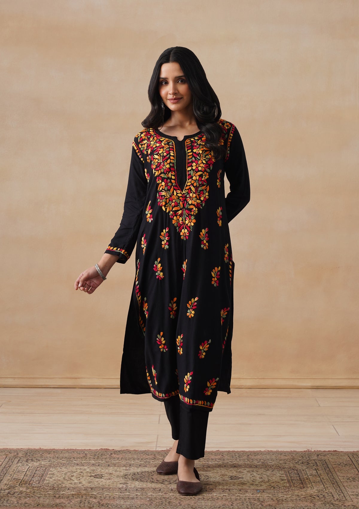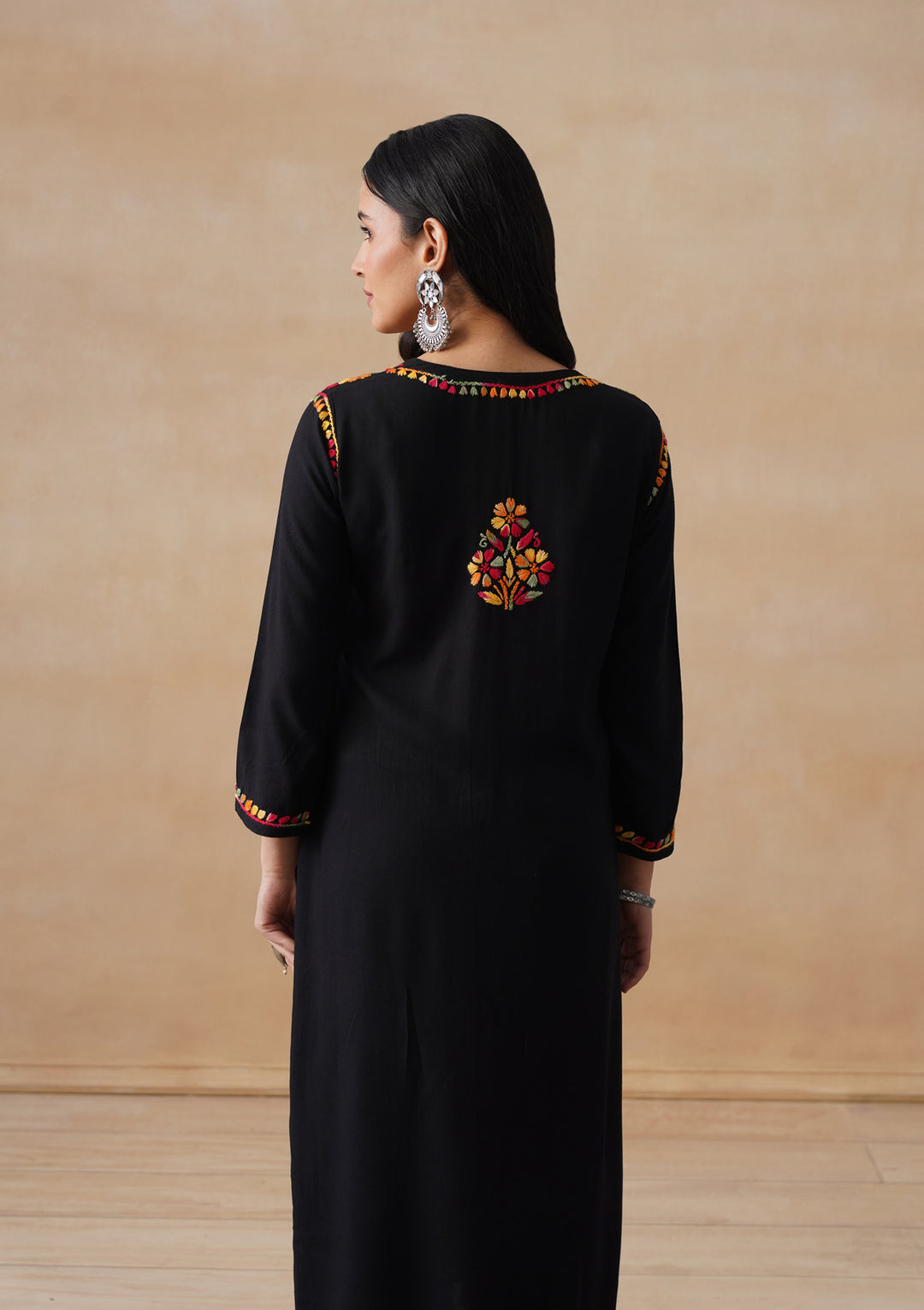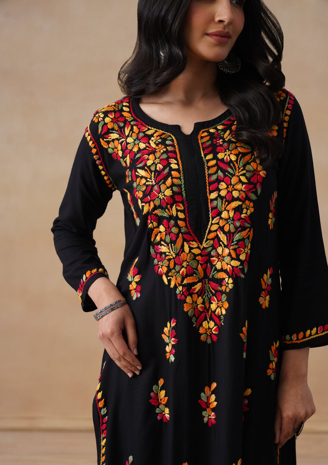 HOC Rayon Chikankari Solid Women's Long Kurta - Black