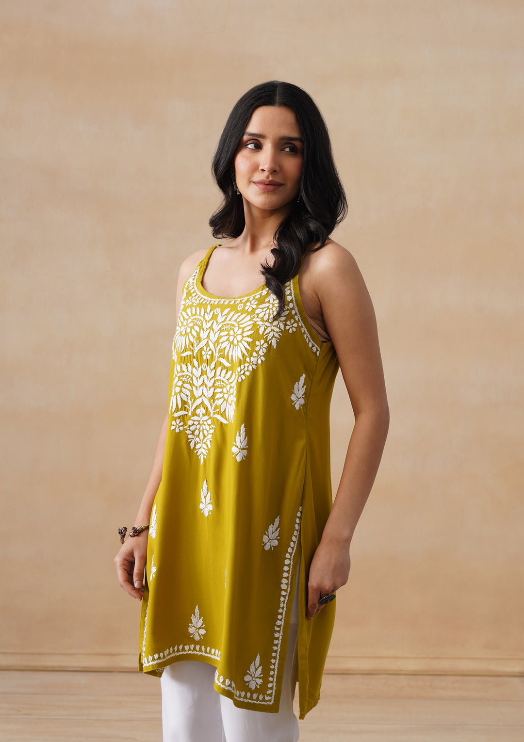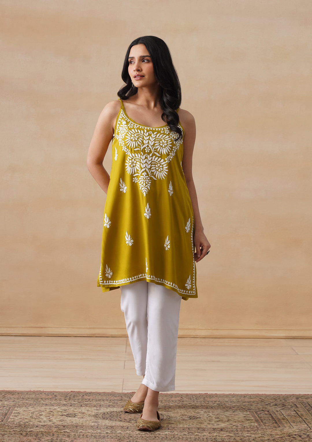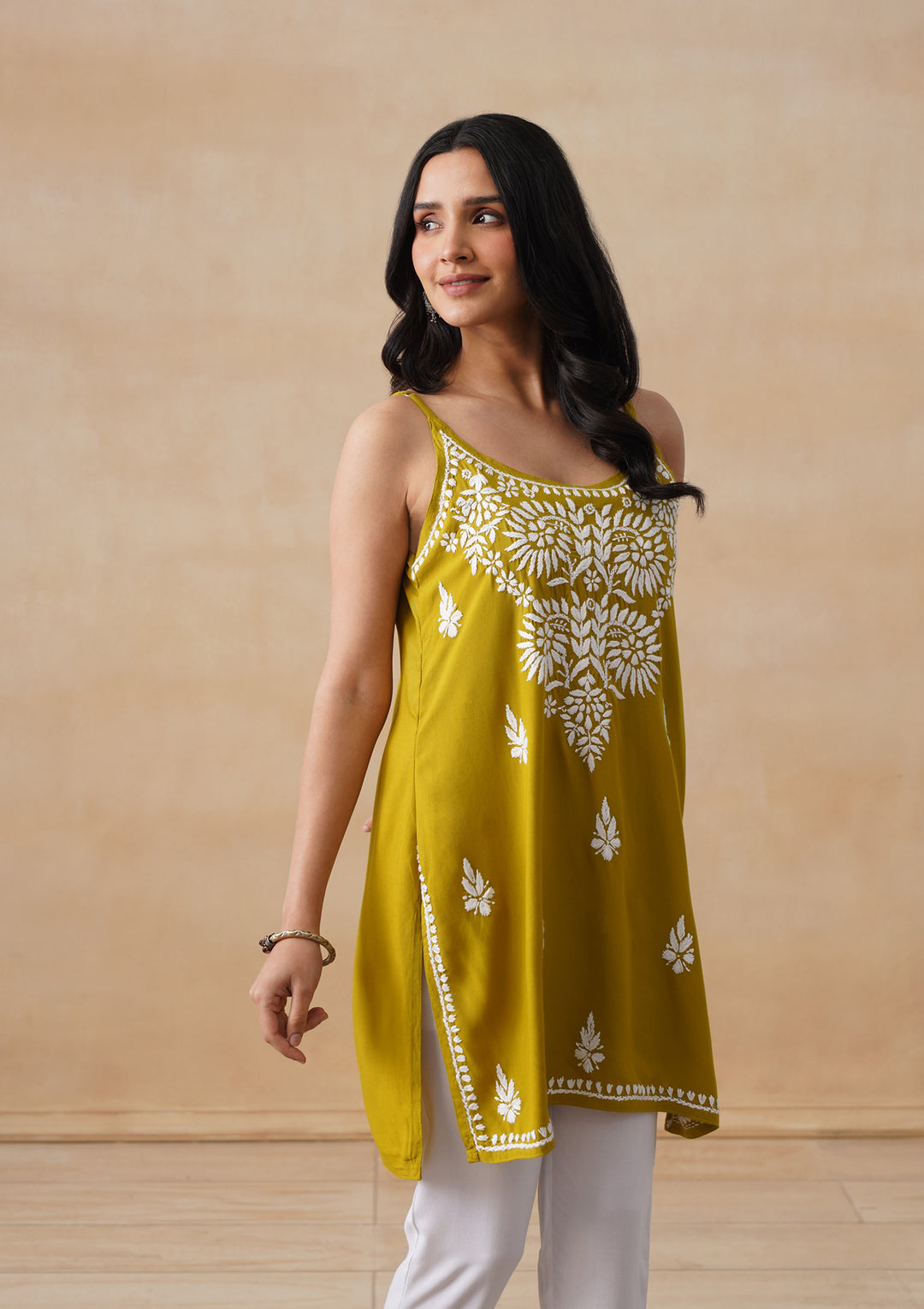 HOC Rayon Chikankari Solid Women's Short Kurta - Lime Yellow