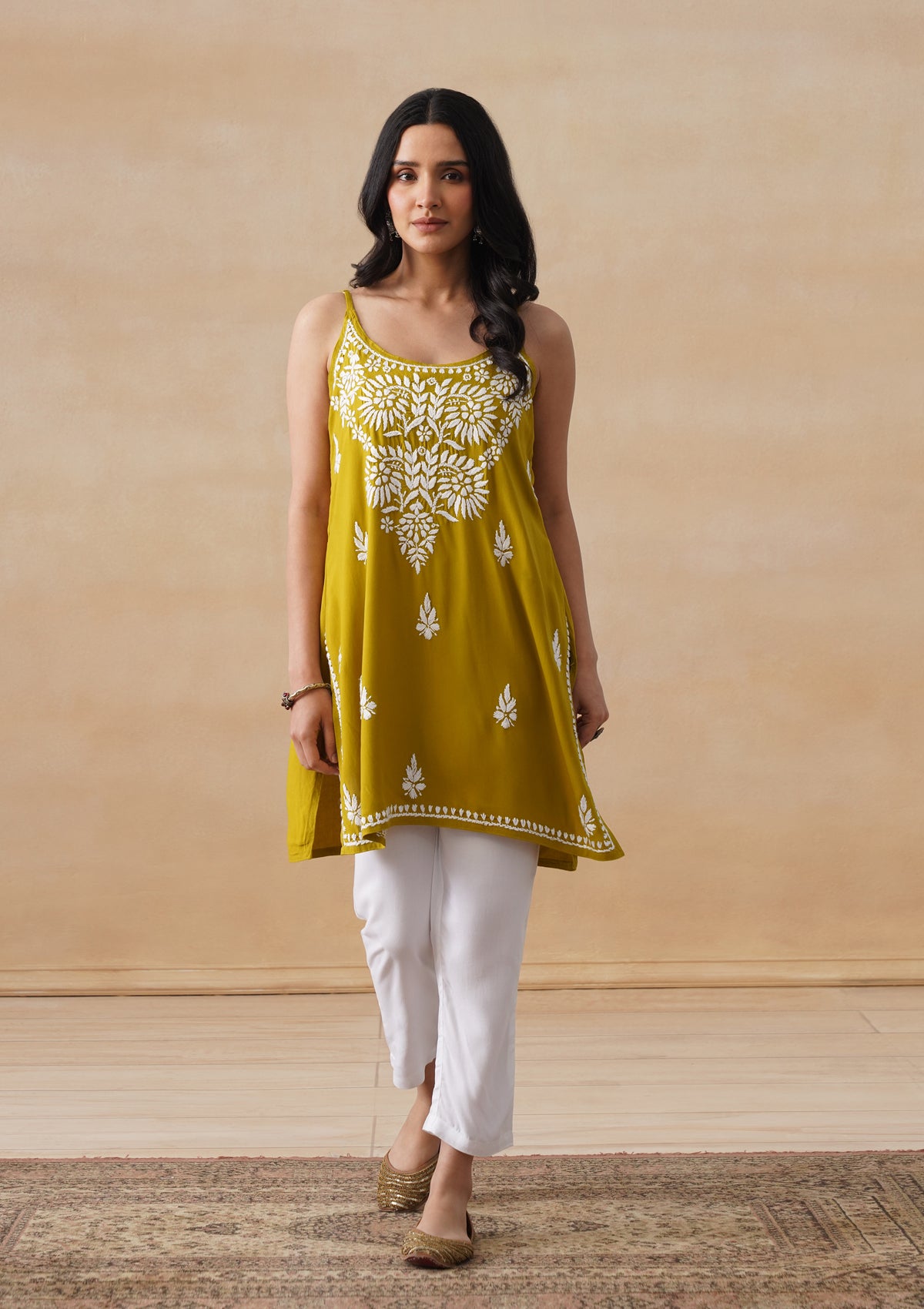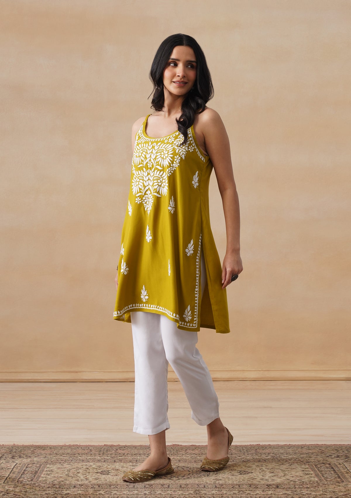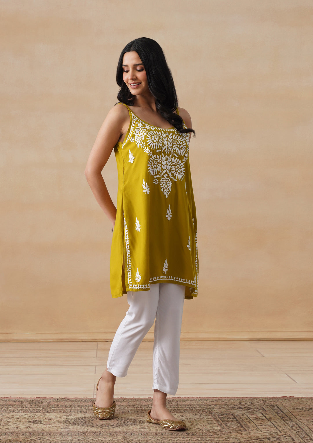 HOC Rayon Chikankari Solid Women's Short Kurta - Lime Yellow