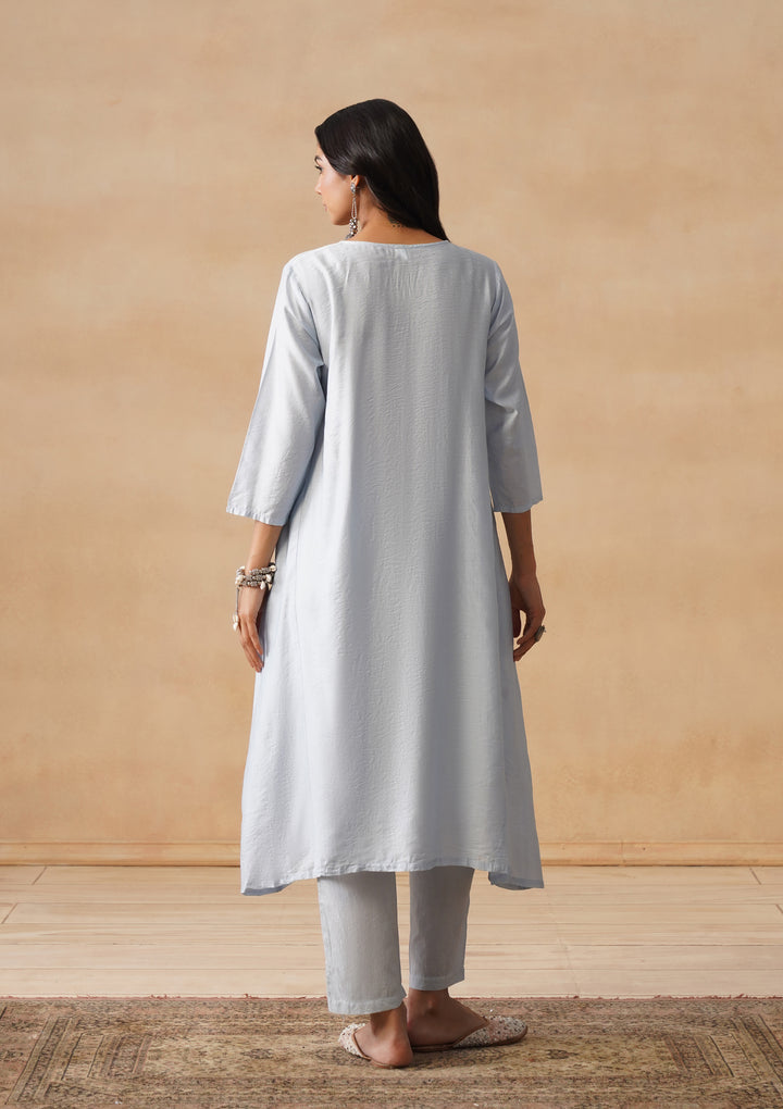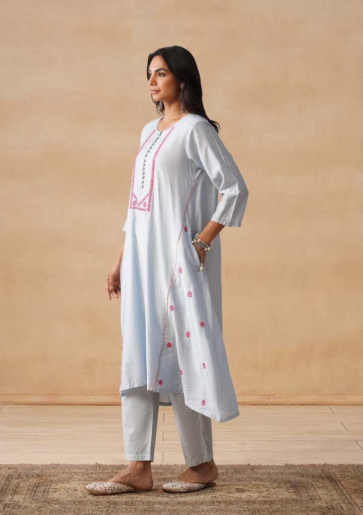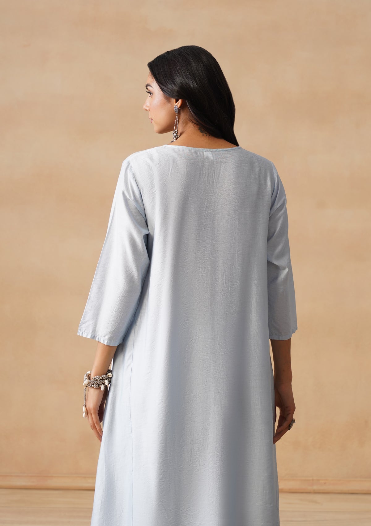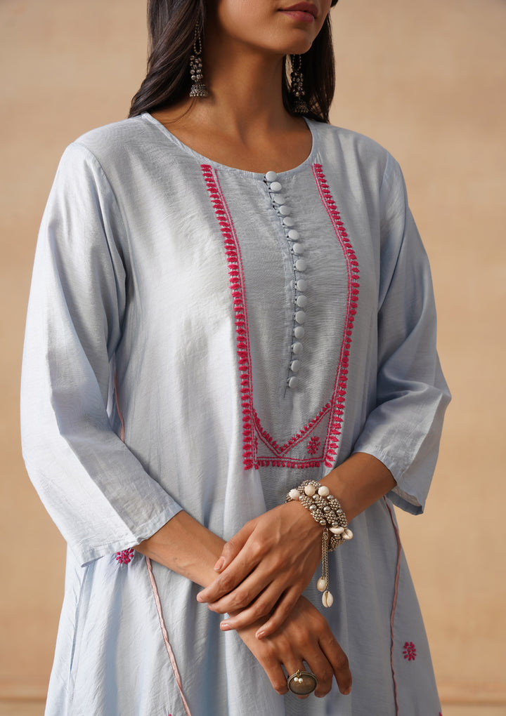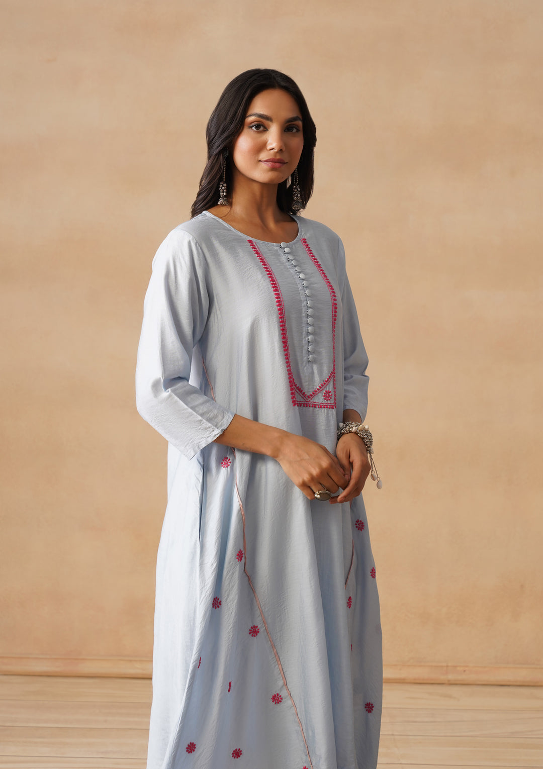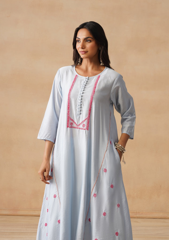 HOC Chanderi Chikankari Solid A-Line Women's Long Kurta - Blue