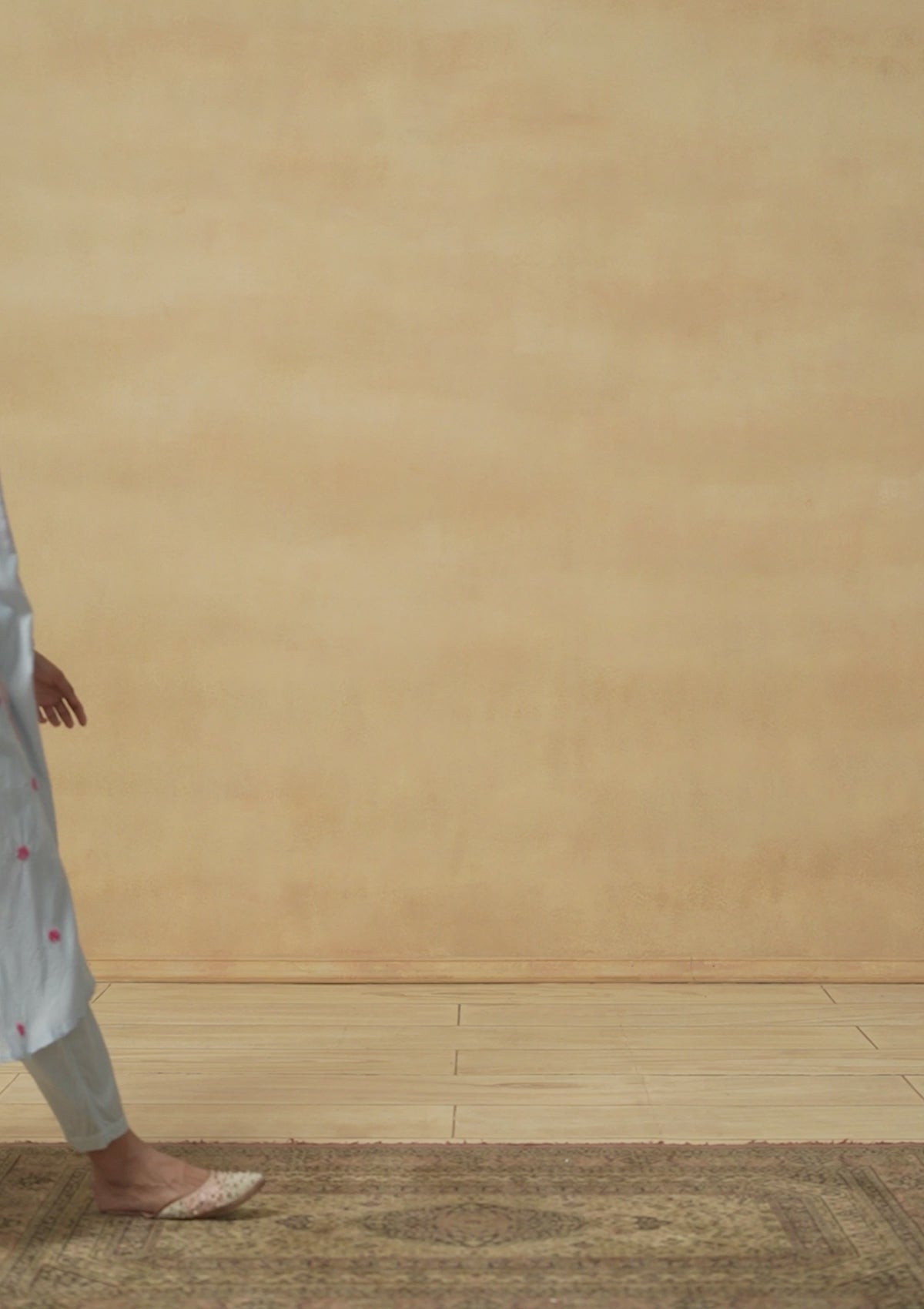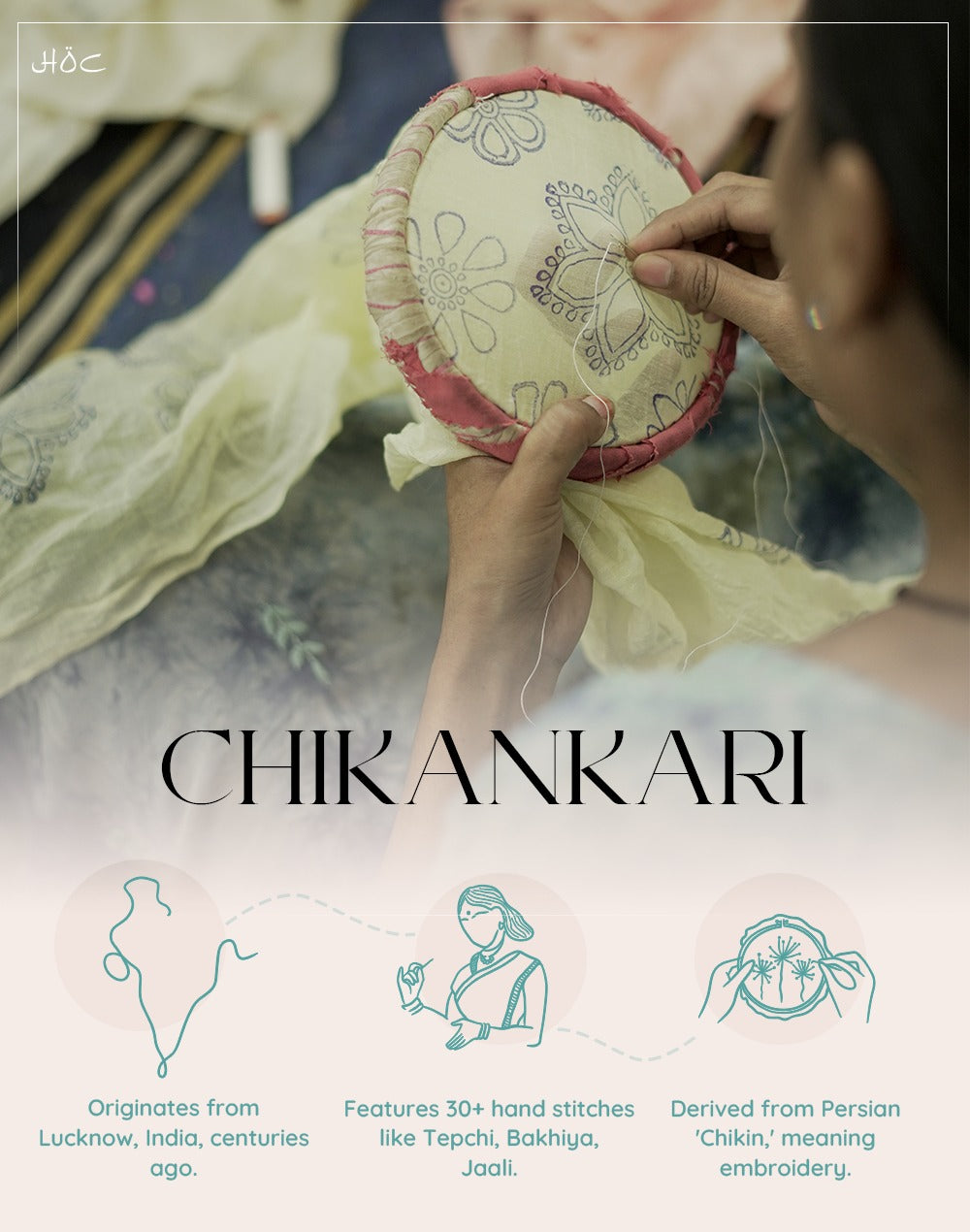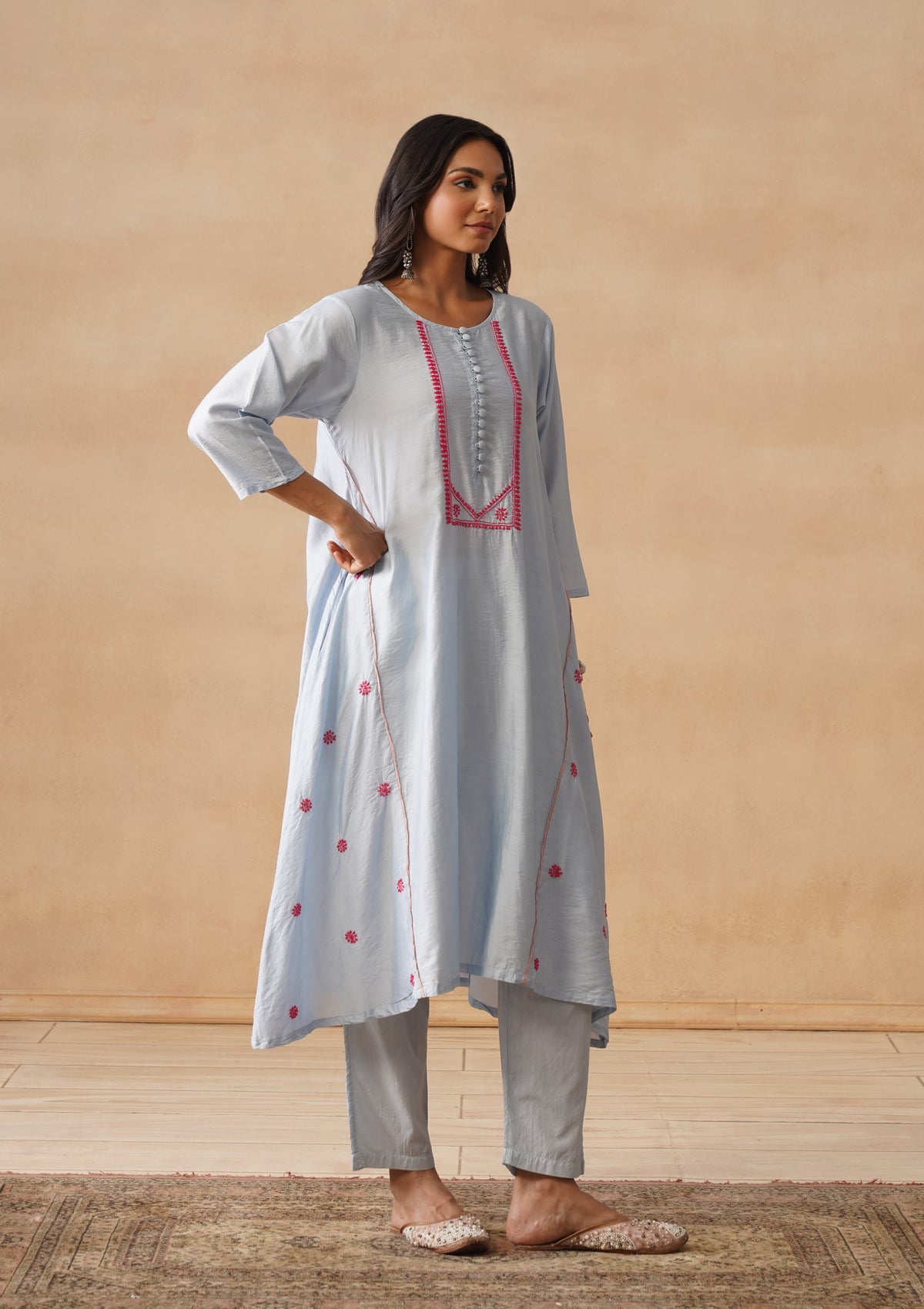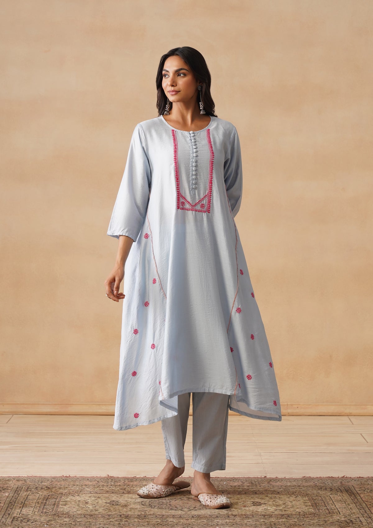 HOC Chanderi Chikankari Solid A-Line Women's Long Kurta - Blue