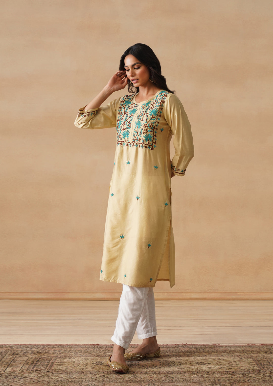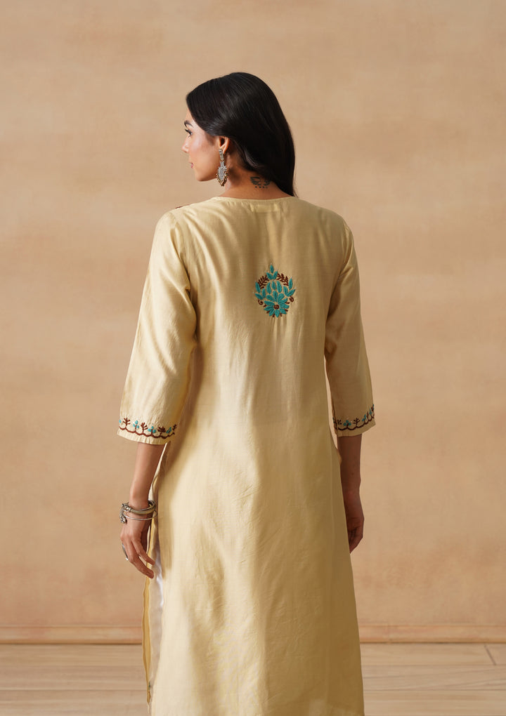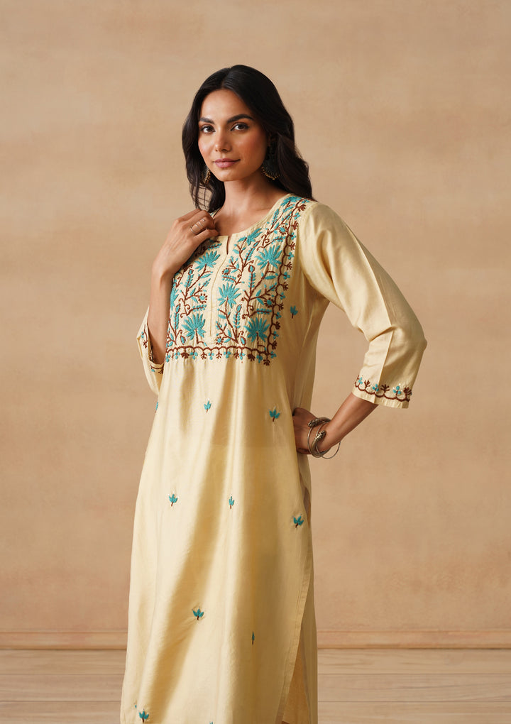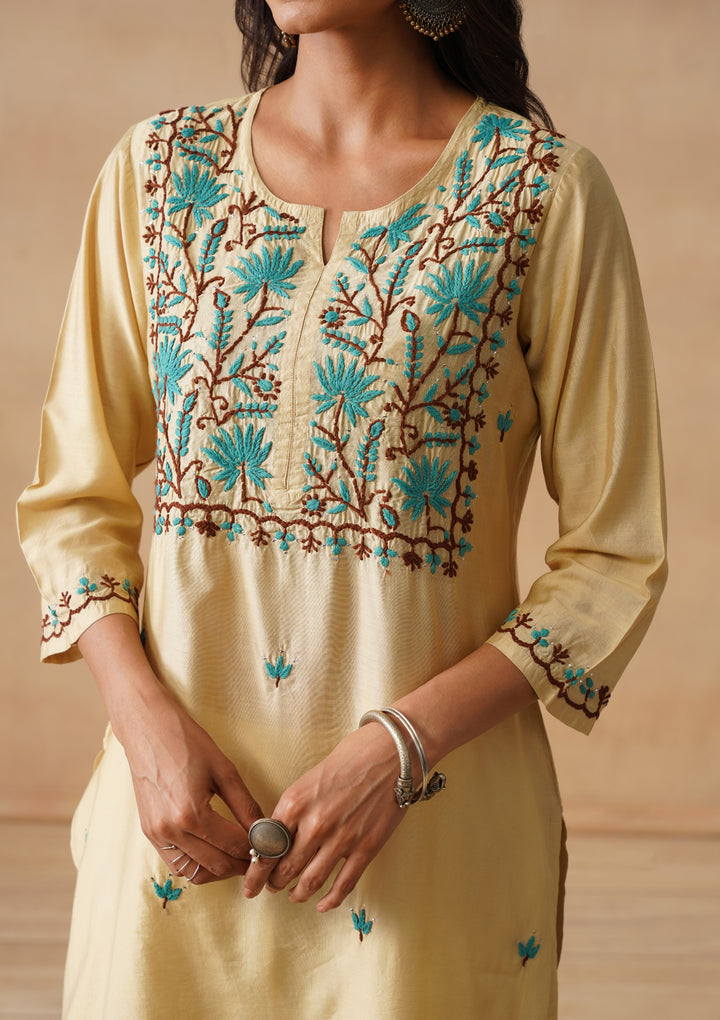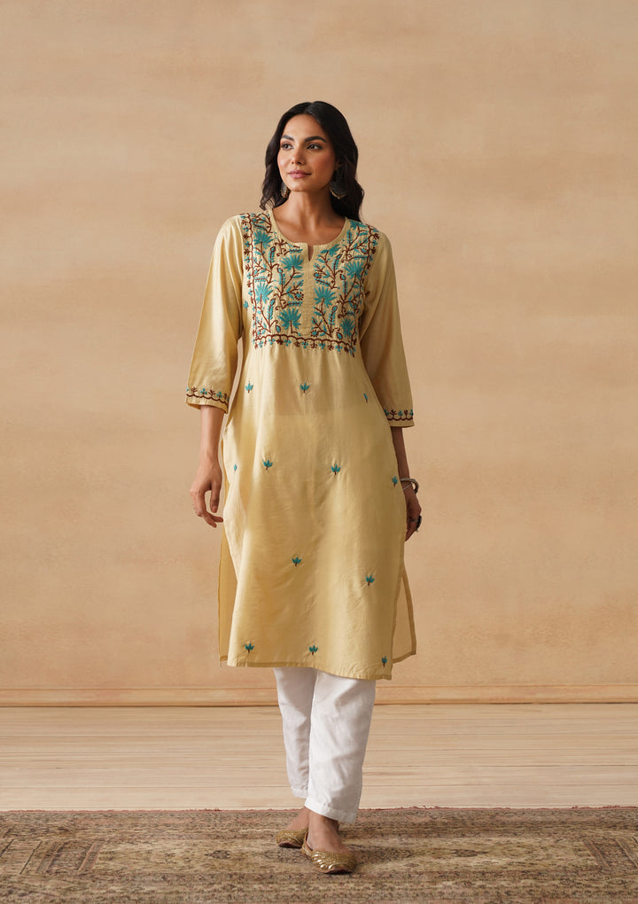 HOC Chanderi Chikankari Solid Straight Women's Long Kurta - Beige