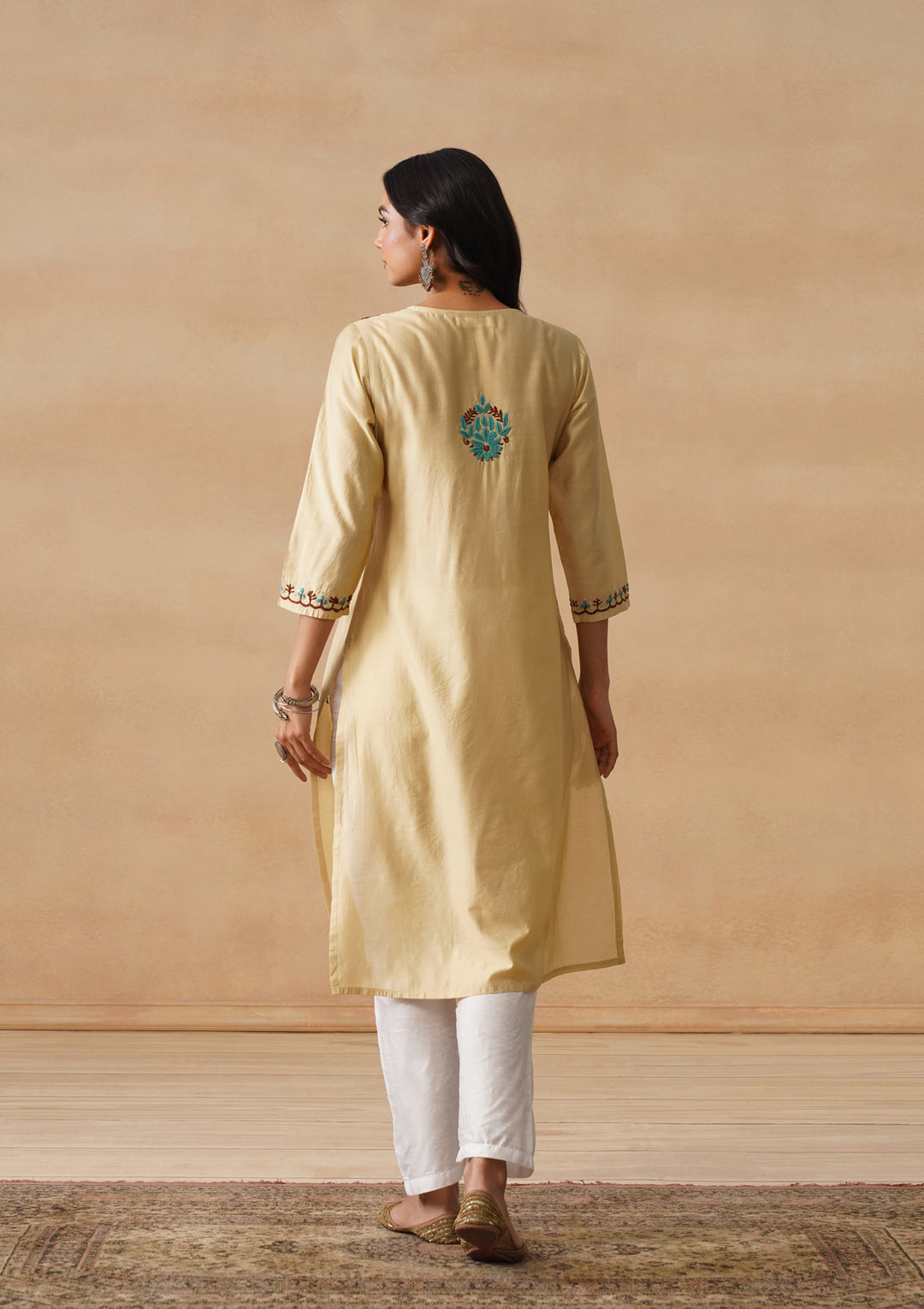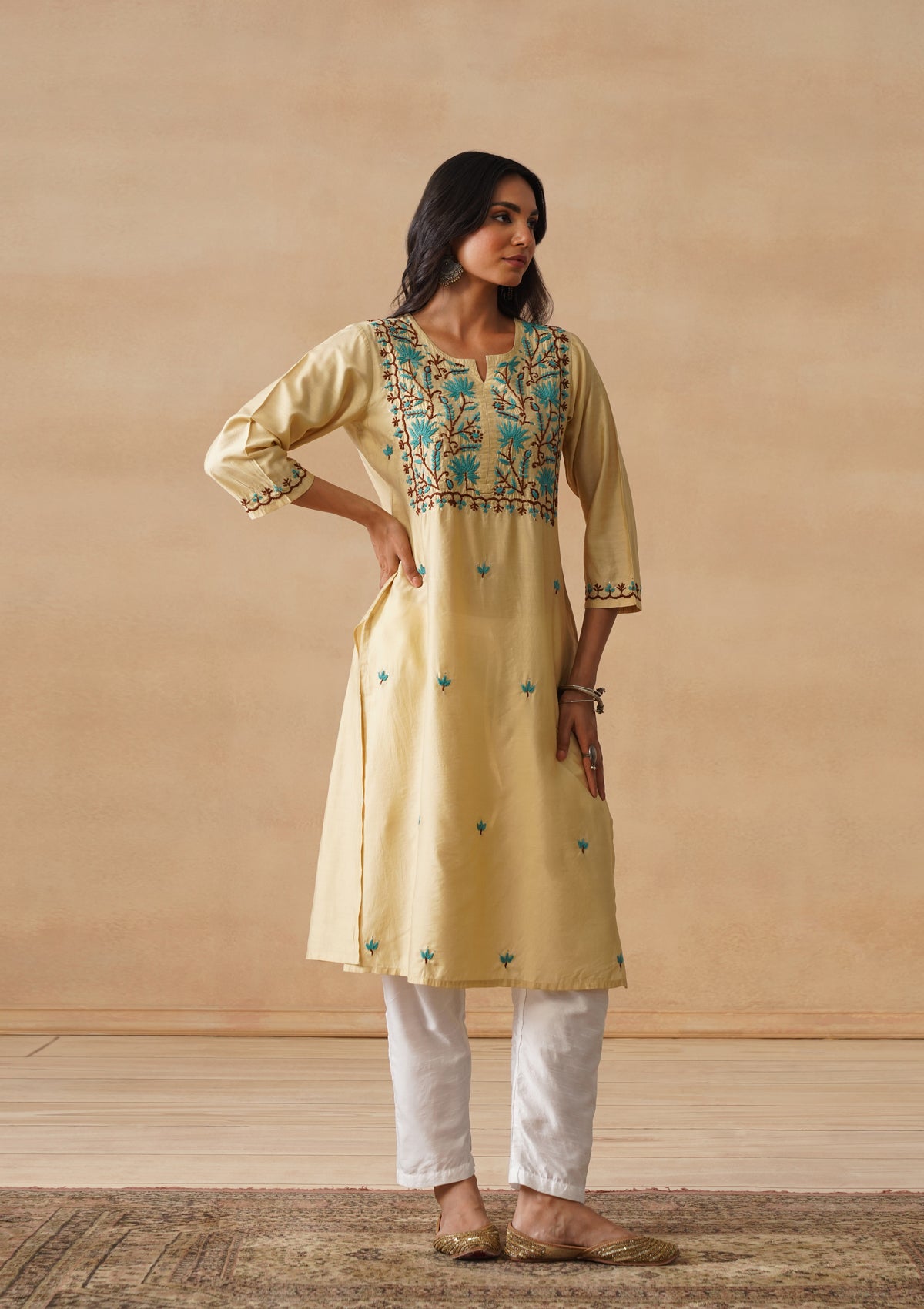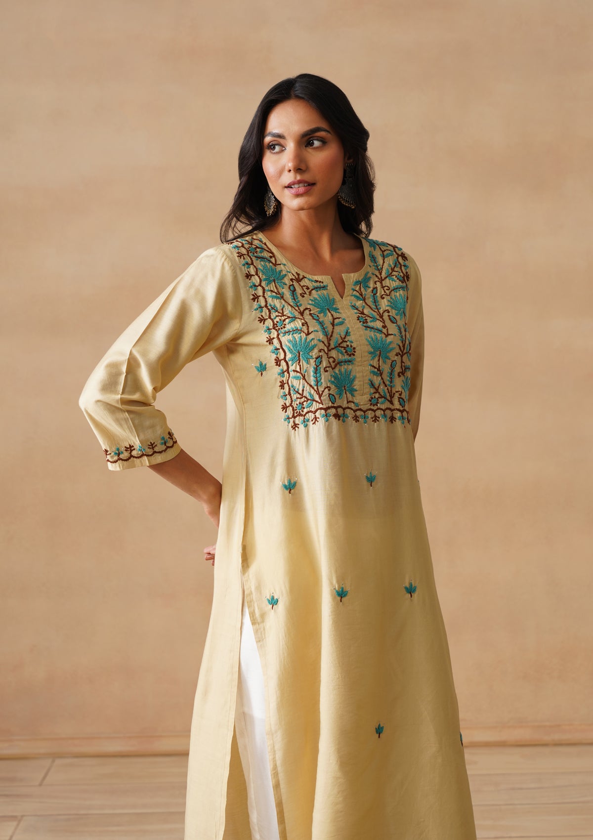 HOC Chanderi Chikankari Solid Straight Women's Long Kurta - Beige