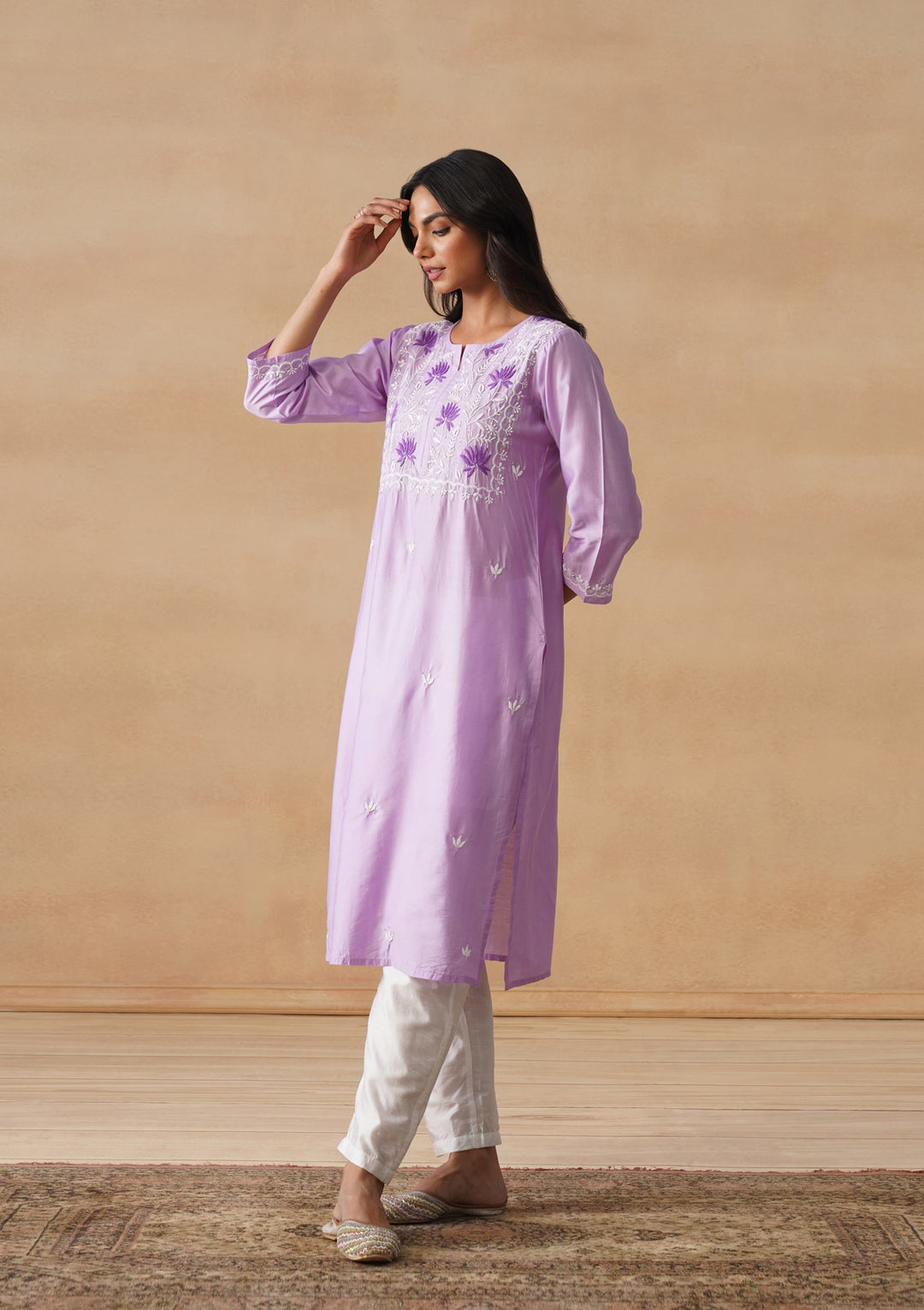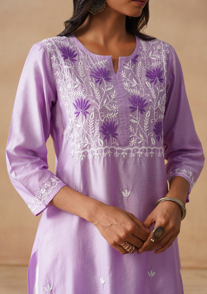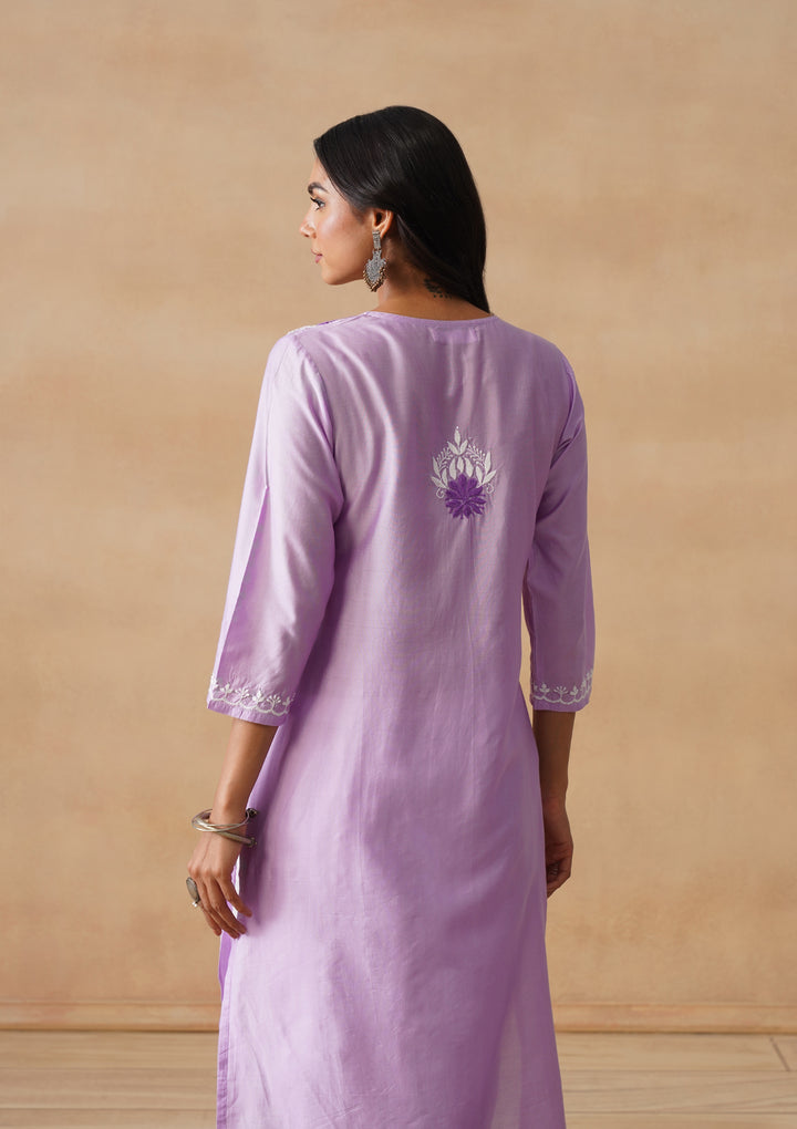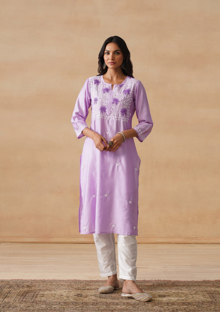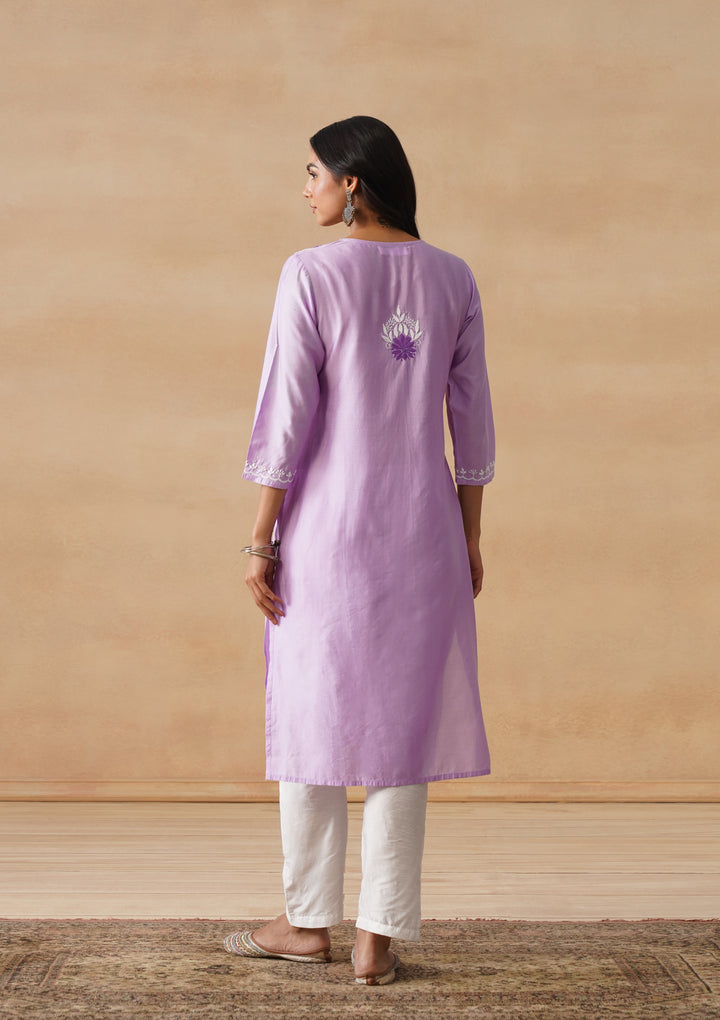 HOC Chanderi Chikankari Solid Straight Women's Long Kurta - Lavender