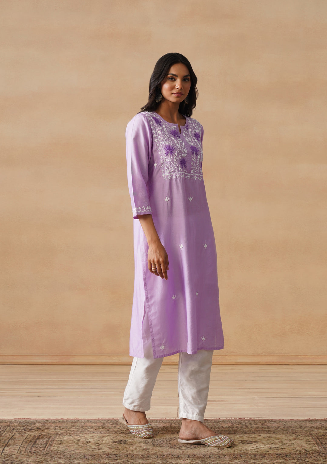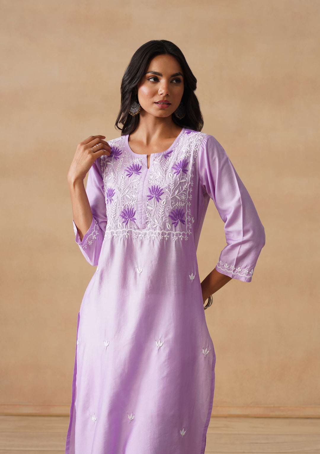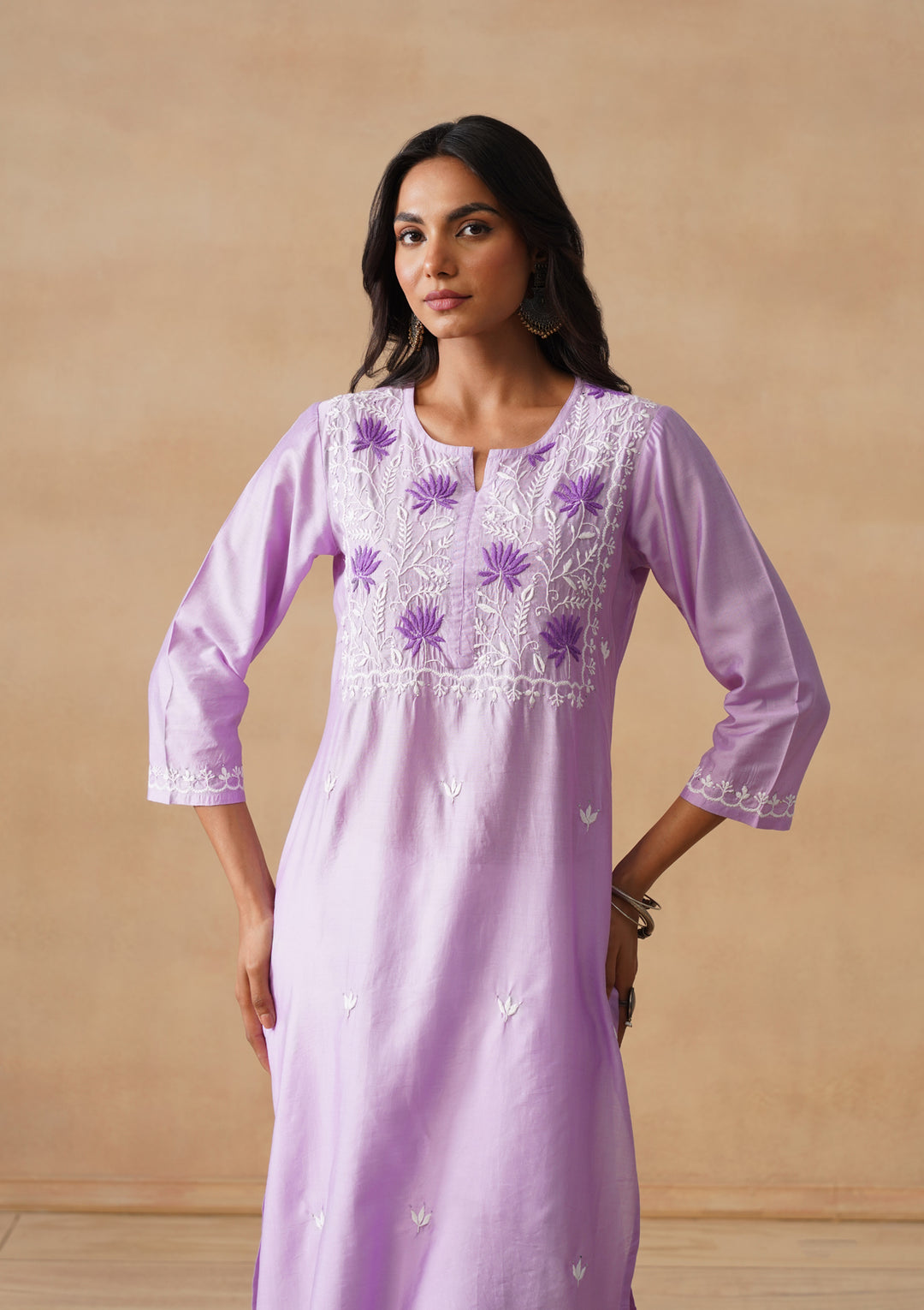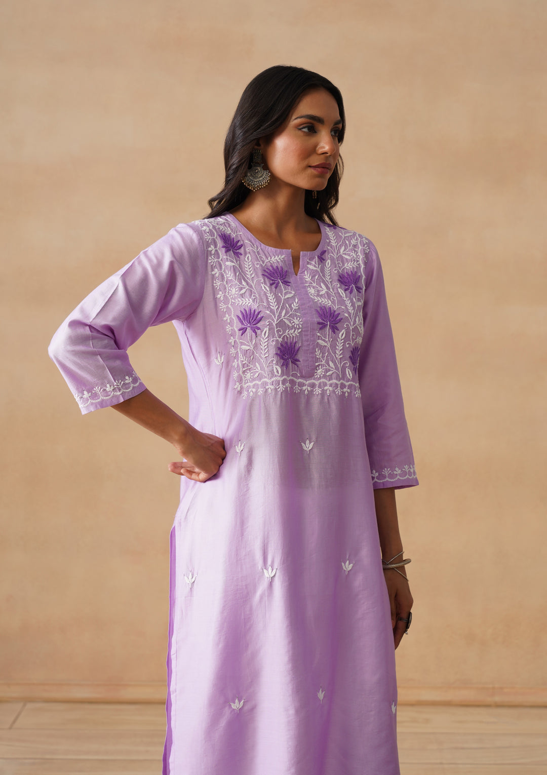 HOC Chanderi Chikankari Solid Straight Women's Long Kurta - Lavender