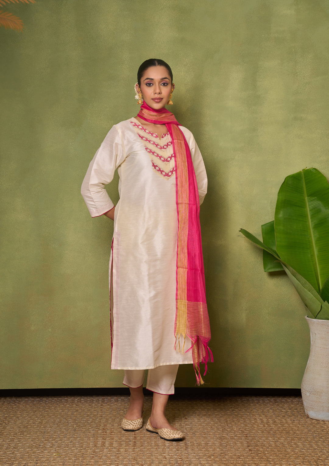 HOC Silk Blend Solid Women's 3 PC Long Kurta Set - Cream