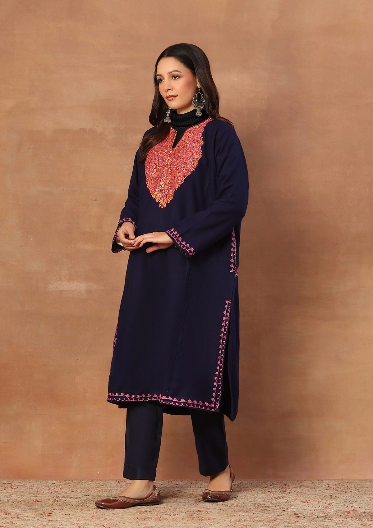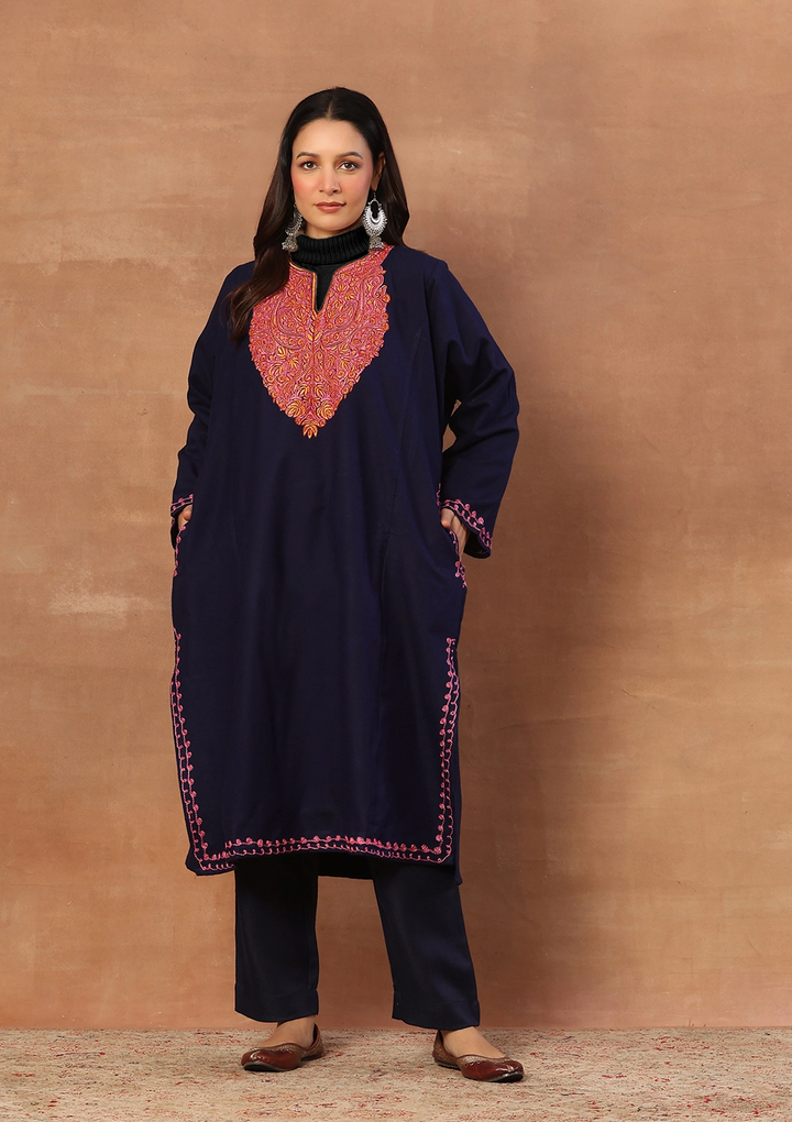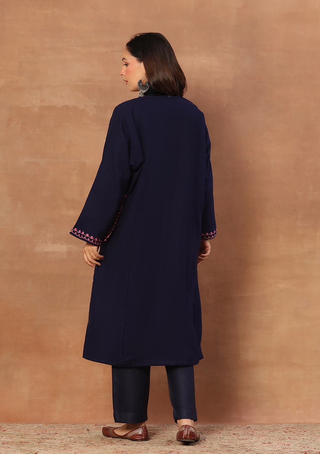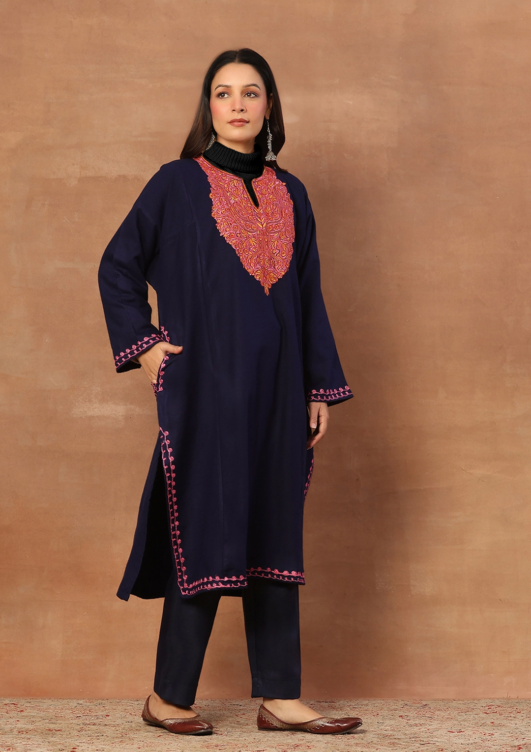 HOC Kashmiri Wool Sozni Embroidered Solid Women's Long Phiran-Blue