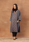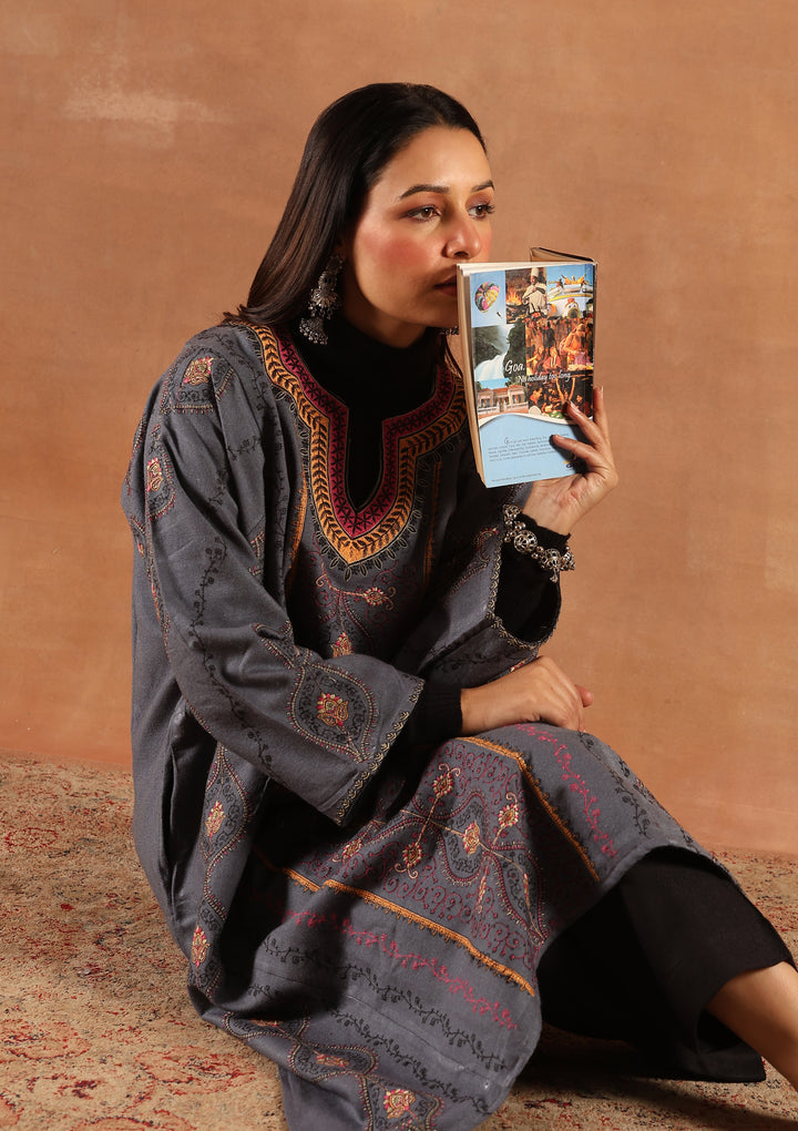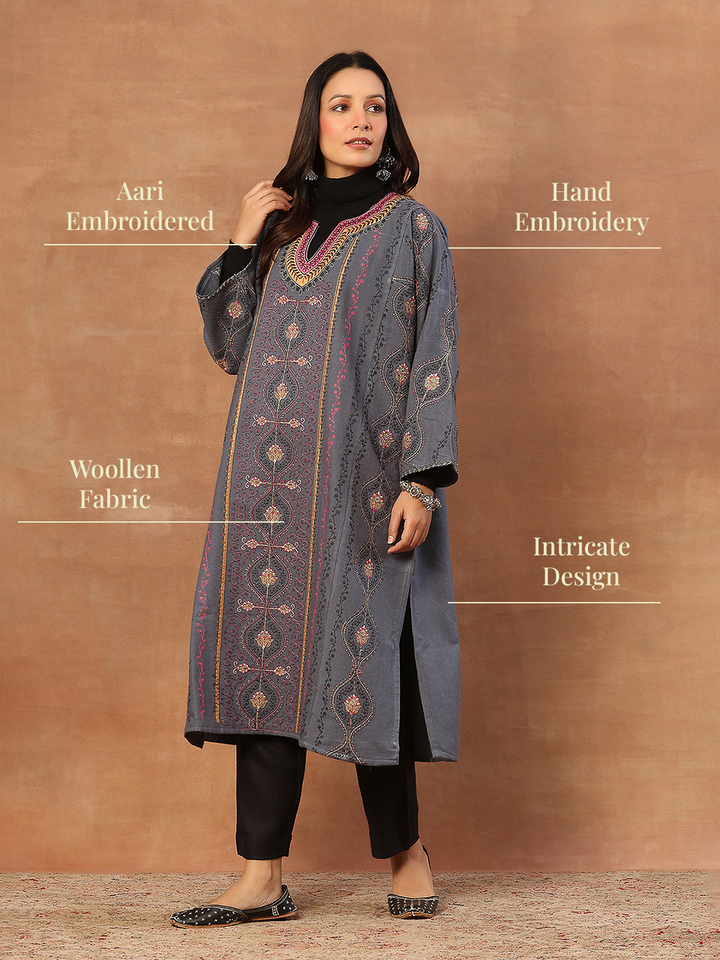 HOC Kashmiri Wool Sozni Embroidered Solid Women's Long Phiran-Grey