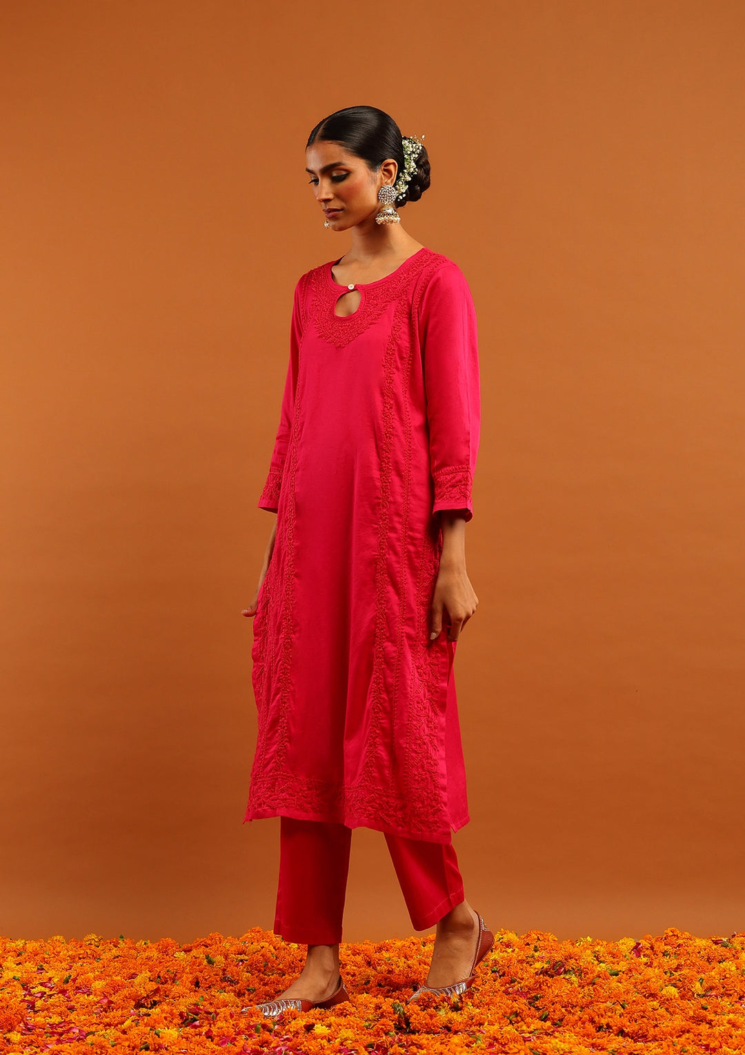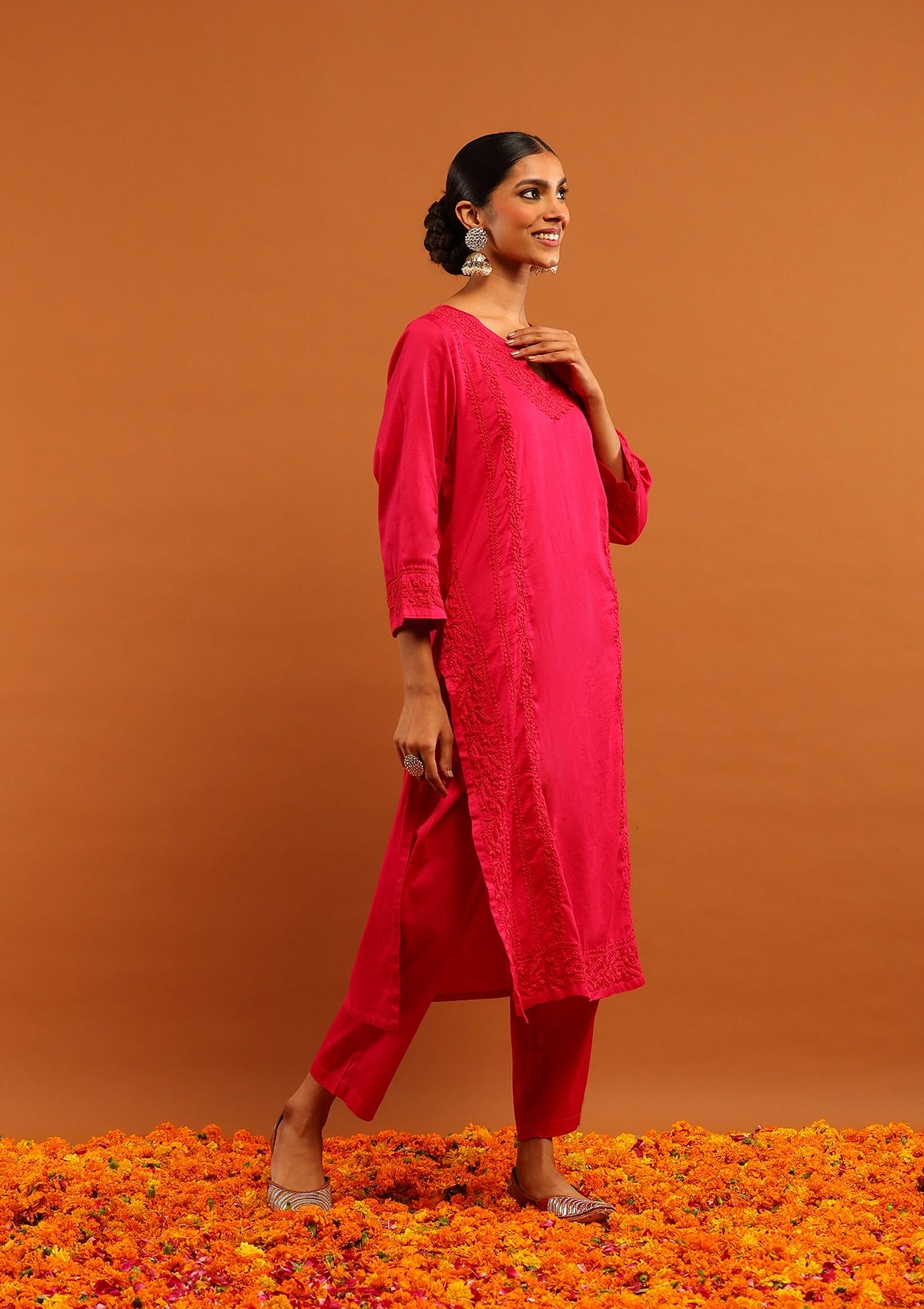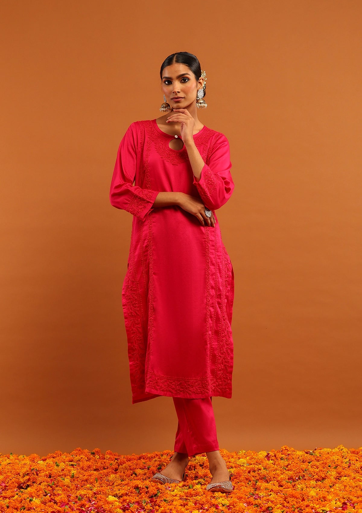 Karisma Jaam Silk Chikankari Solid Women's 2 PC Long Kurta Set - Magenta