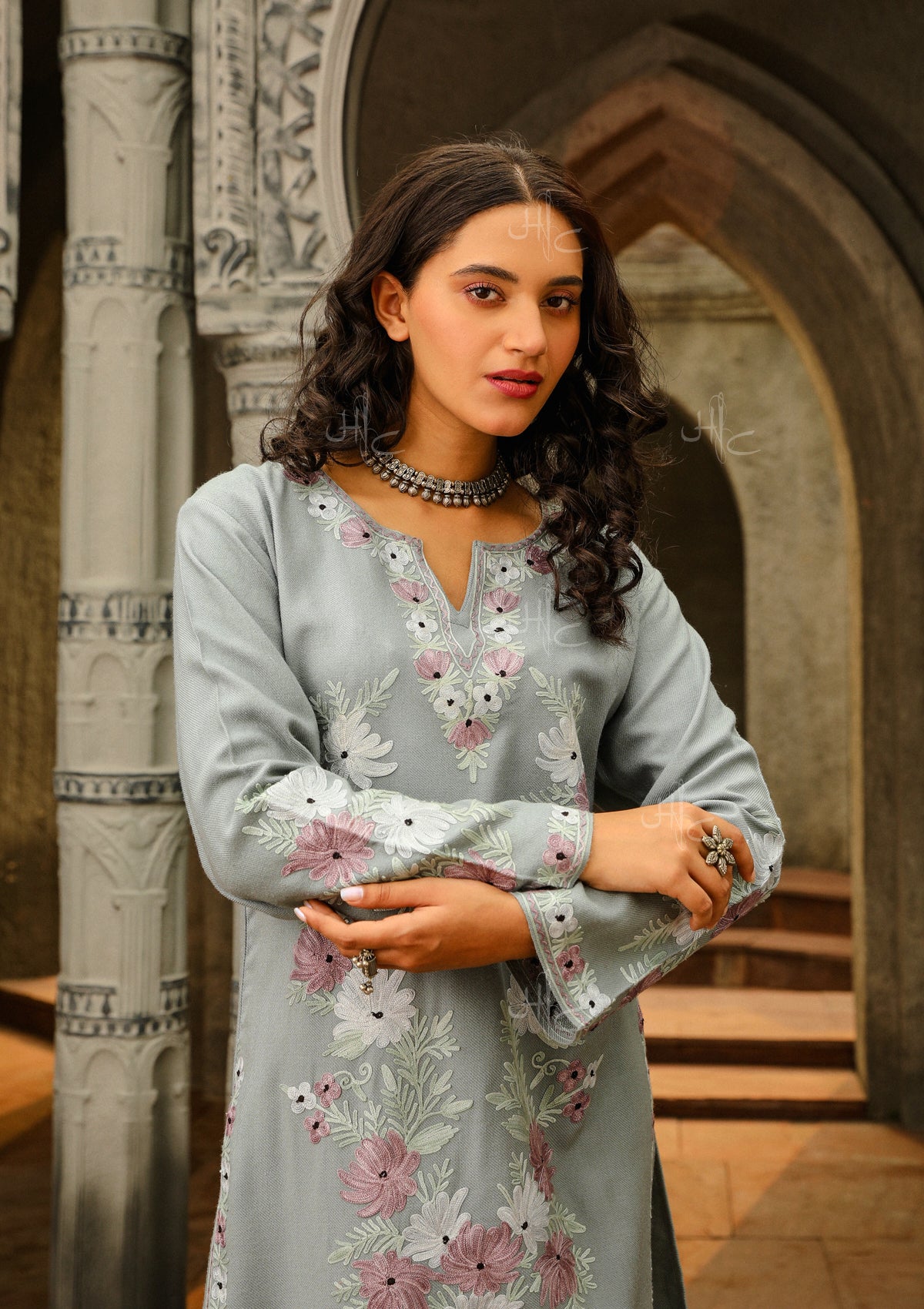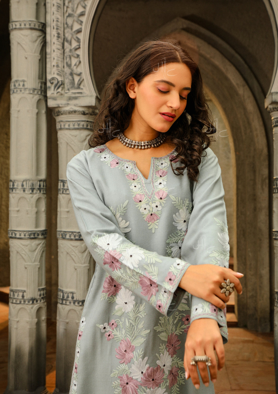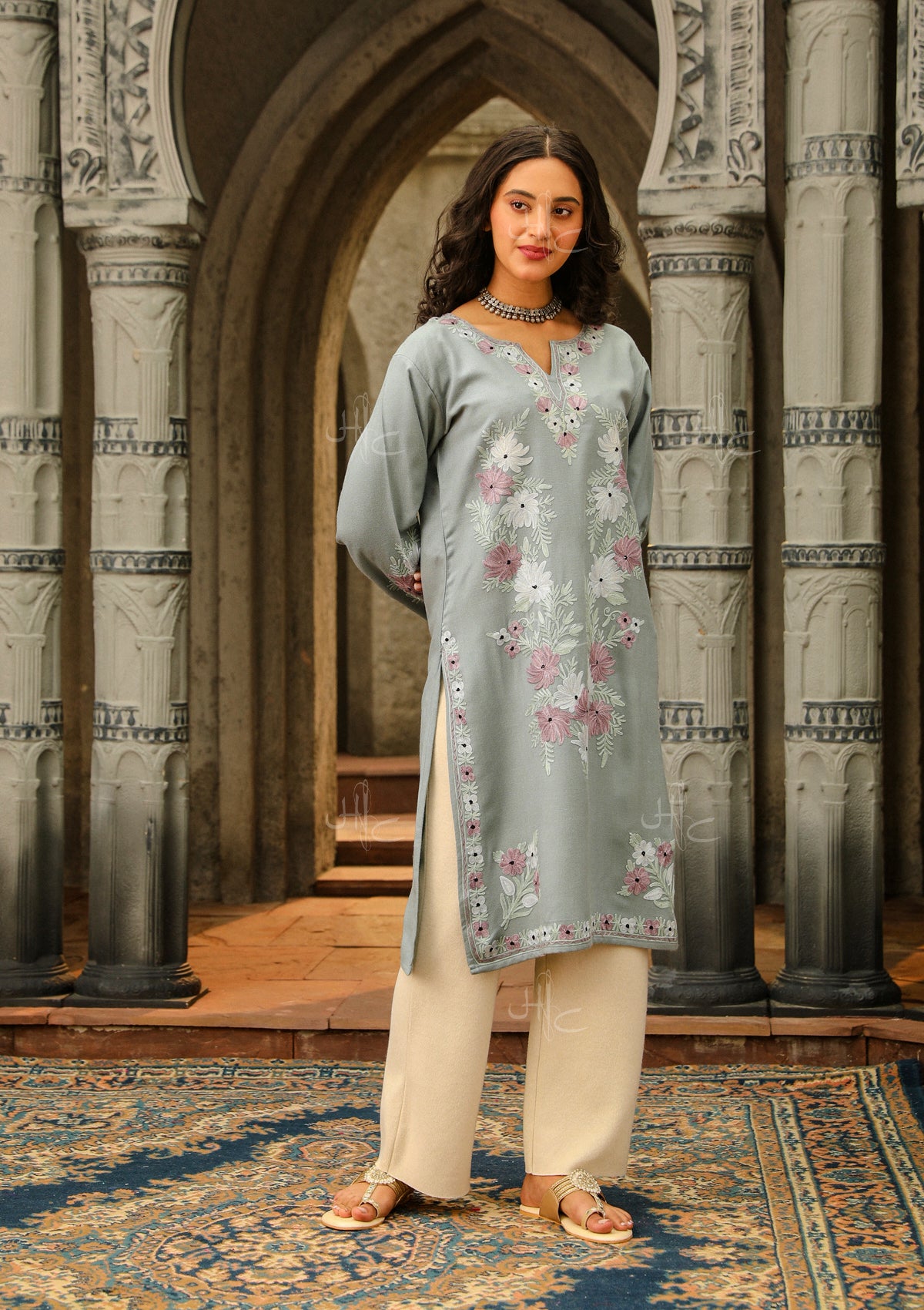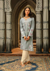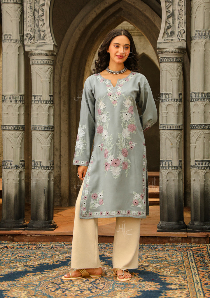 HOC Kasmira Aari Embroidered Wool Straight Kurta-Grey
