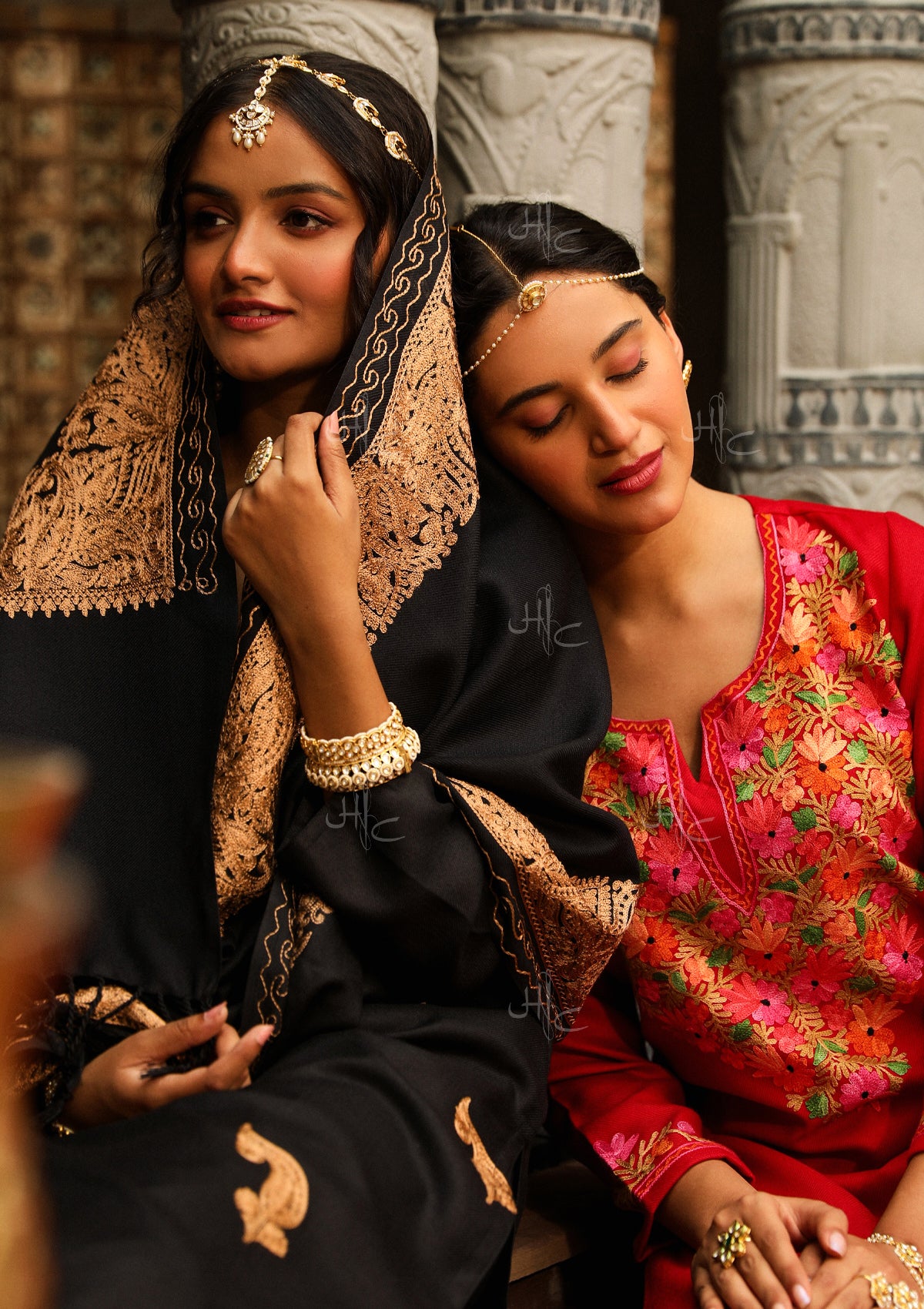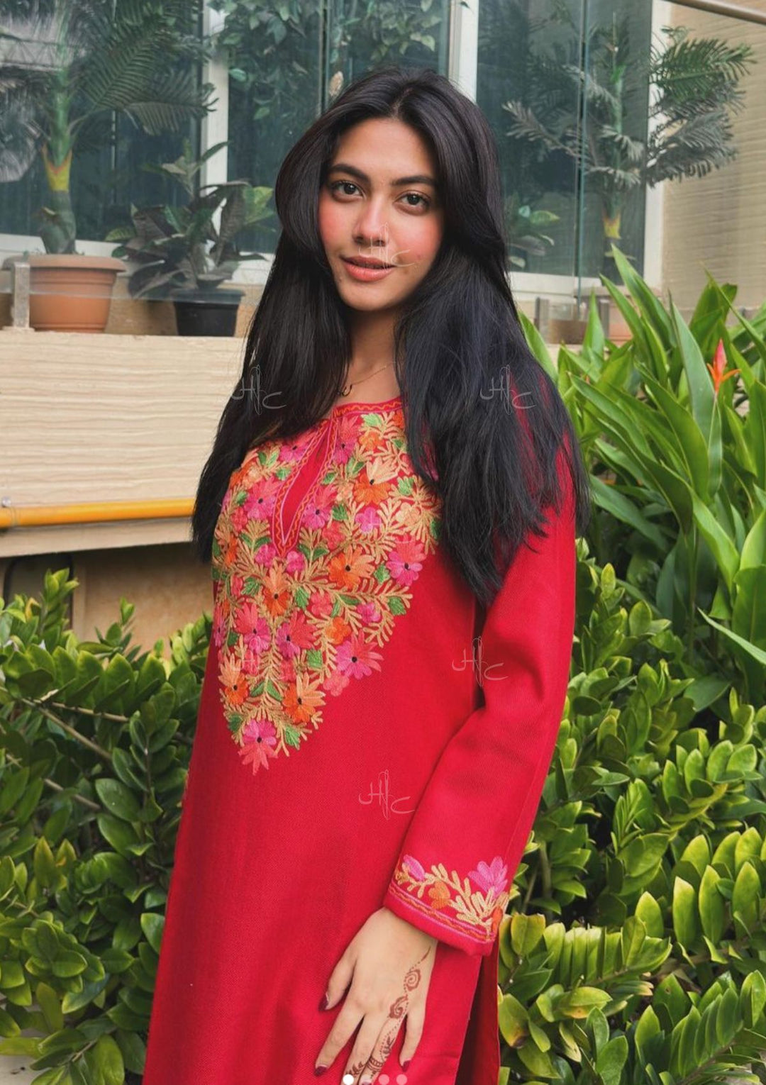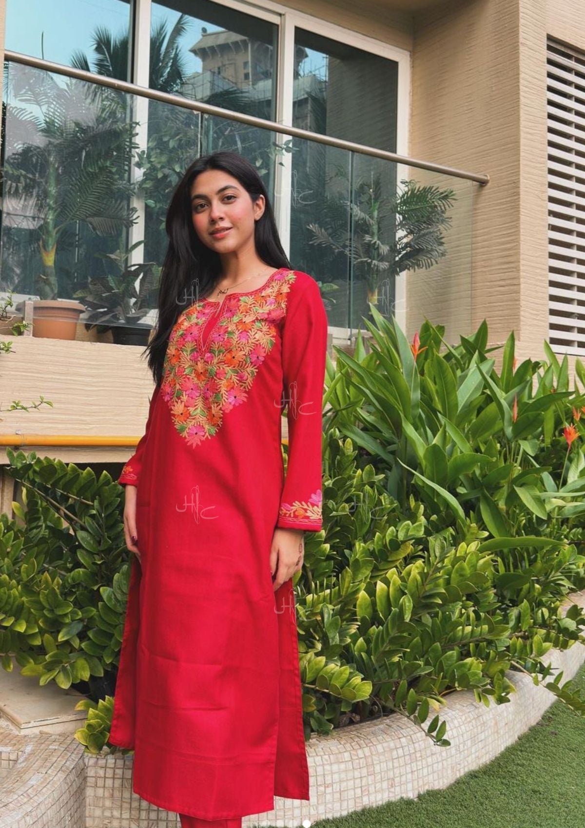 HOC Kasmira Aari Embroidered Wool Straight Kurta Set-Red