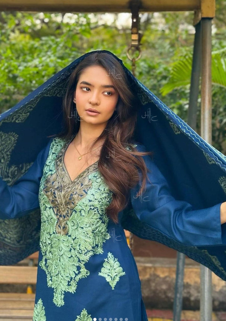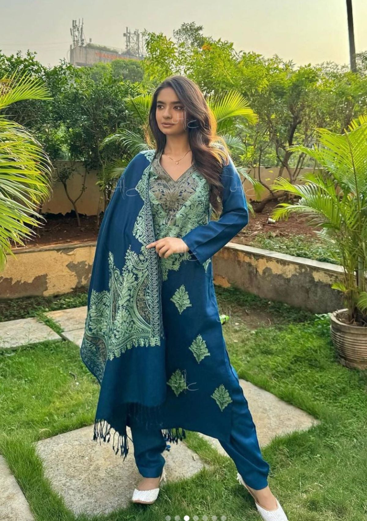 HOC Kashmiri Wool Aari Embroidered Straight Kurta Set with Dupatta-Blue