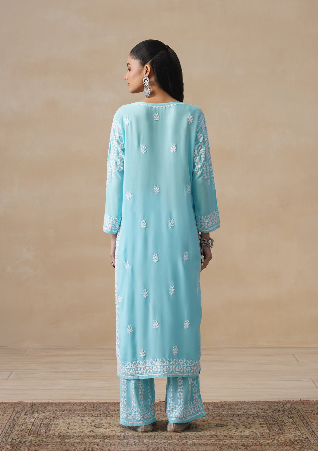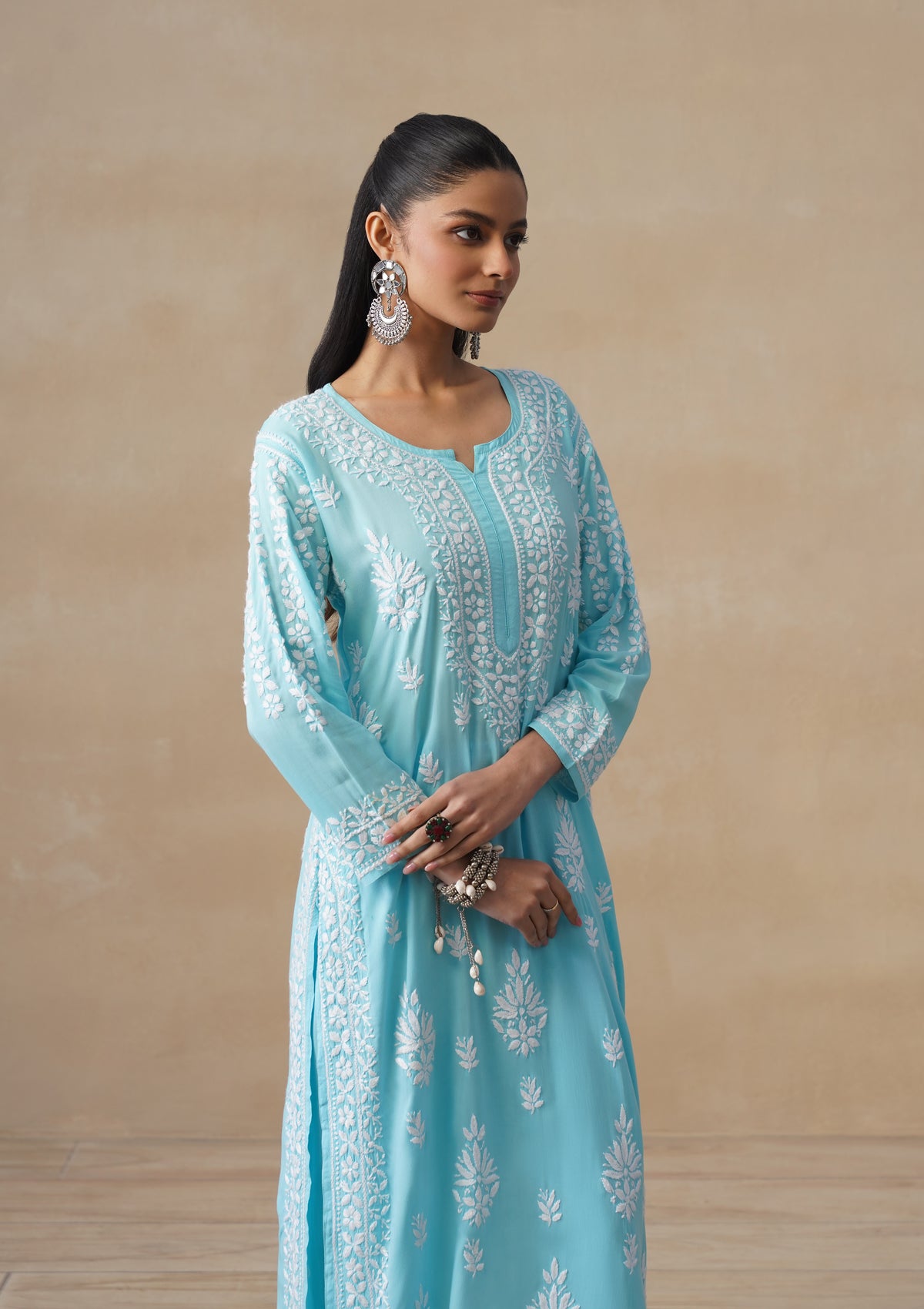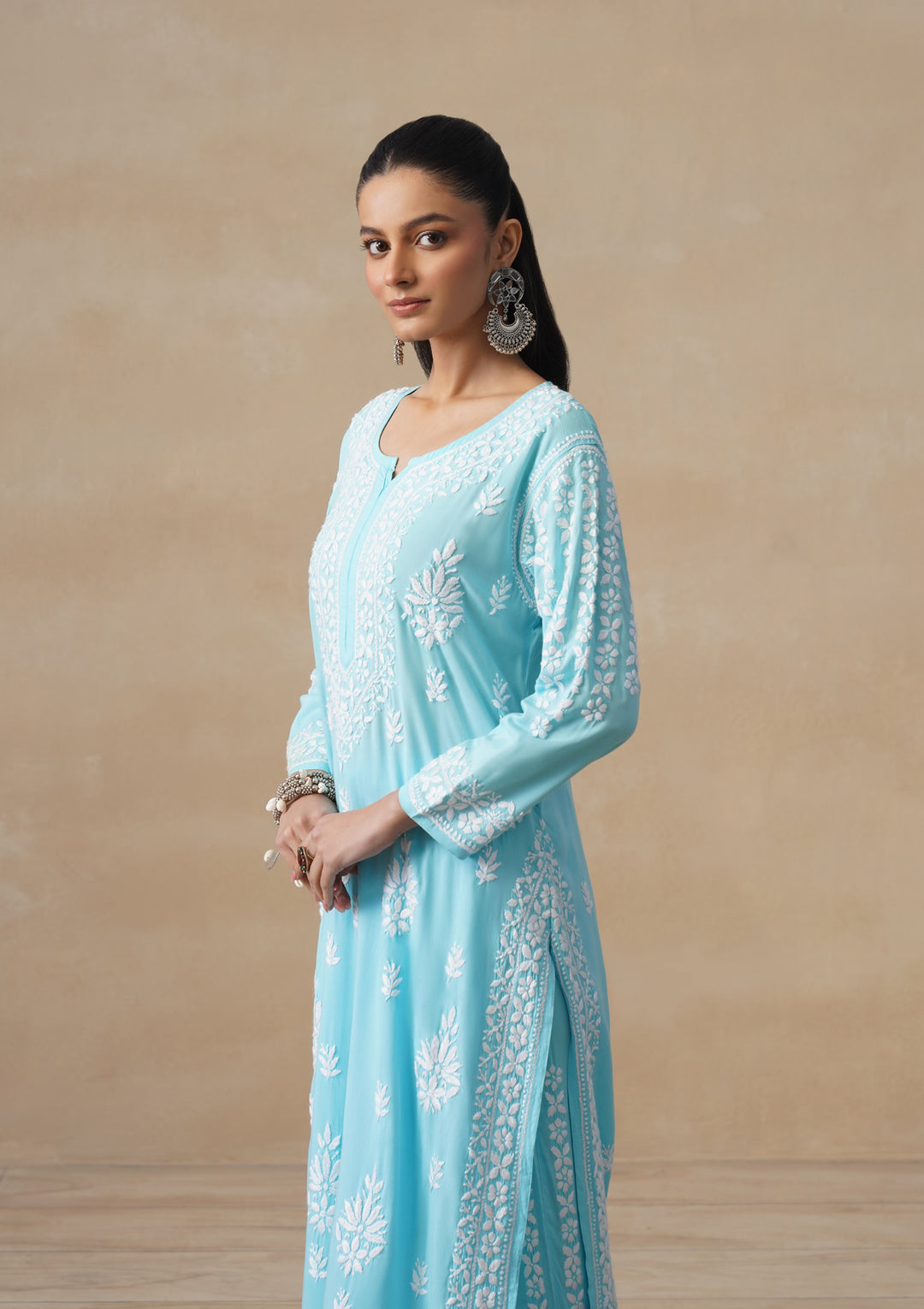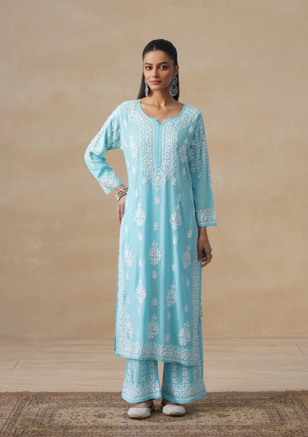 HOC Modal Chikankari Solid Women's 2 PC Long Kurta Set - Light Blue