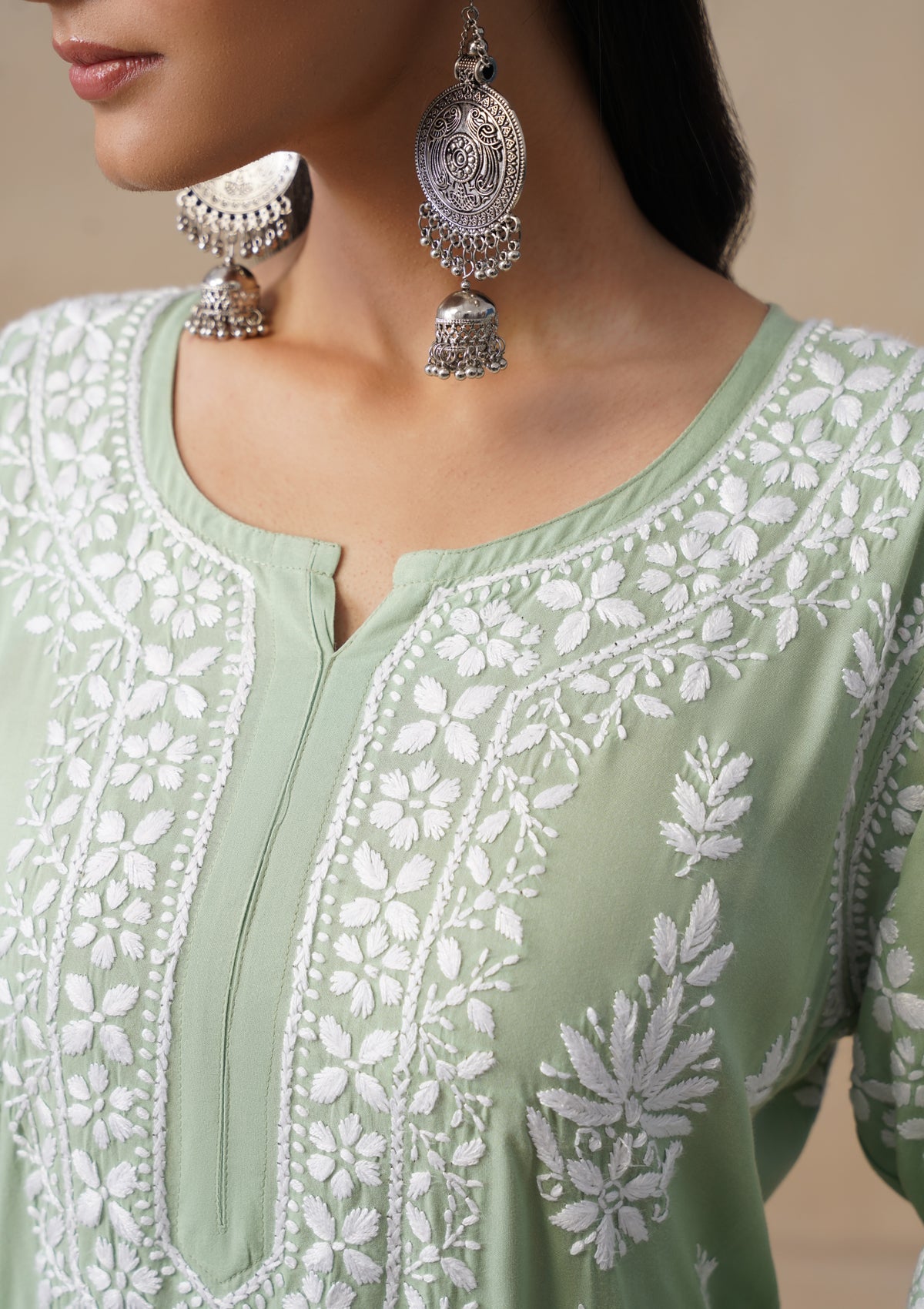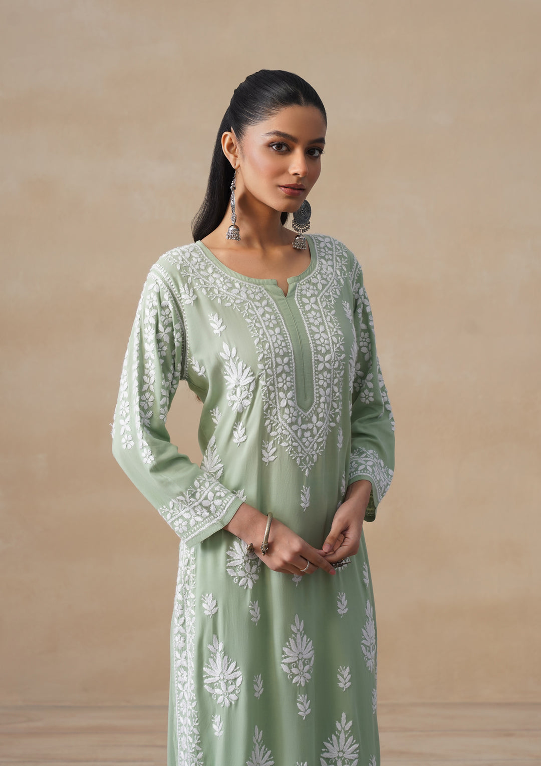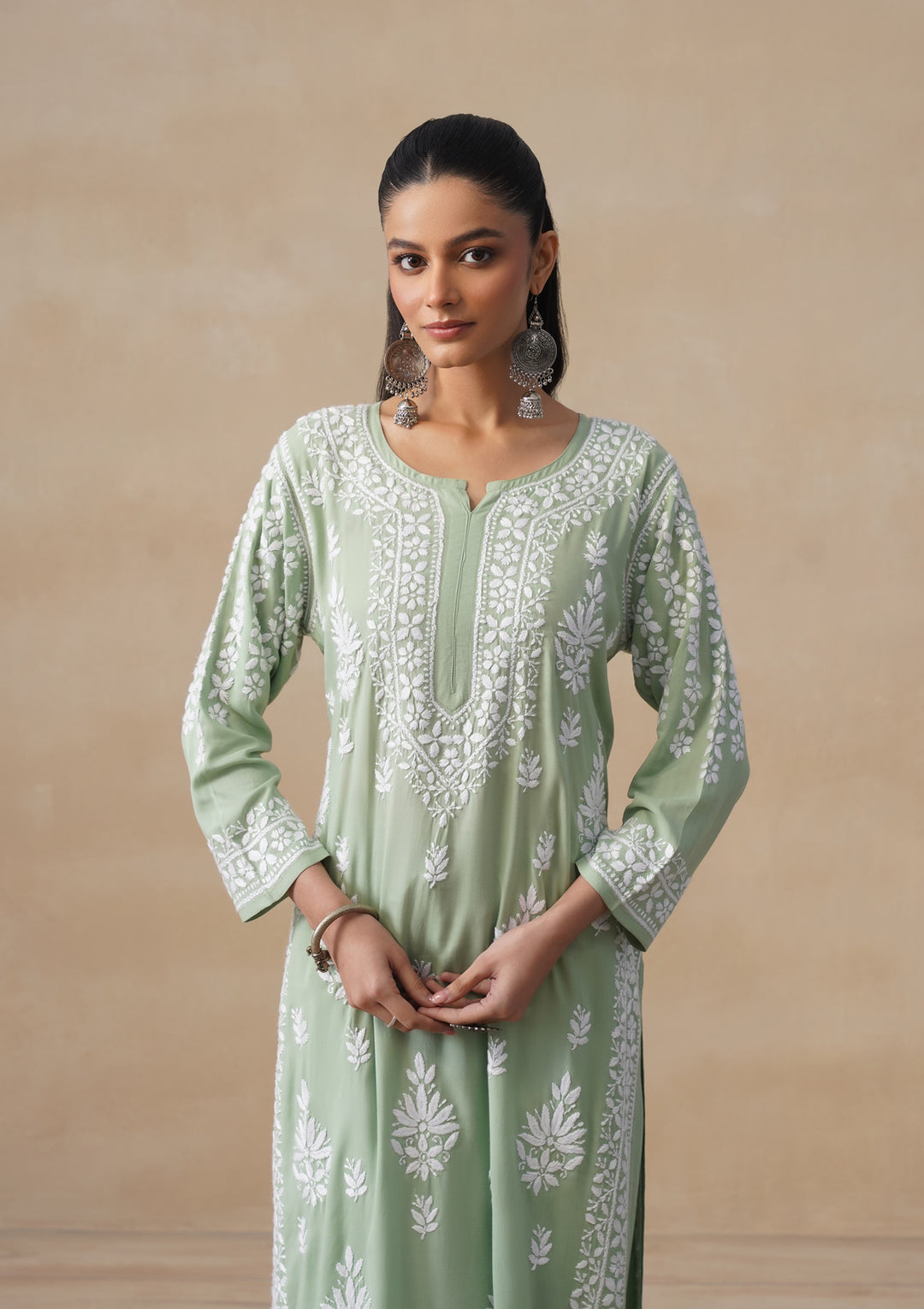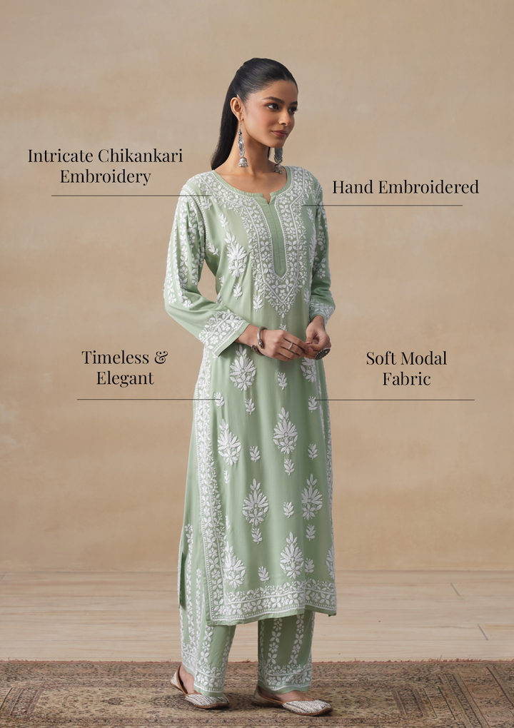 HOC Modal Chikankari Solid Women's 2 PC Long Kurta Set - Light Green
