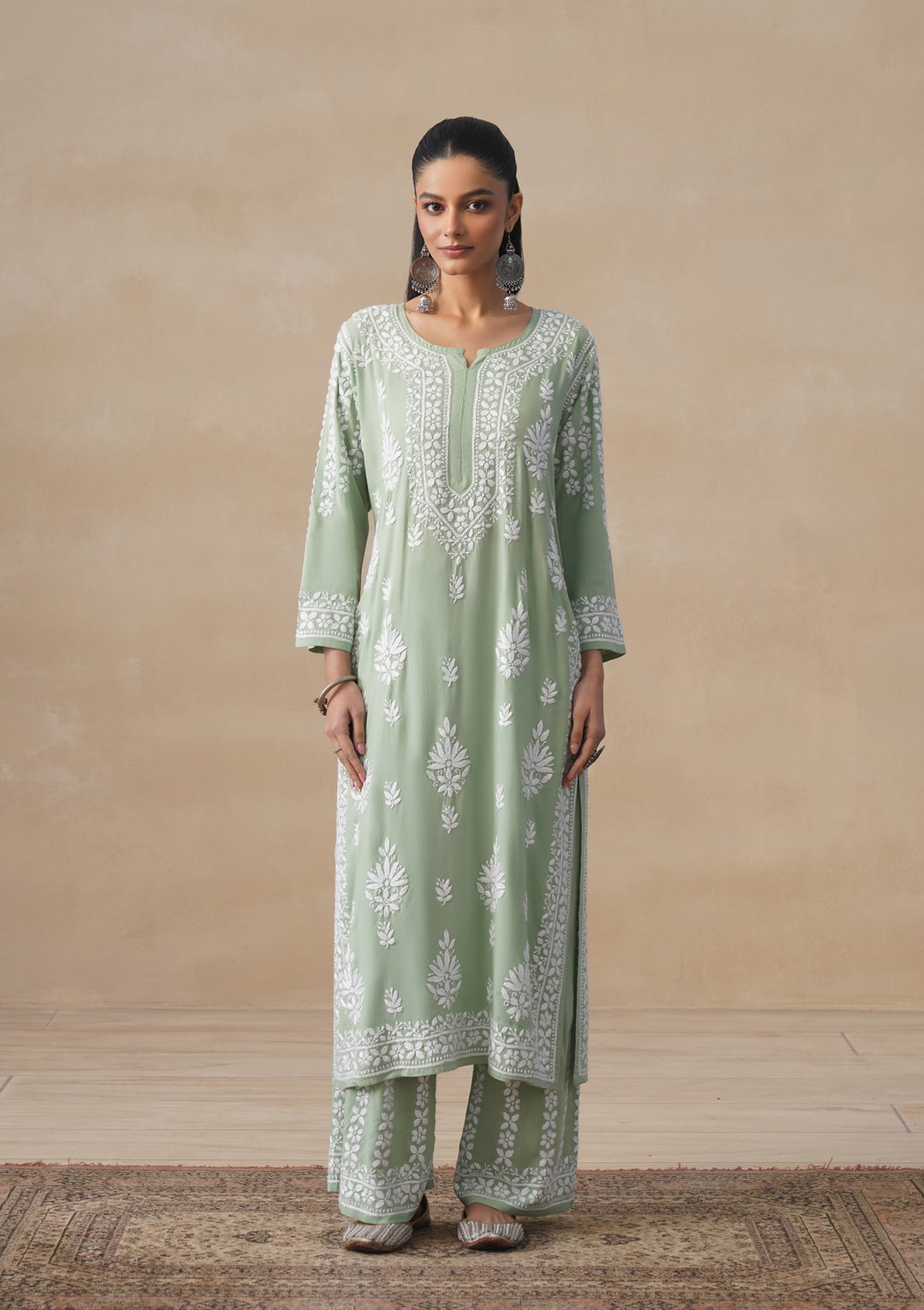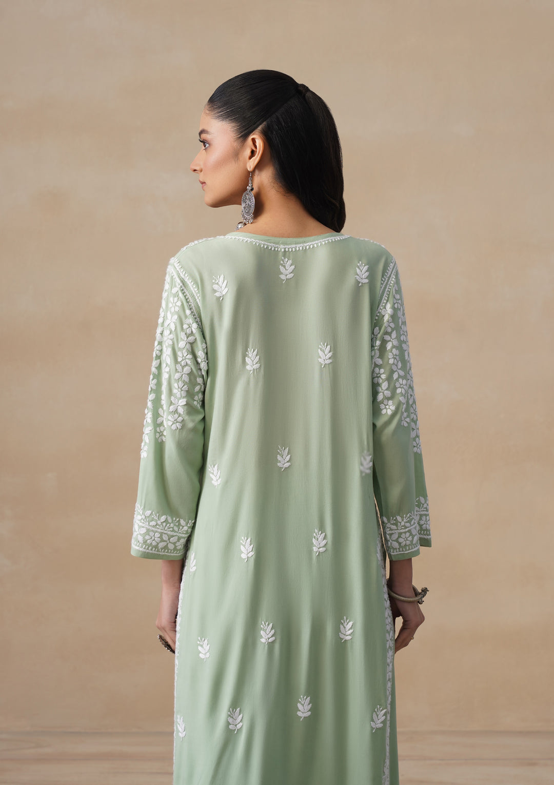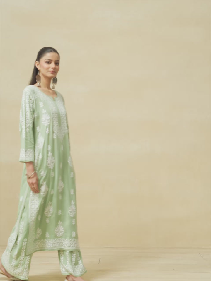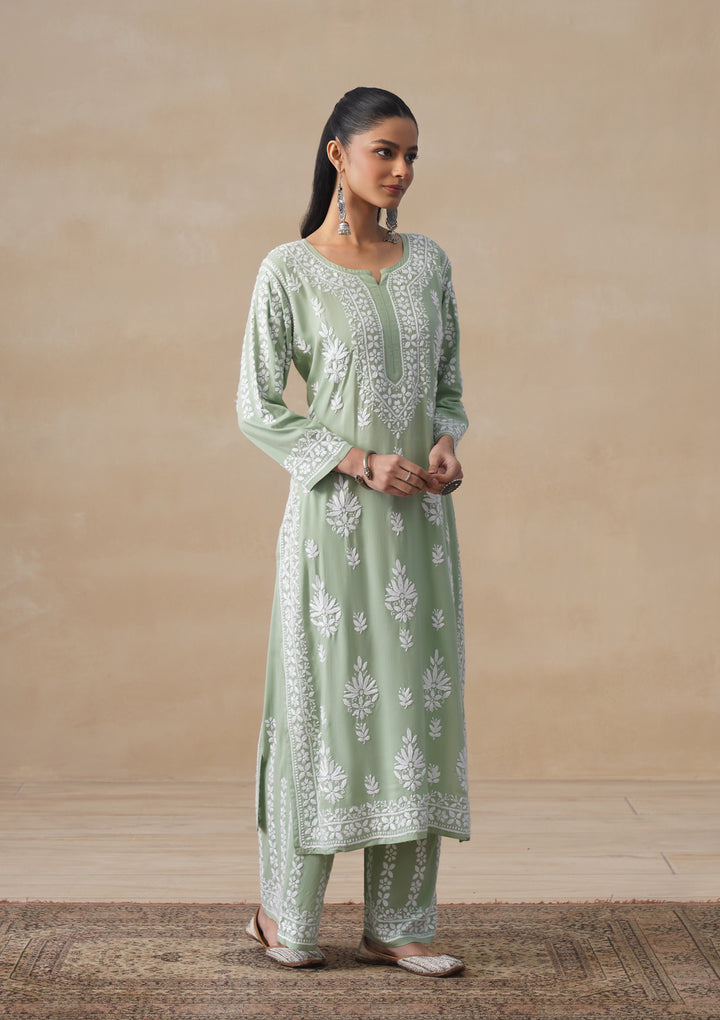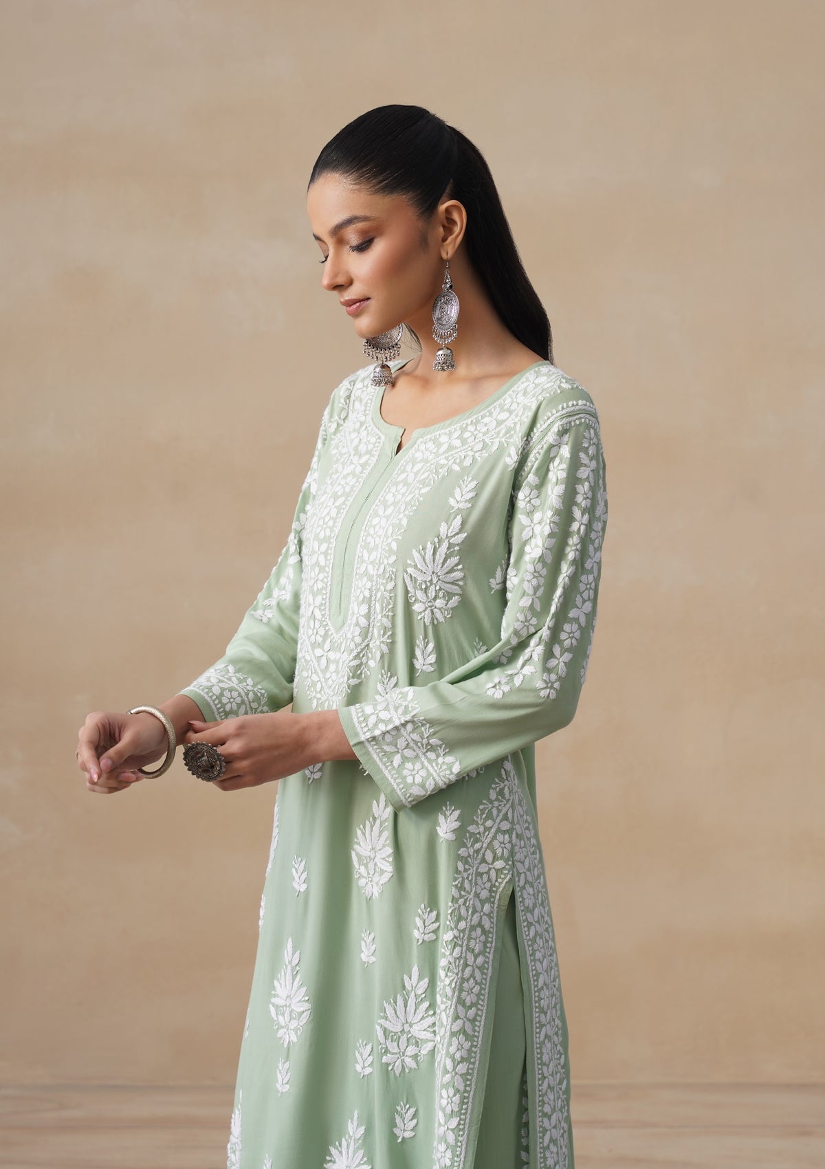 HOC Modal Chikankari Solid Women's 2 PC Long Kurta Set - Light Green