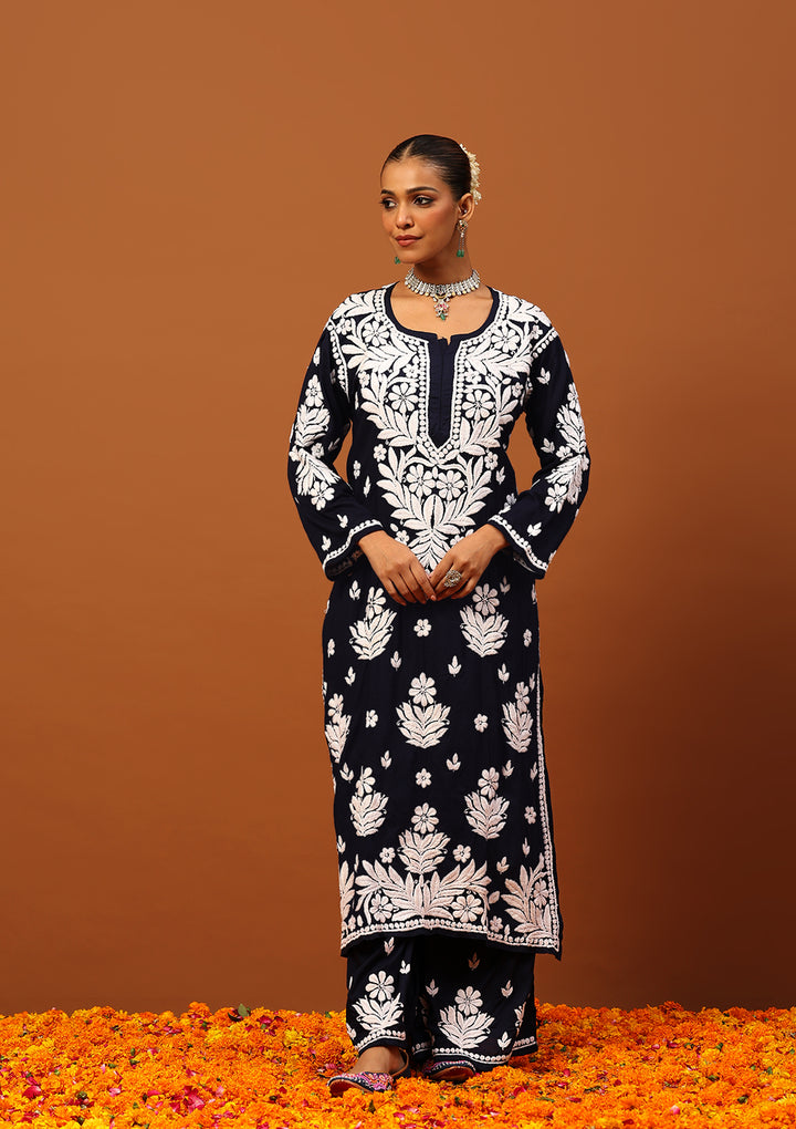 HOC Modal Chikankari Solid Women's 2 PC Long Kurta Set -Navy Blue
