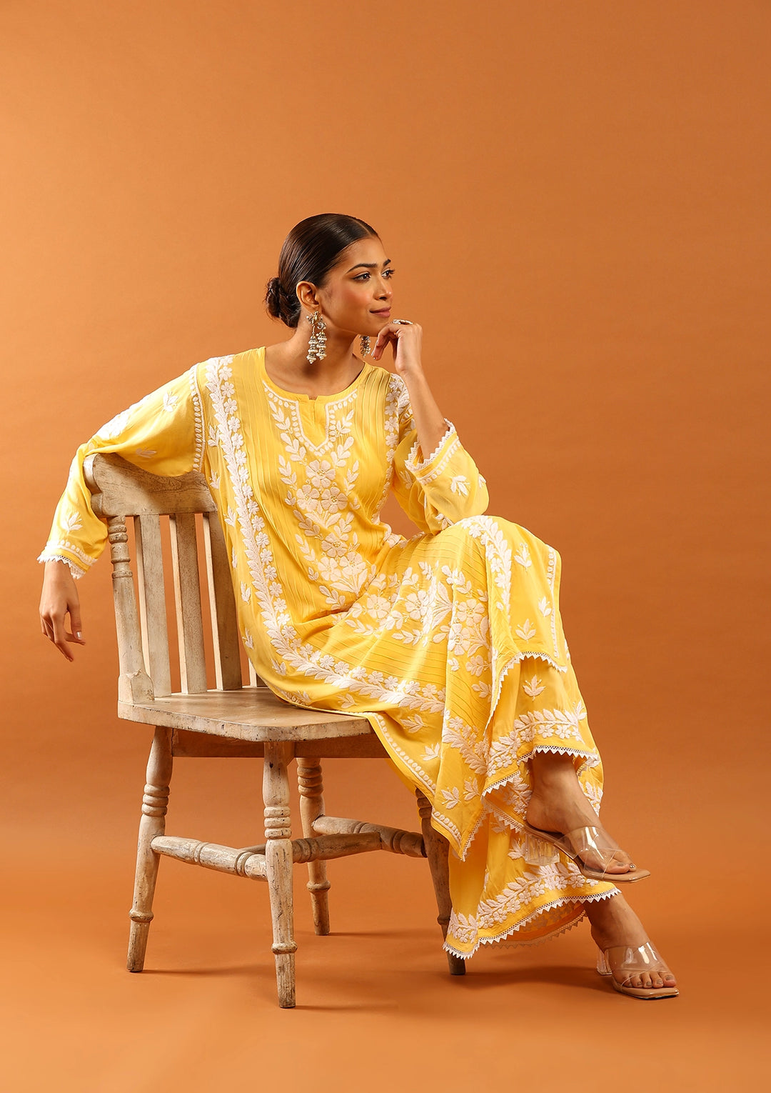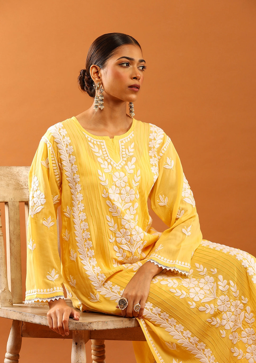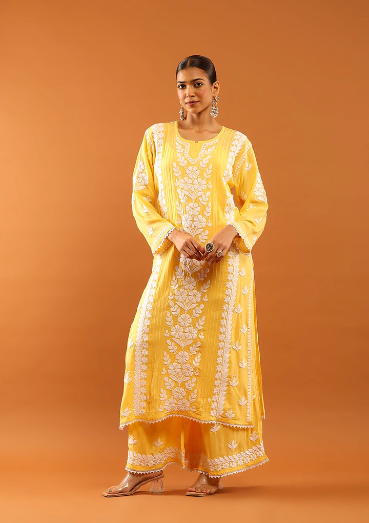 HOC Modal Chikankari Solid Women's 2 PC Long Kurta Set With Lace -Yellow