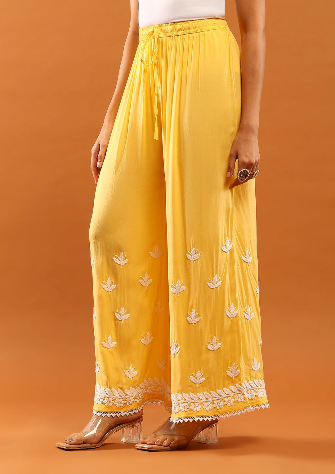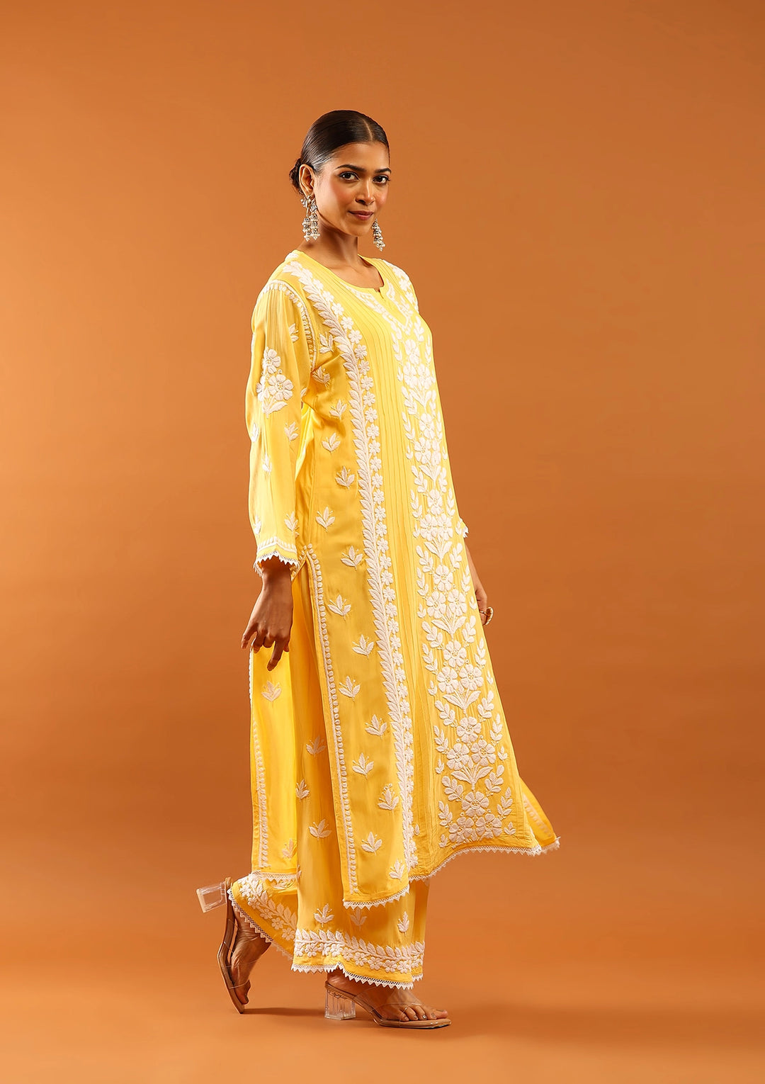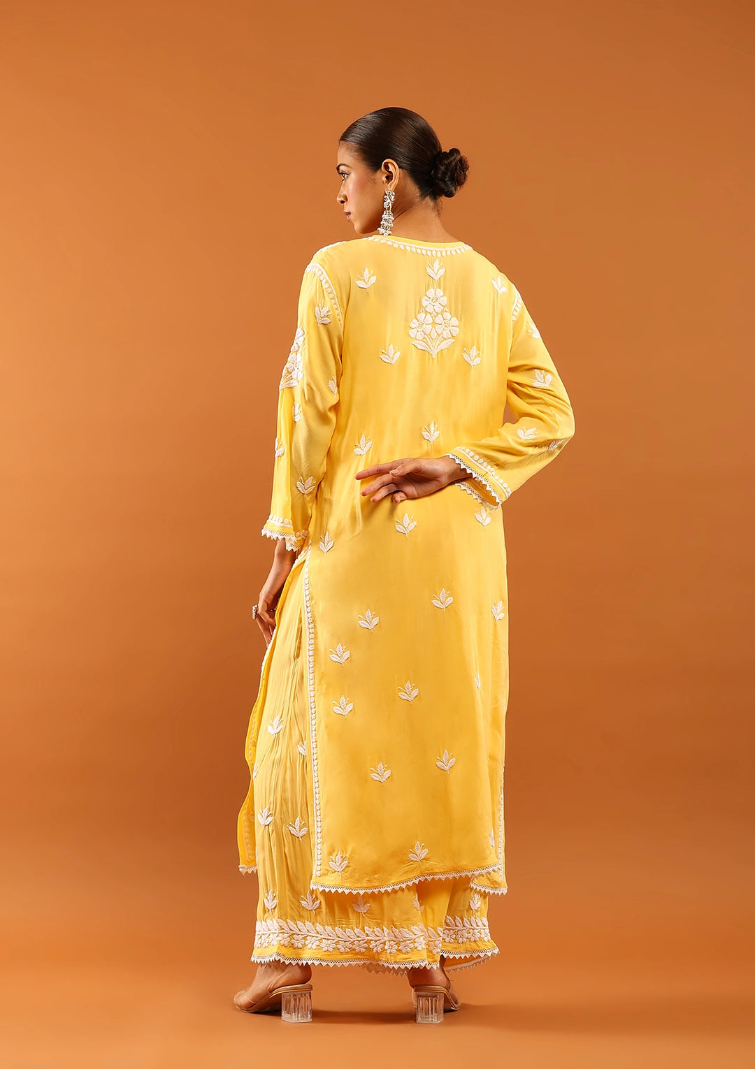 HOC Modal Chikankari Solid Women's 2 PC Long Kurta Set With Lace -Yellow
