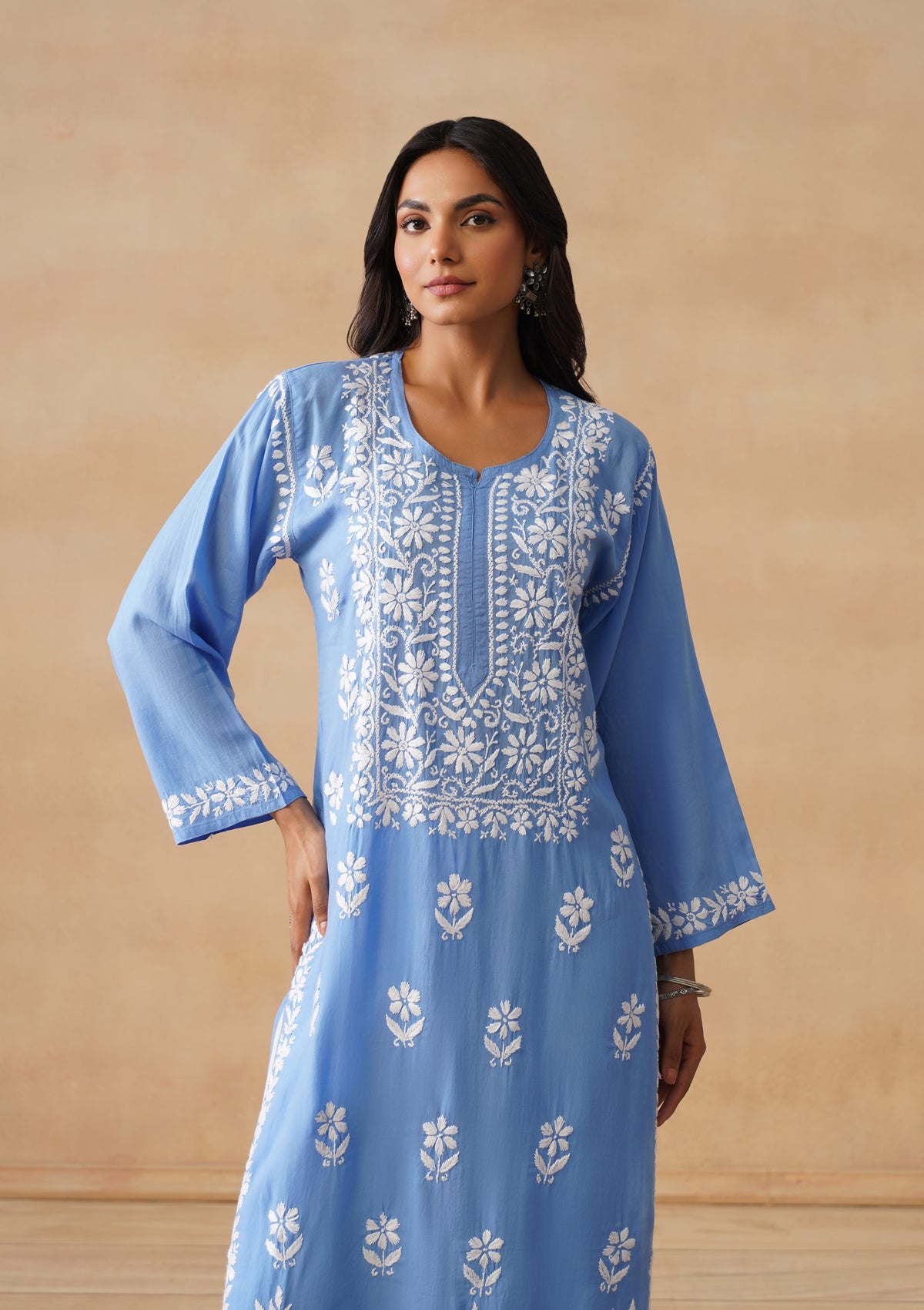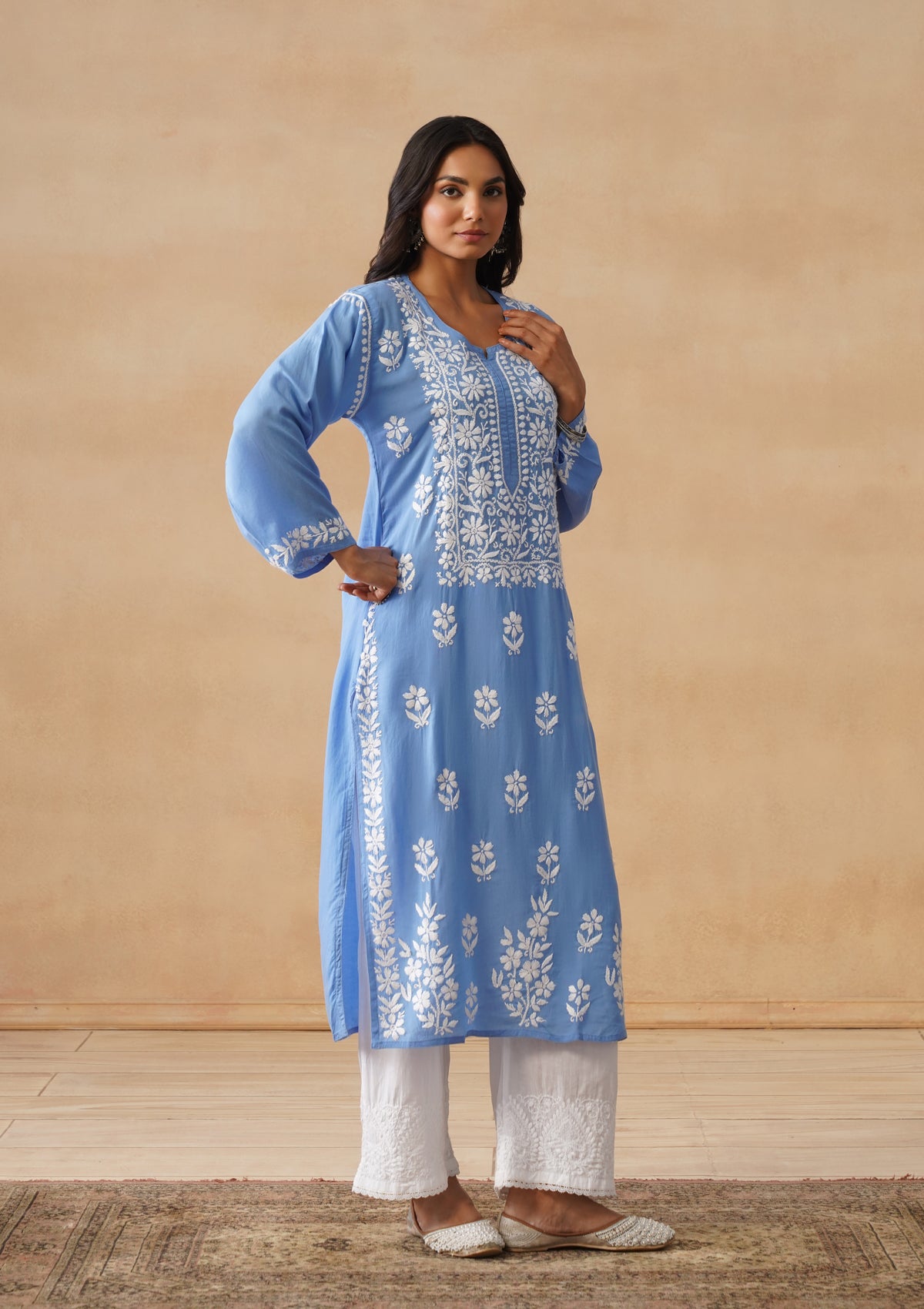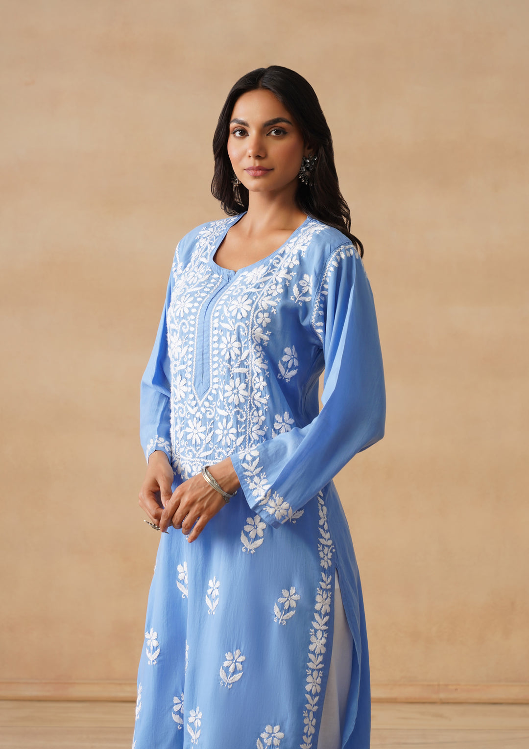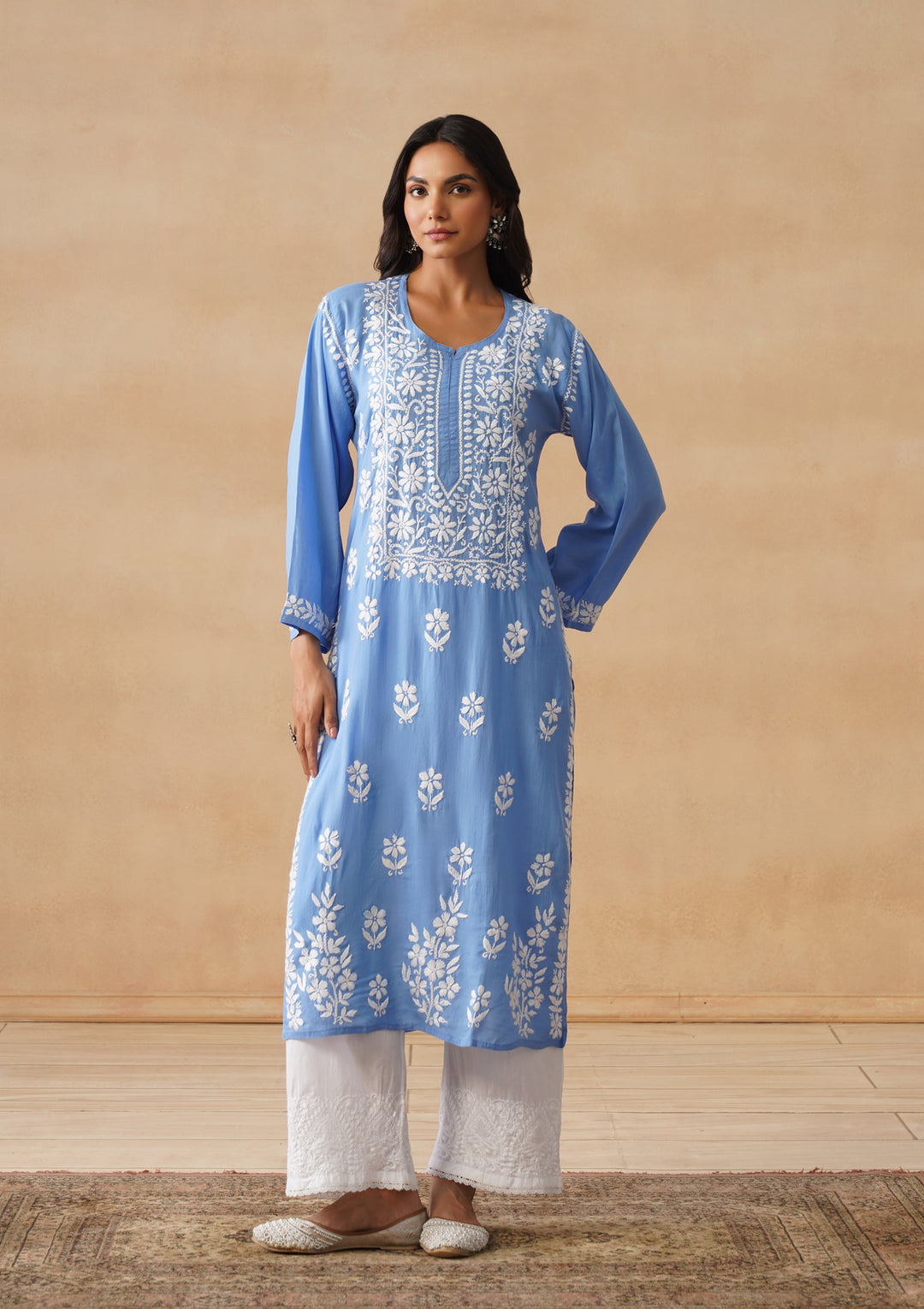HOC Modal Chikankari Solid Women's Long Kurta - Blue