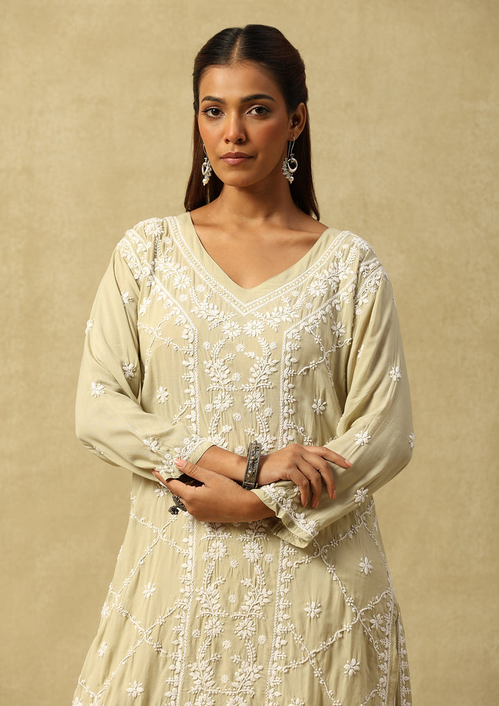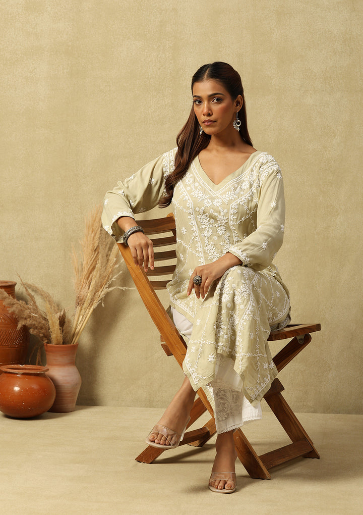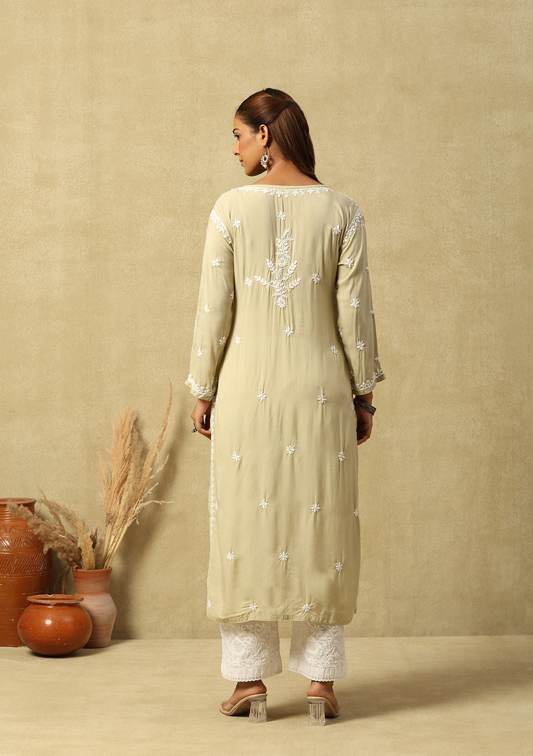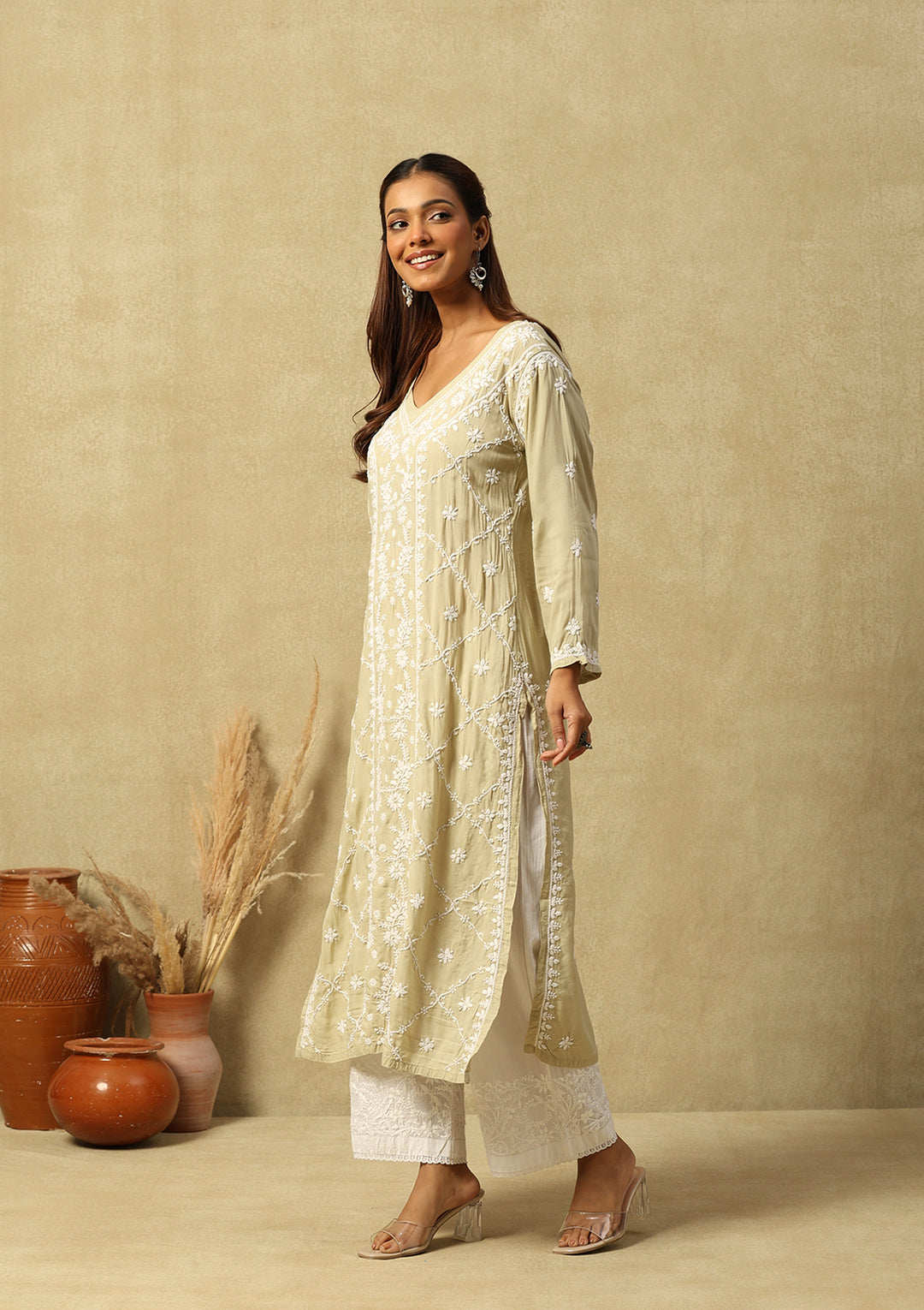 HOC Modal Chikankari Solid Women's Long Kurta - Light Green