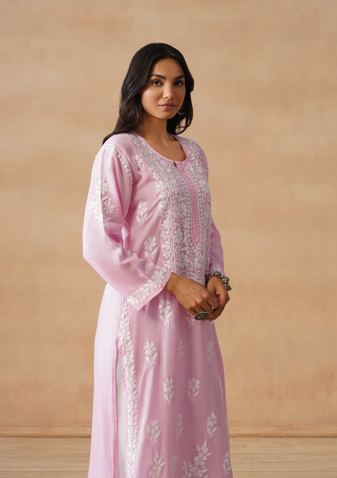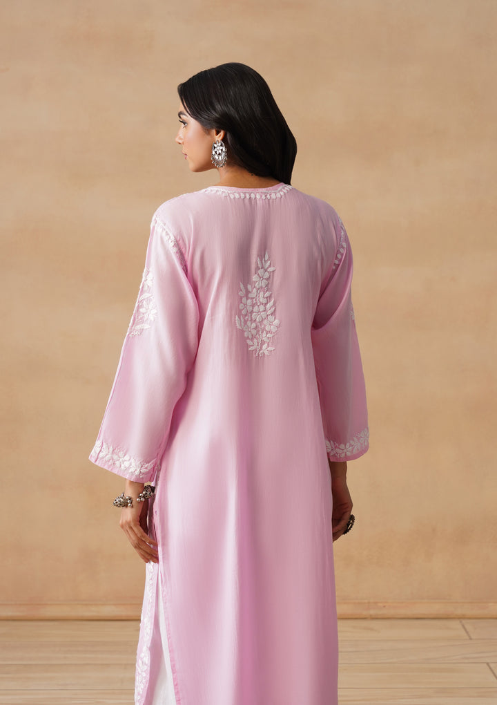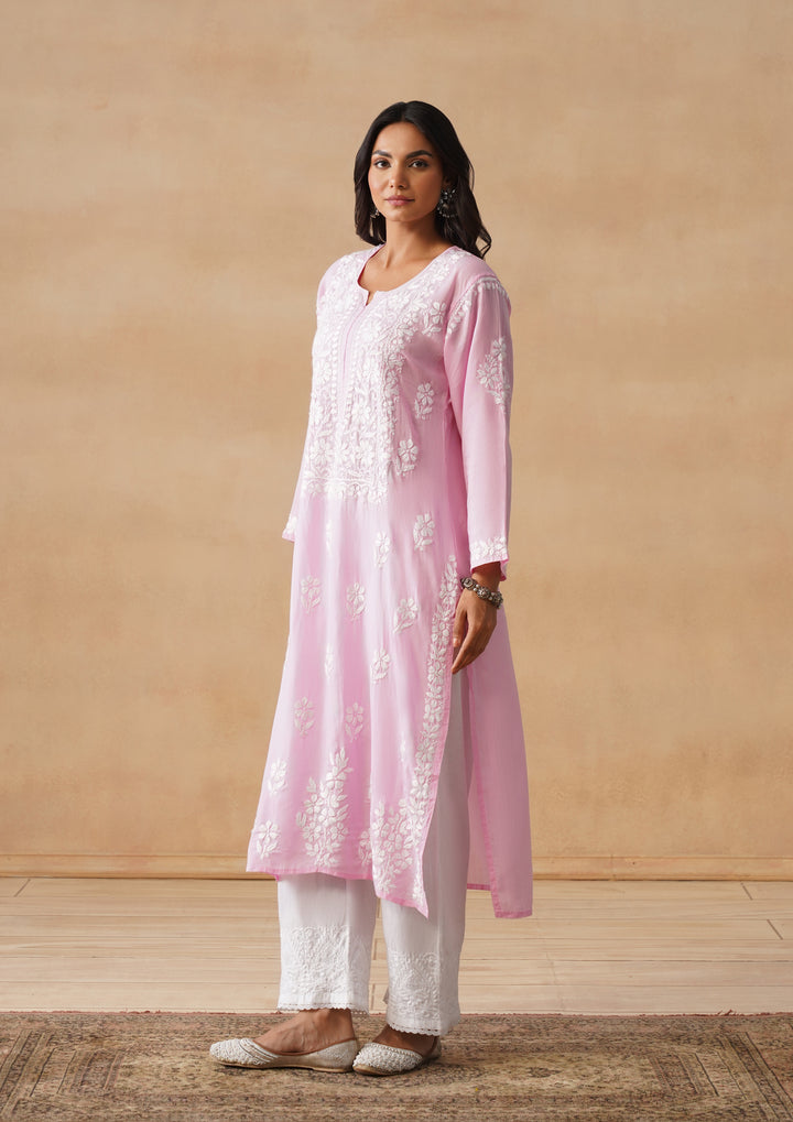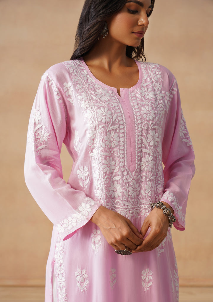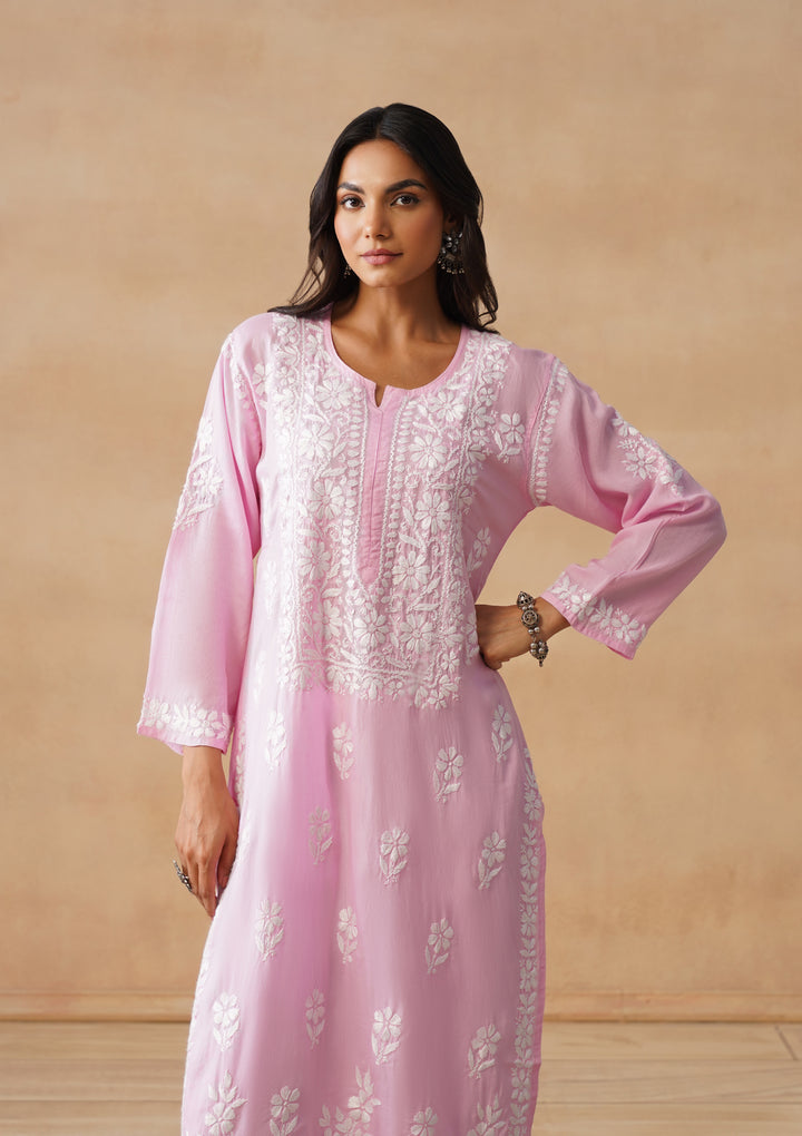 HOC Modal Chikankari Solid Women's Long Kurta - Pink