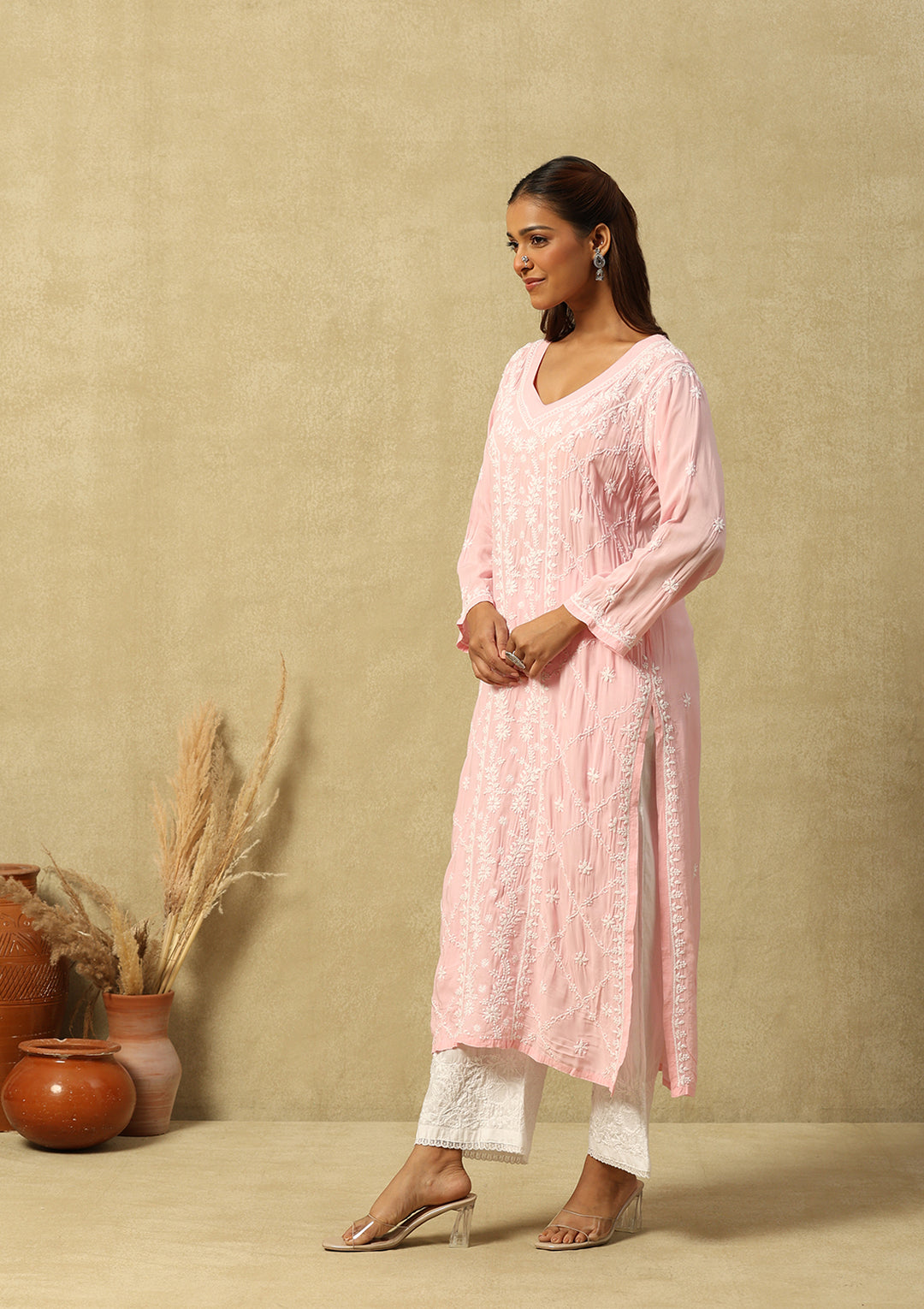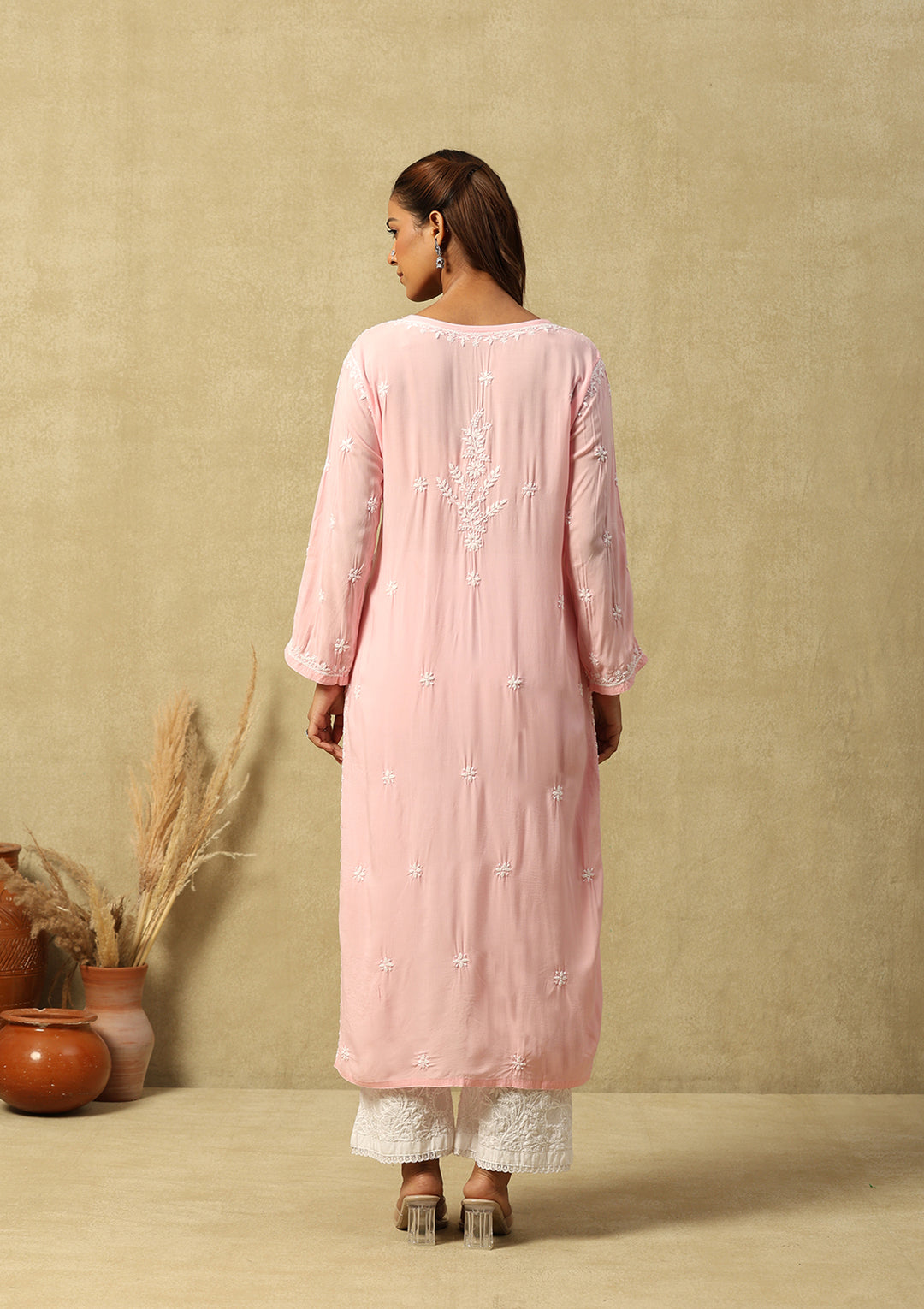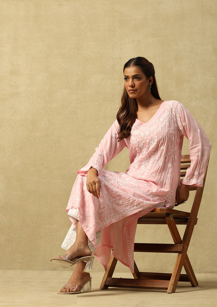 HOC Modal Chikankari Solid Women's Long Kurta -Pink
