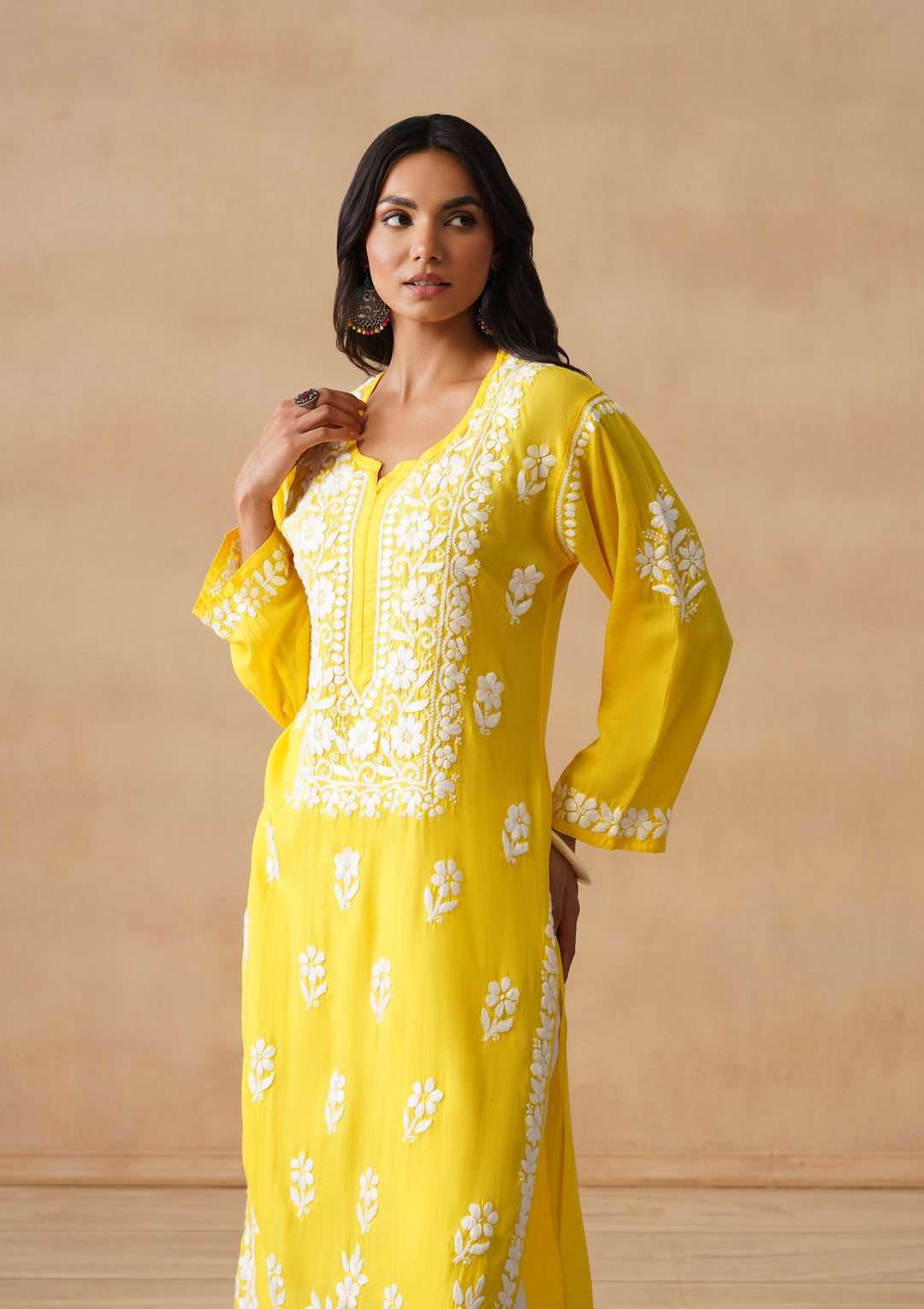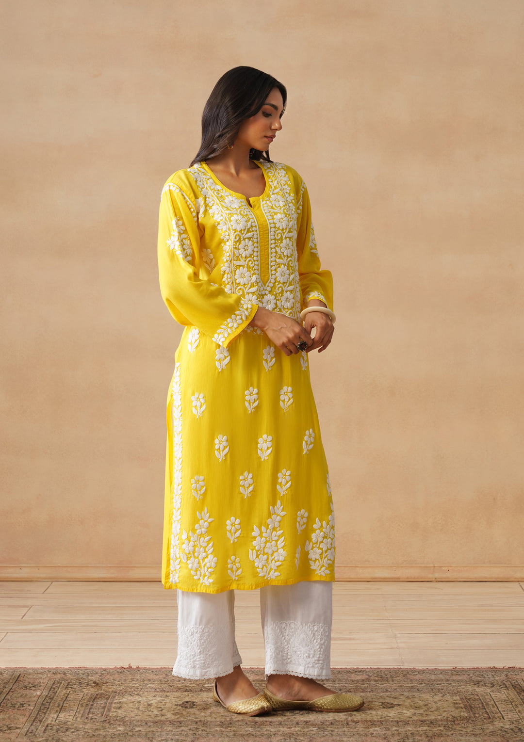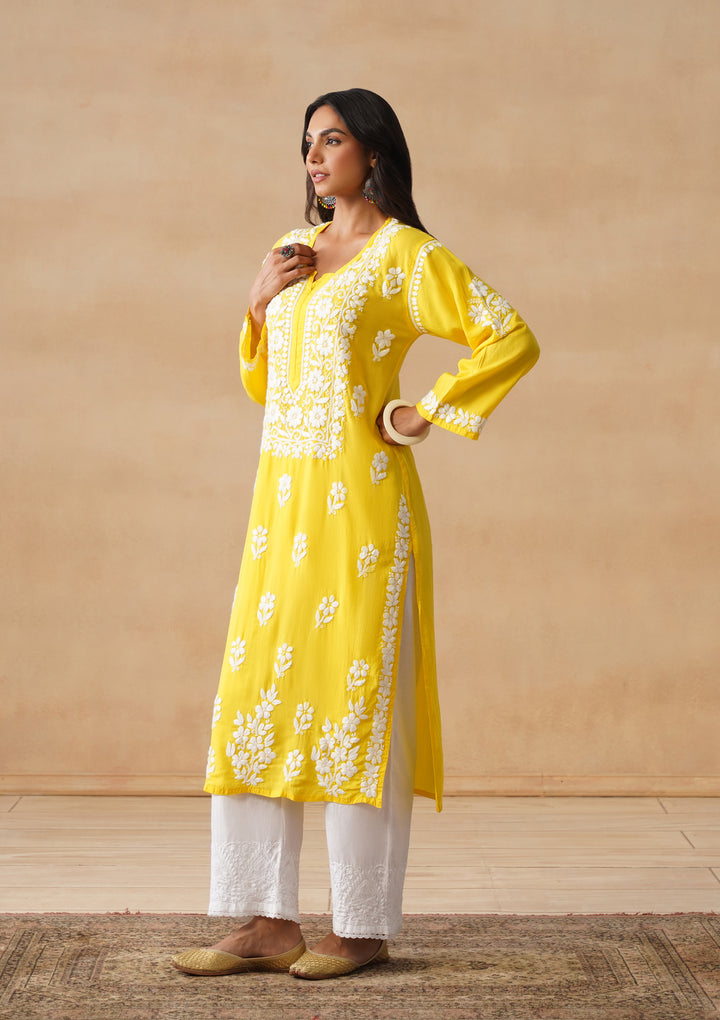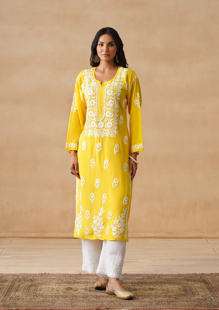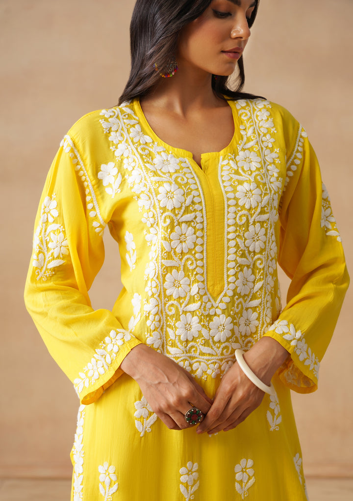 HOC Modal Chikankari Solid Women's Long Kurta - Yellow