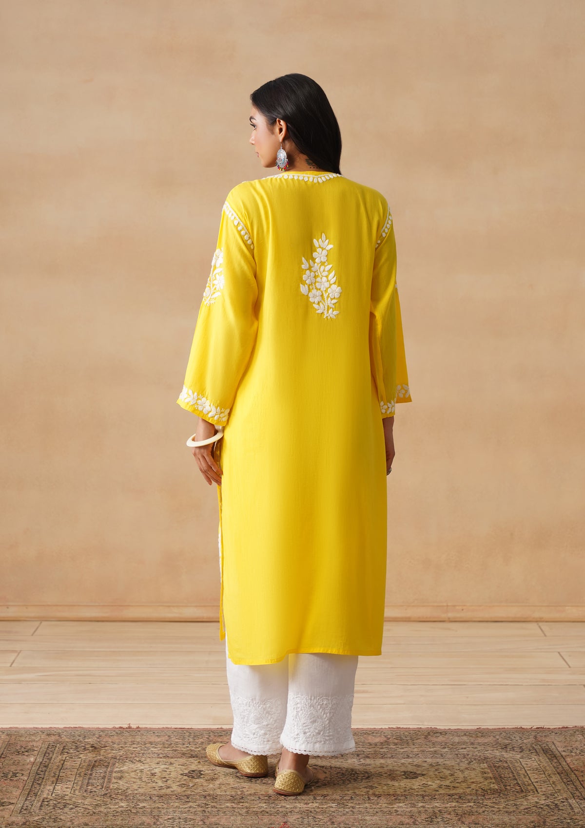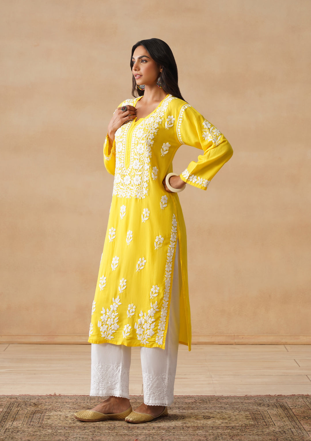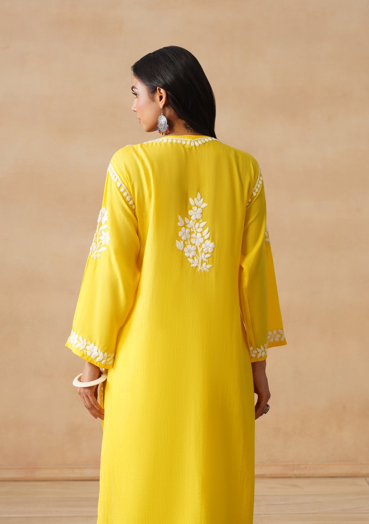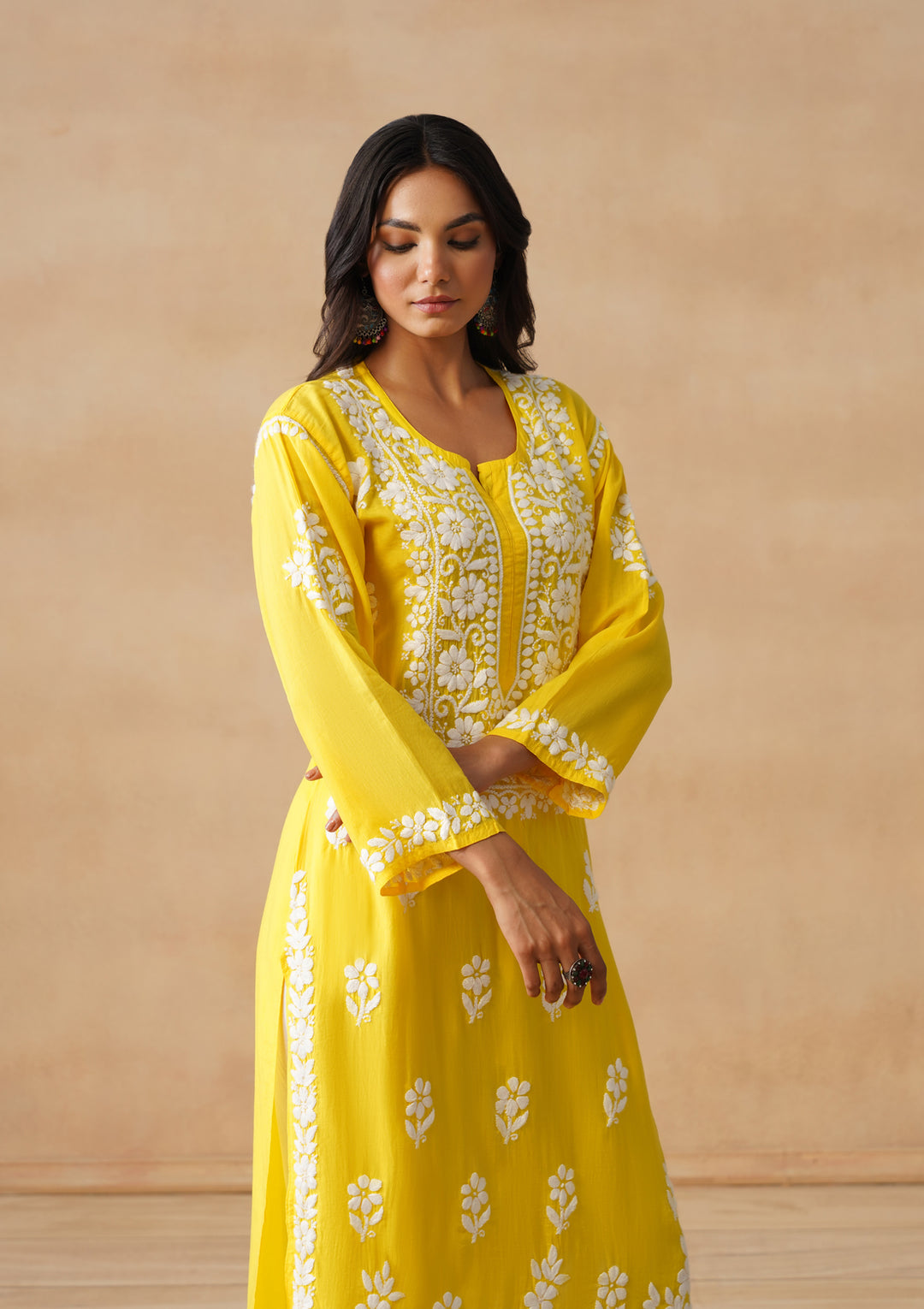 HOC Modal Chikankari Solid Women's Long Kurta - Yellow