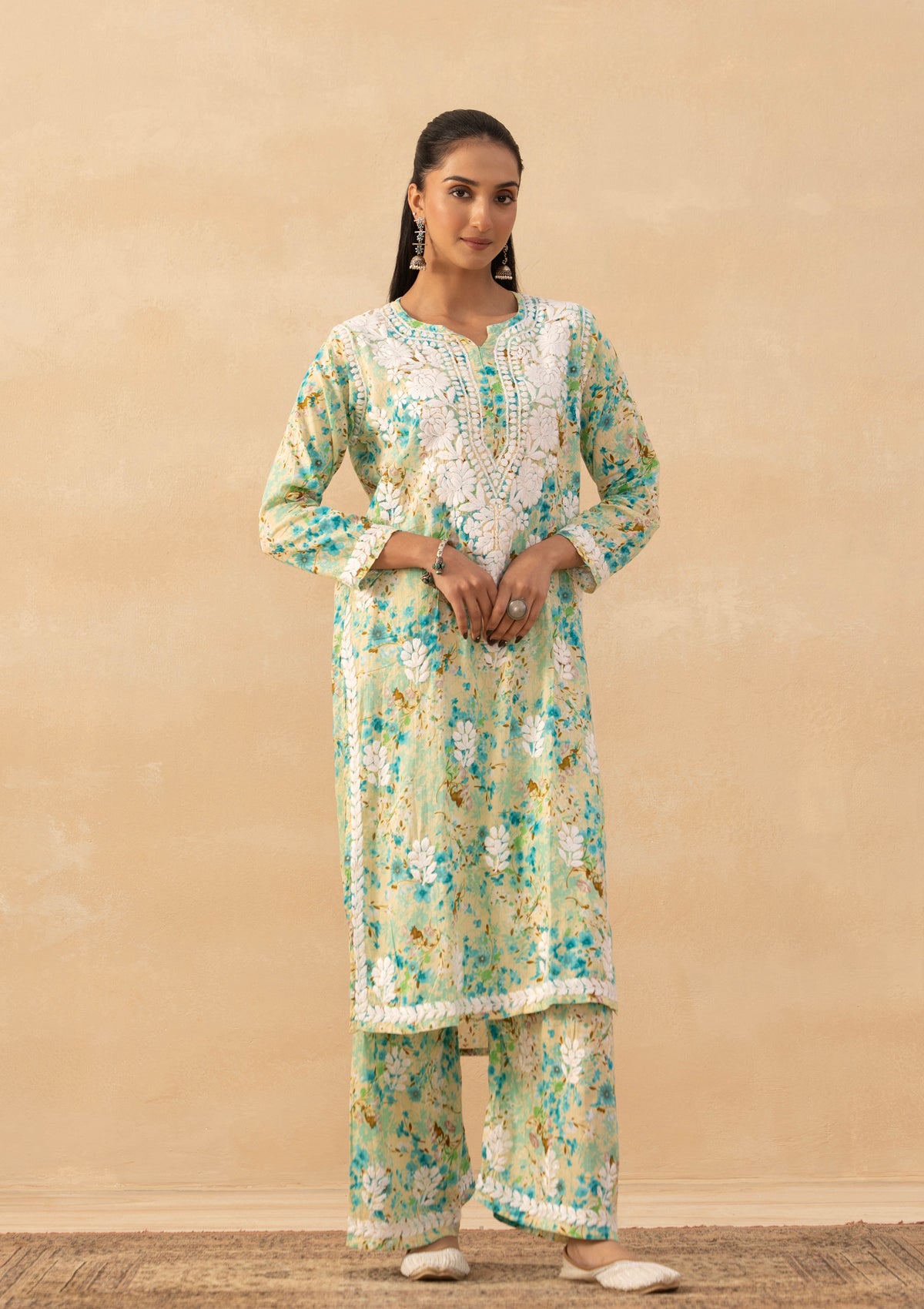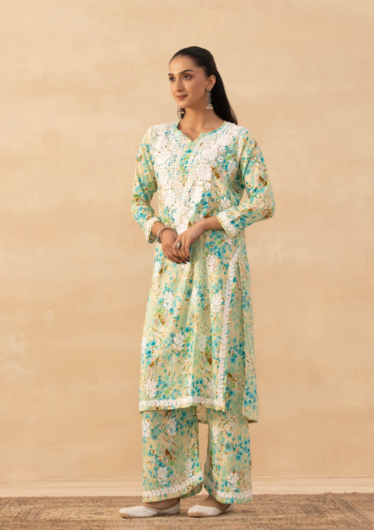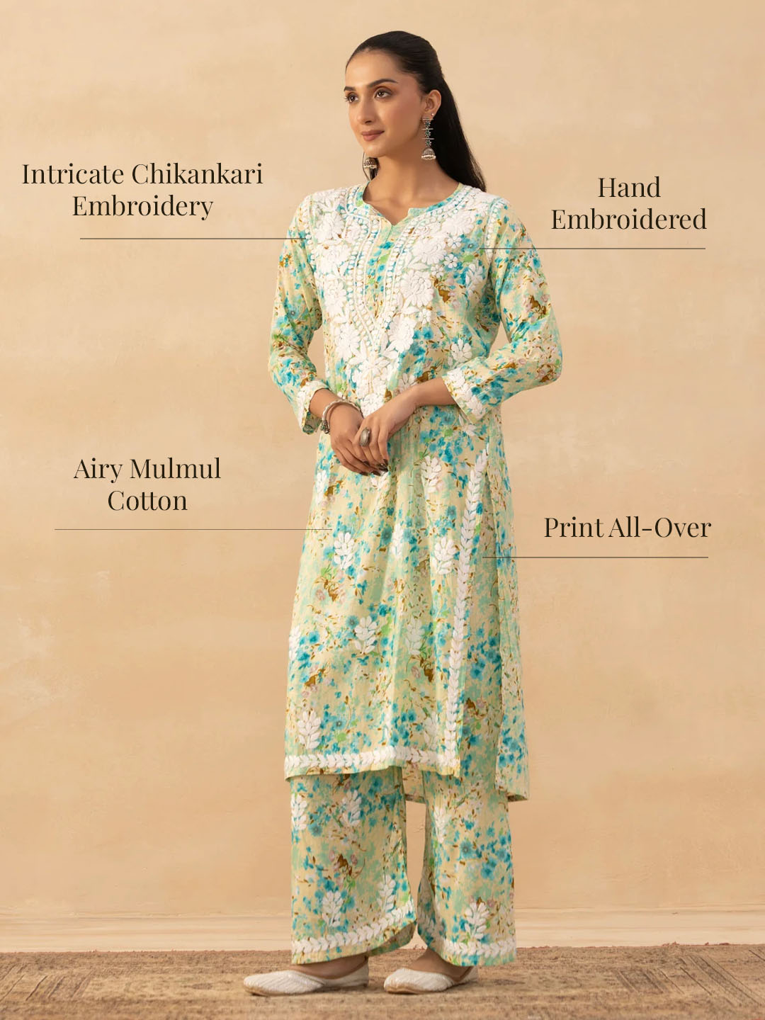 HOC Mulmul Chikankari Printed Women's 2 PC Long Kurta Set - Sky Blue