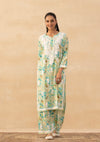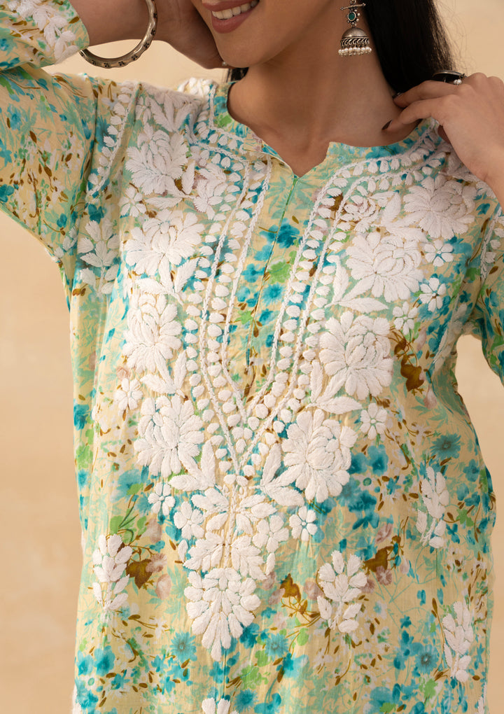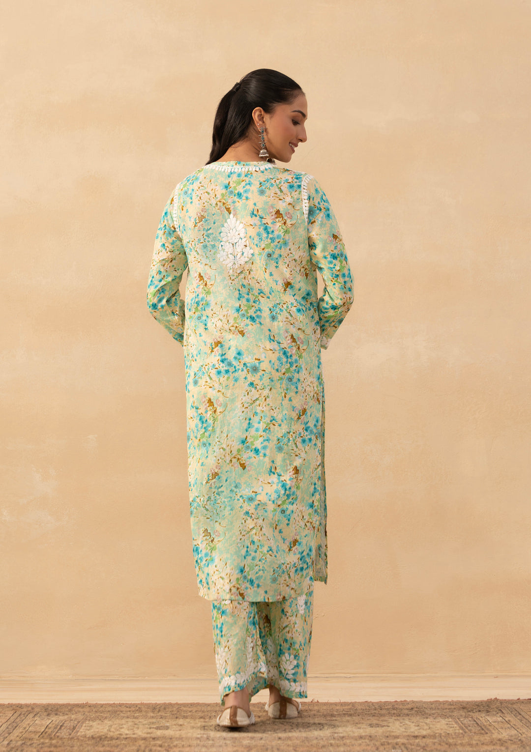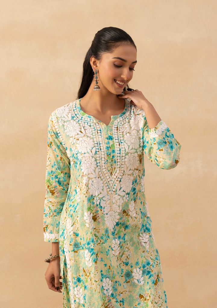 HOC Mulmul Chikankari Printed Women's 2 PC Long Kurta Set - Sky Blue