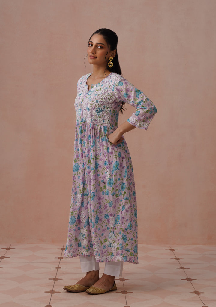 HOC Mulmul Chikankari Printed Women's Long Gown - Pink