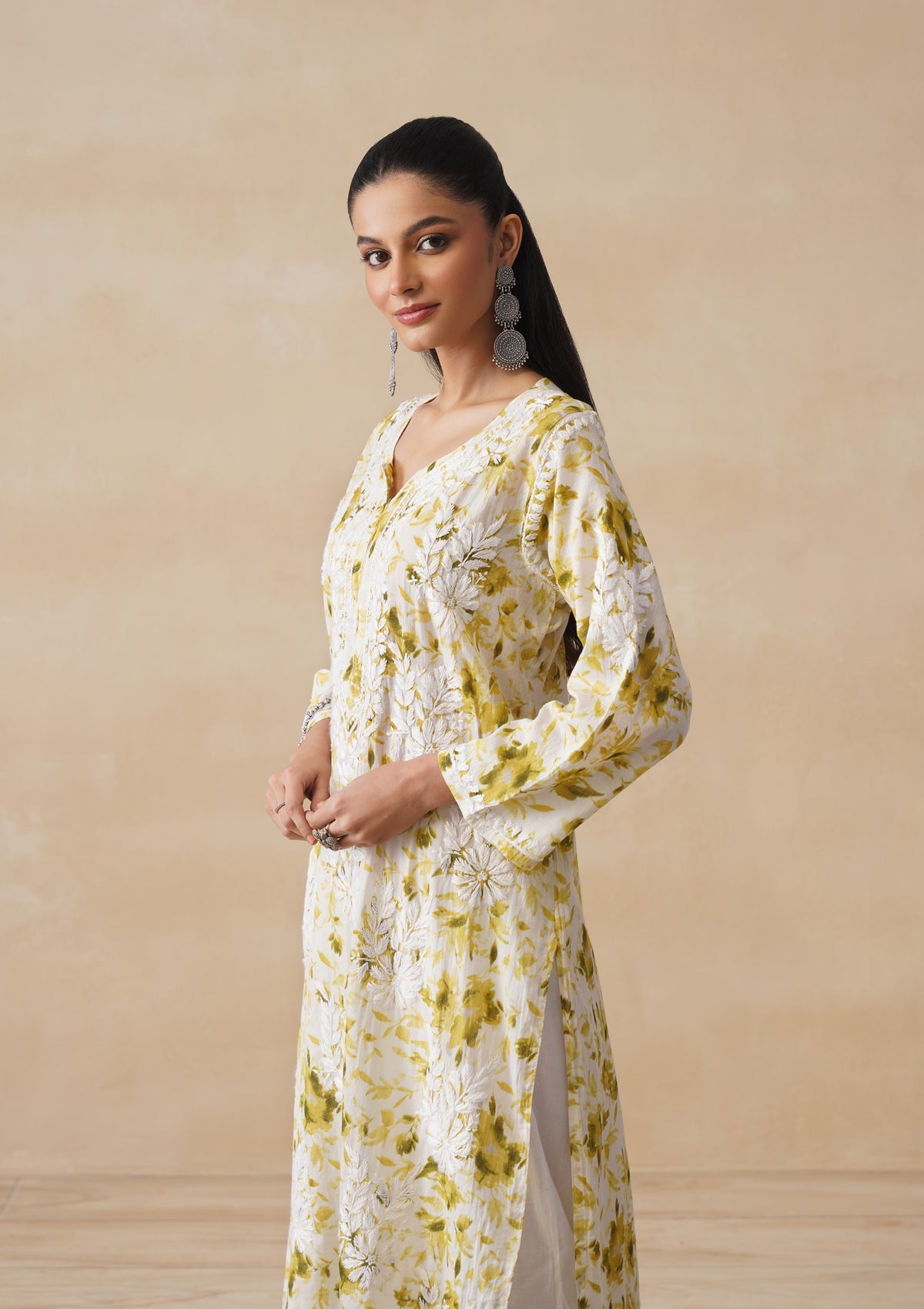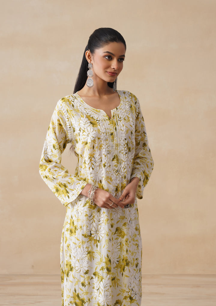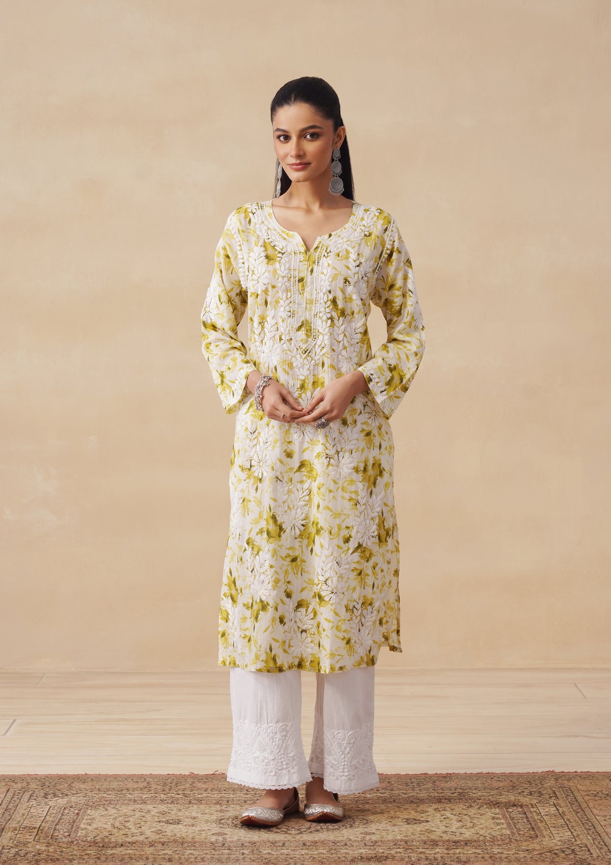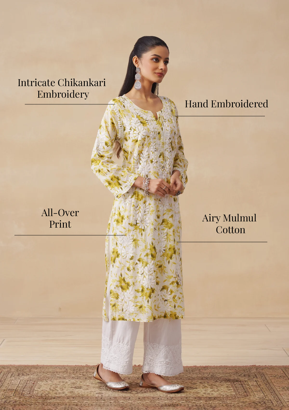 HOC Mulmul Chikankari Printed Women's Long Kurta - Green