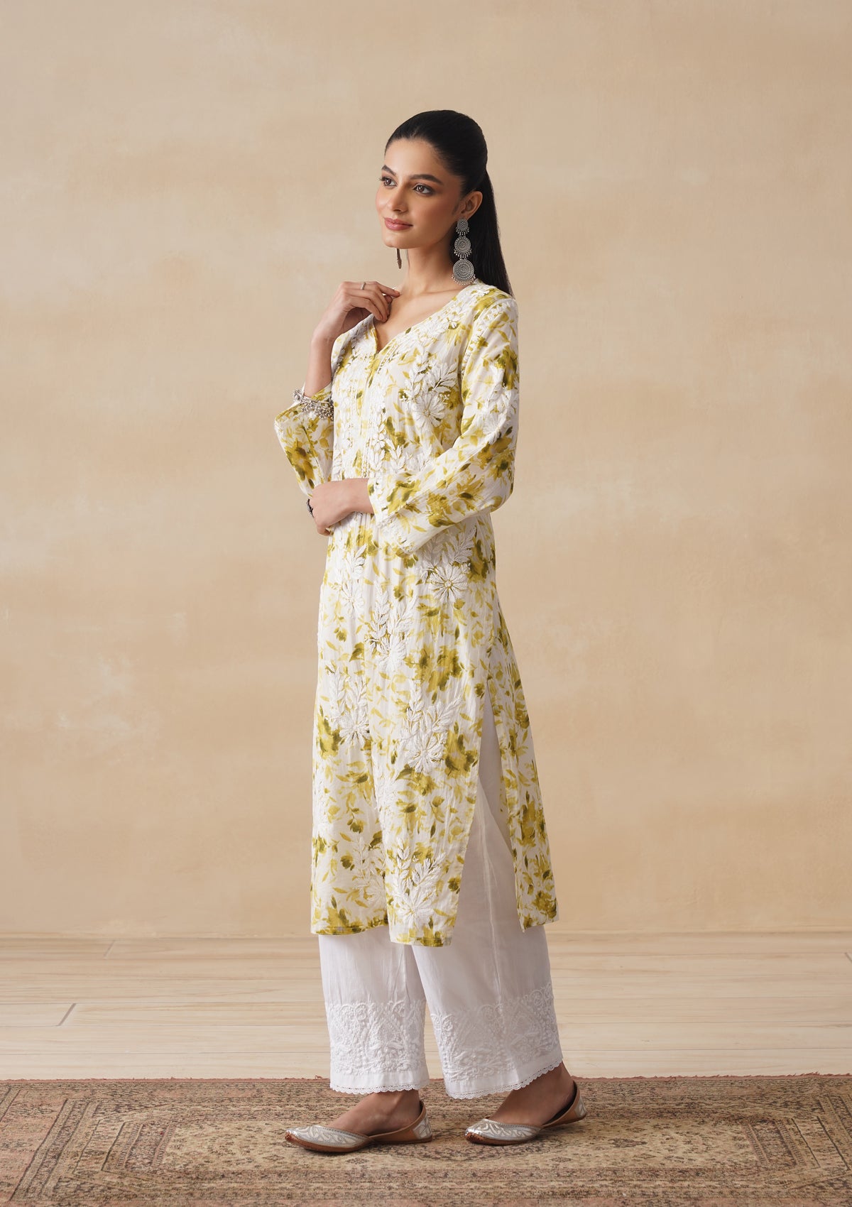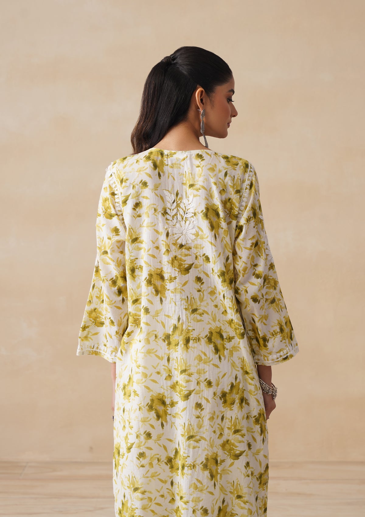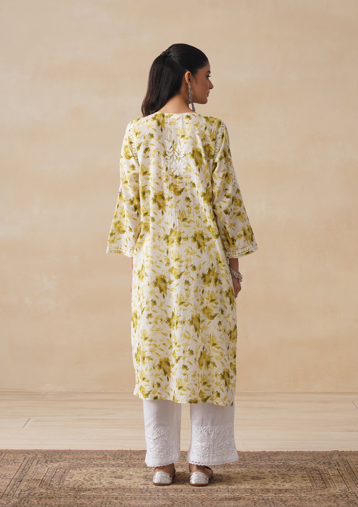 HOC Mulmul Chikankari Printed Women's Long Kurta - Green