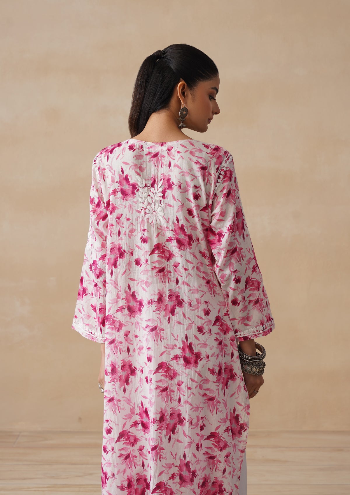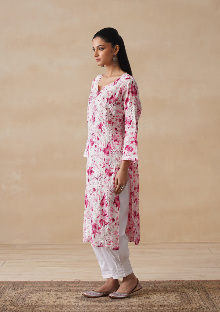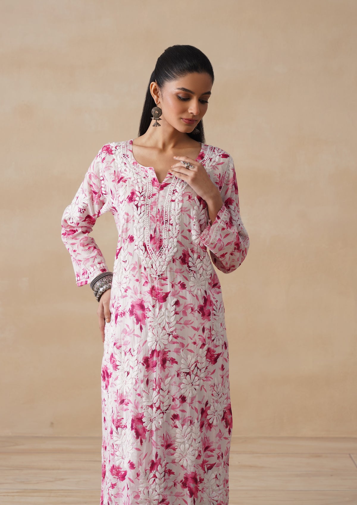 HOC Mulmul Chikankari Printed Women's Long Kurta - Pink