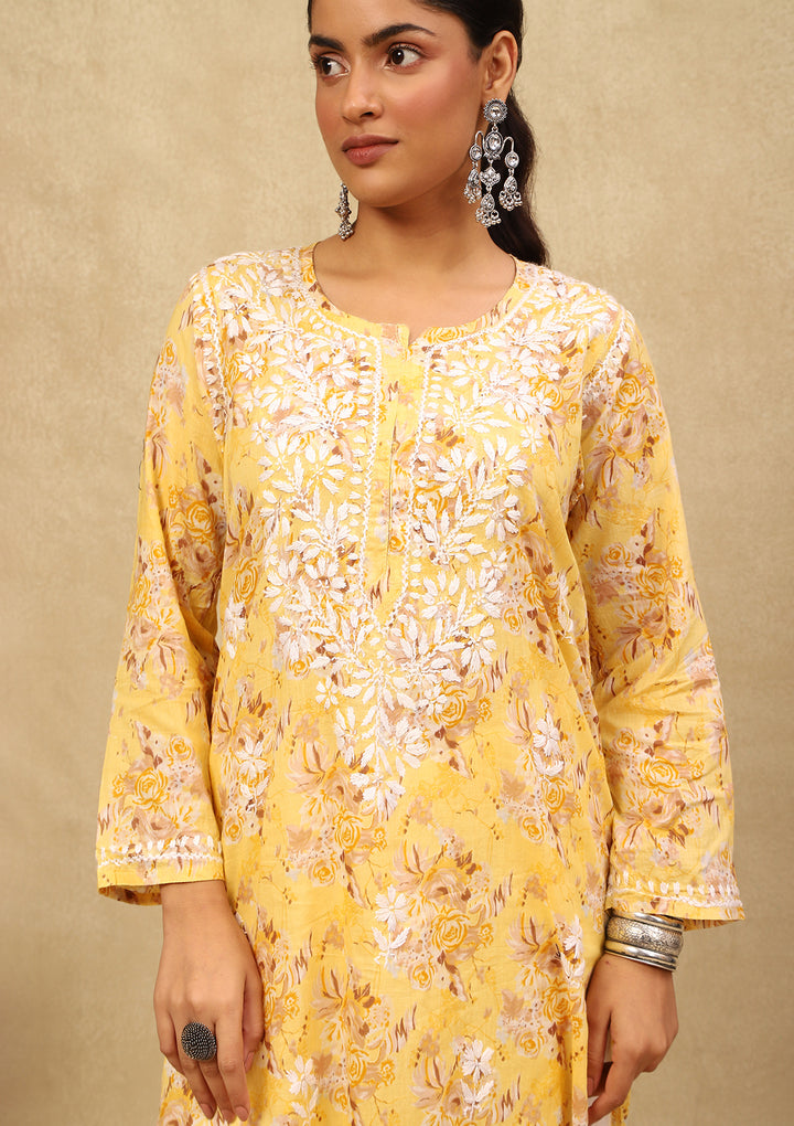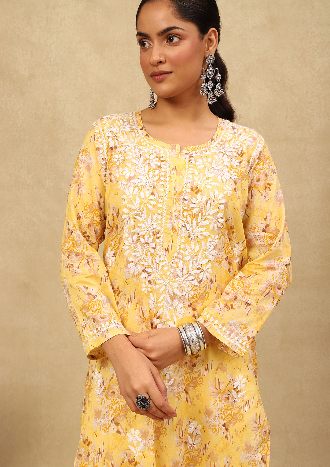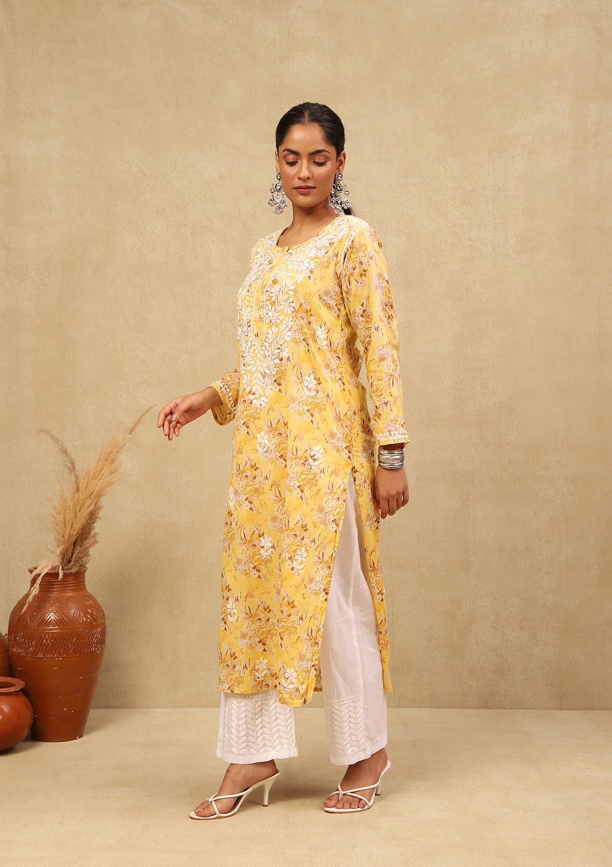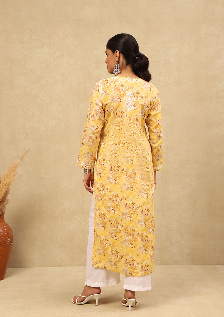 HOC Mulmul Chikankari Printed Women's Long Kurta -Yellow