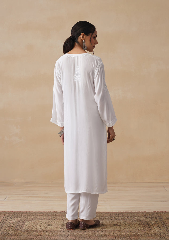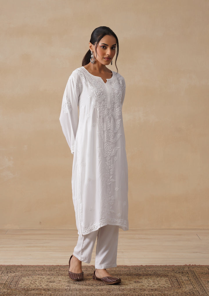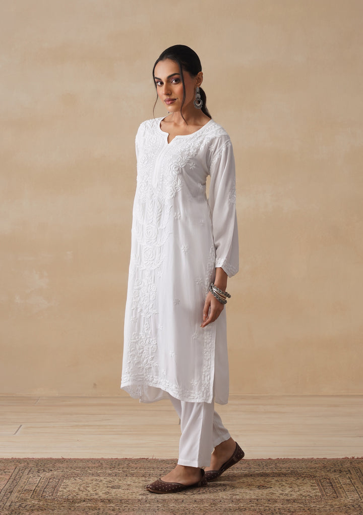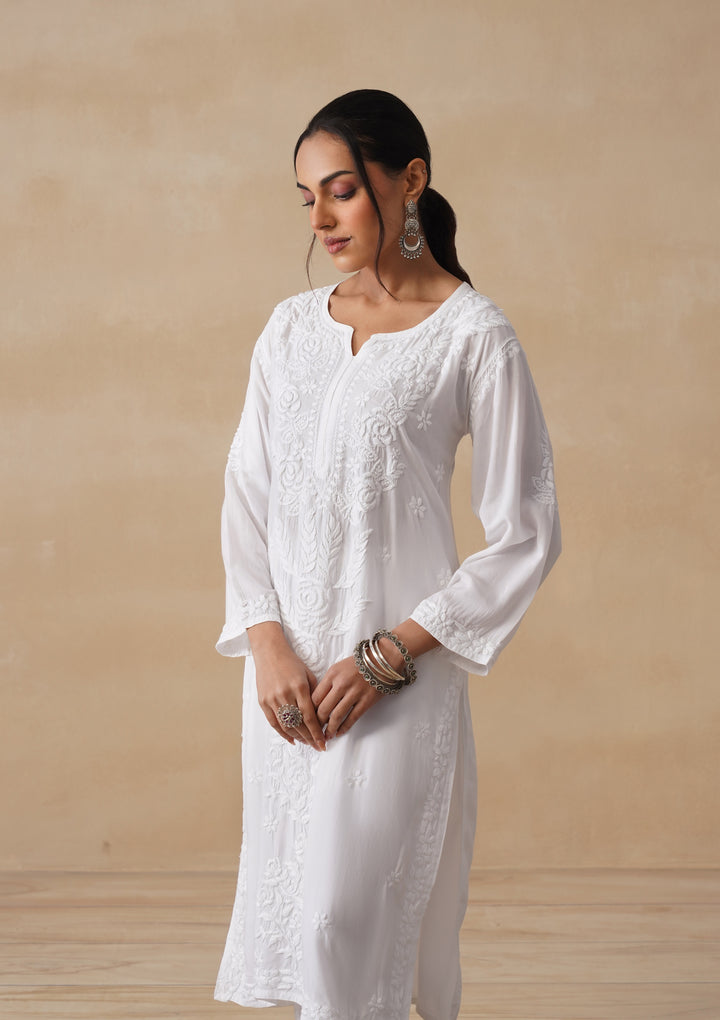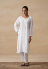 HOC Mulmul Chikankari Solid Women's Long Kurta - White