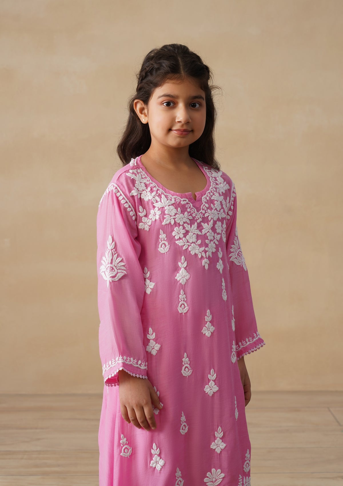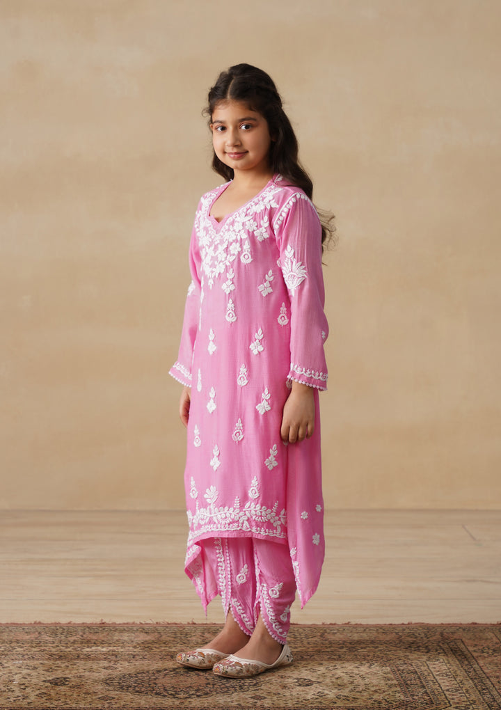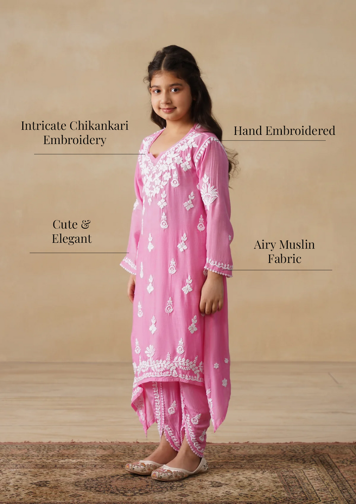 HOC Muslin Chikankari Solid Girls 2 PC Long Kurta Set - Pink