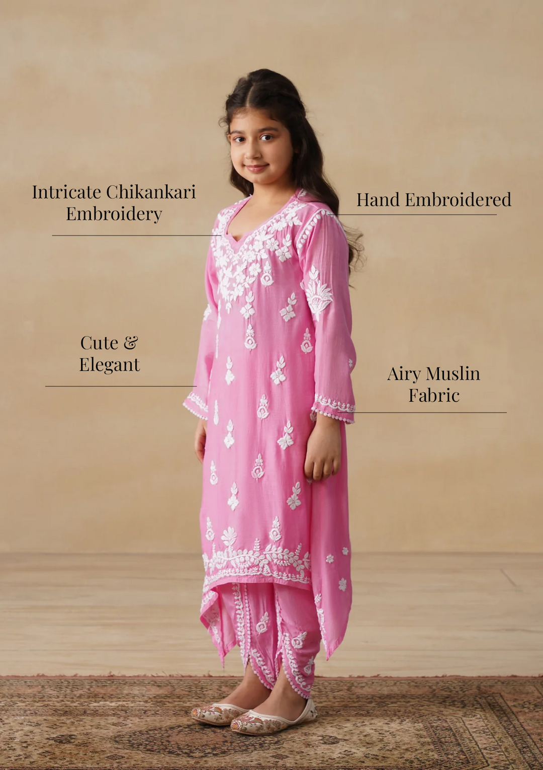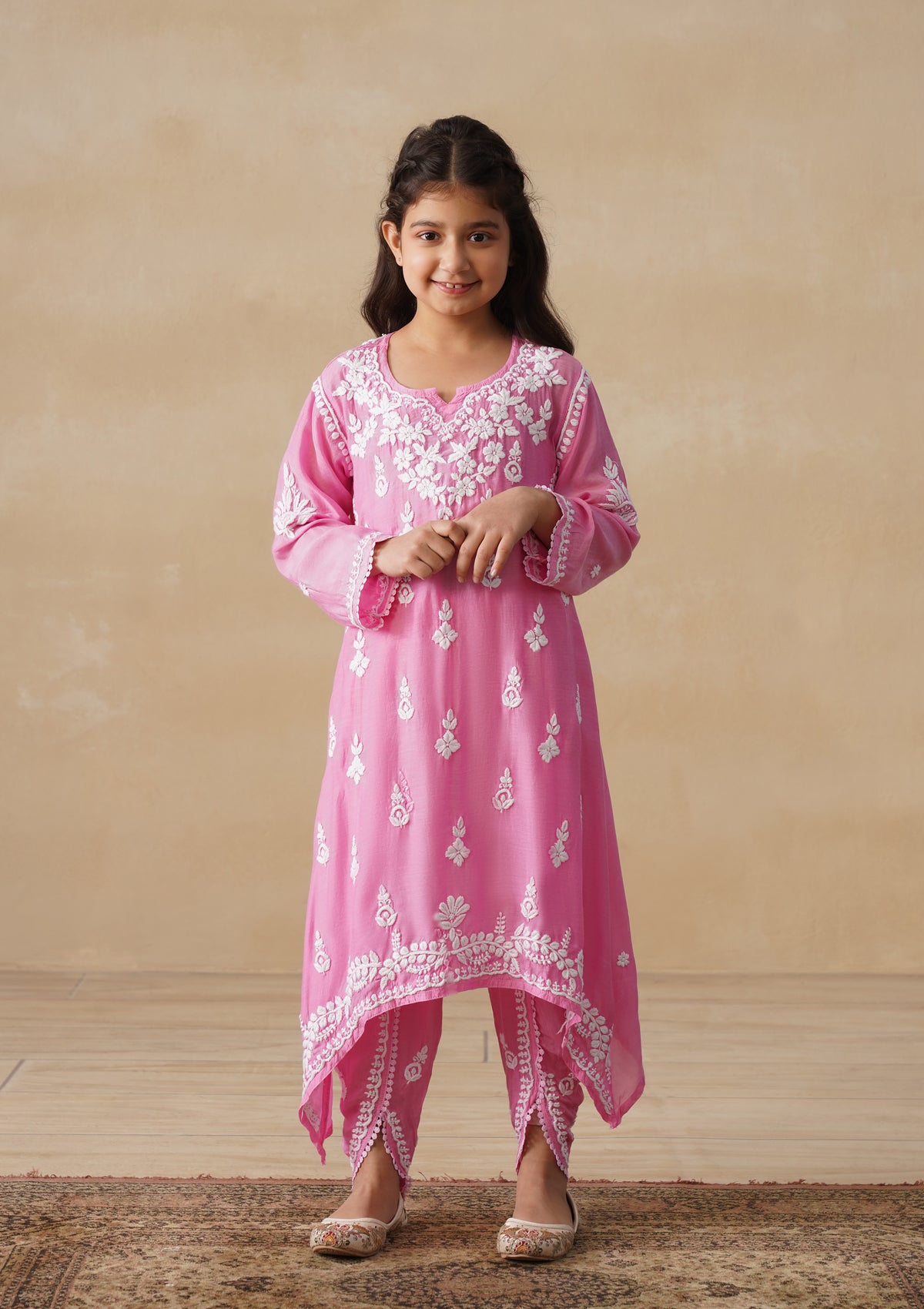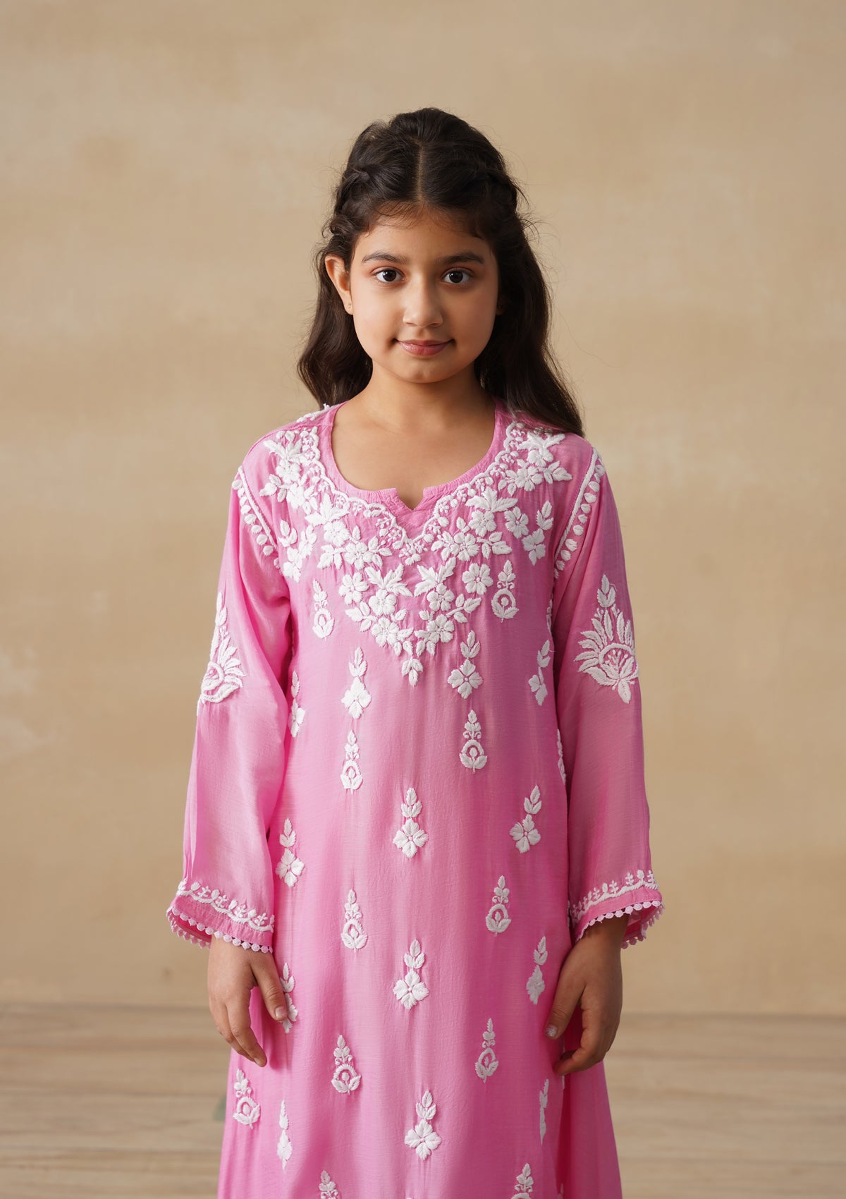 HOC Muslin Chikankari Solid Girls 2 PC Long Kurta Set - Pink
