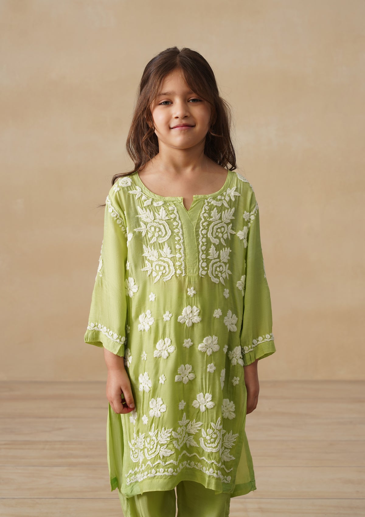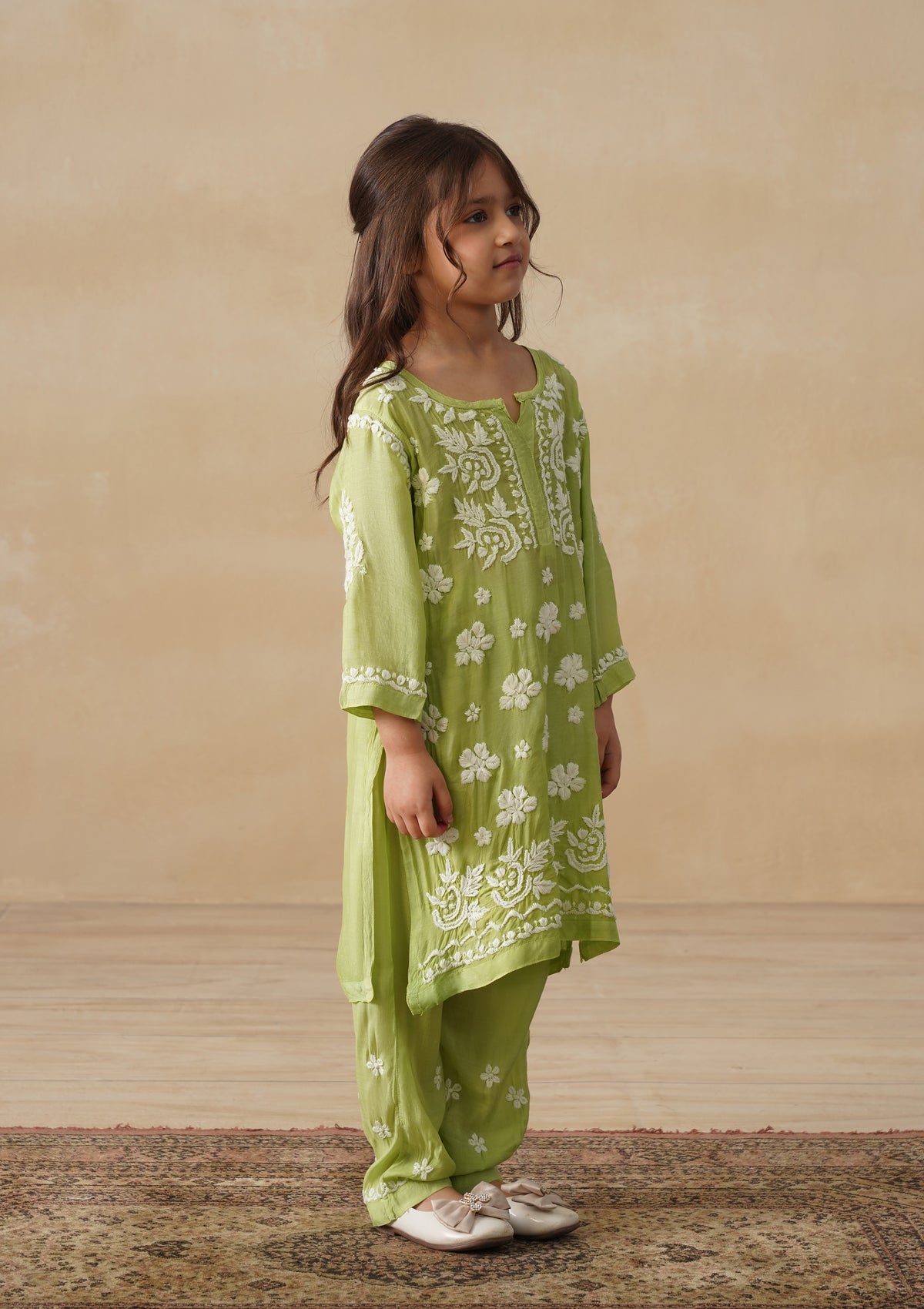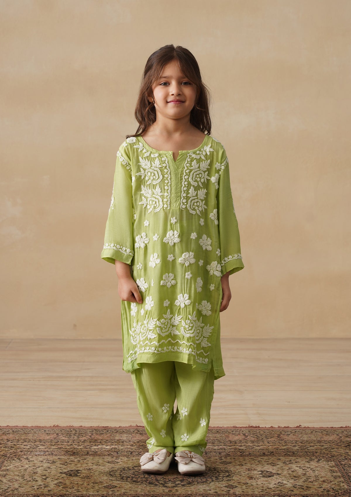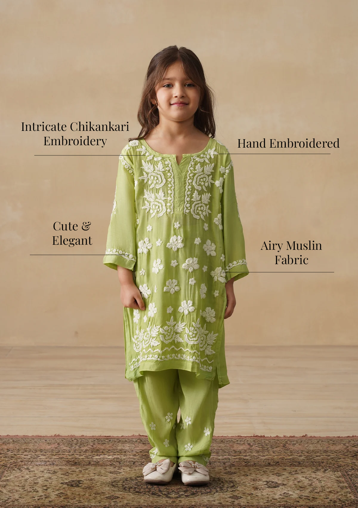 HOC Muslin Chikankari Solid Girls 2 PC Long Kurta Set - Pista green