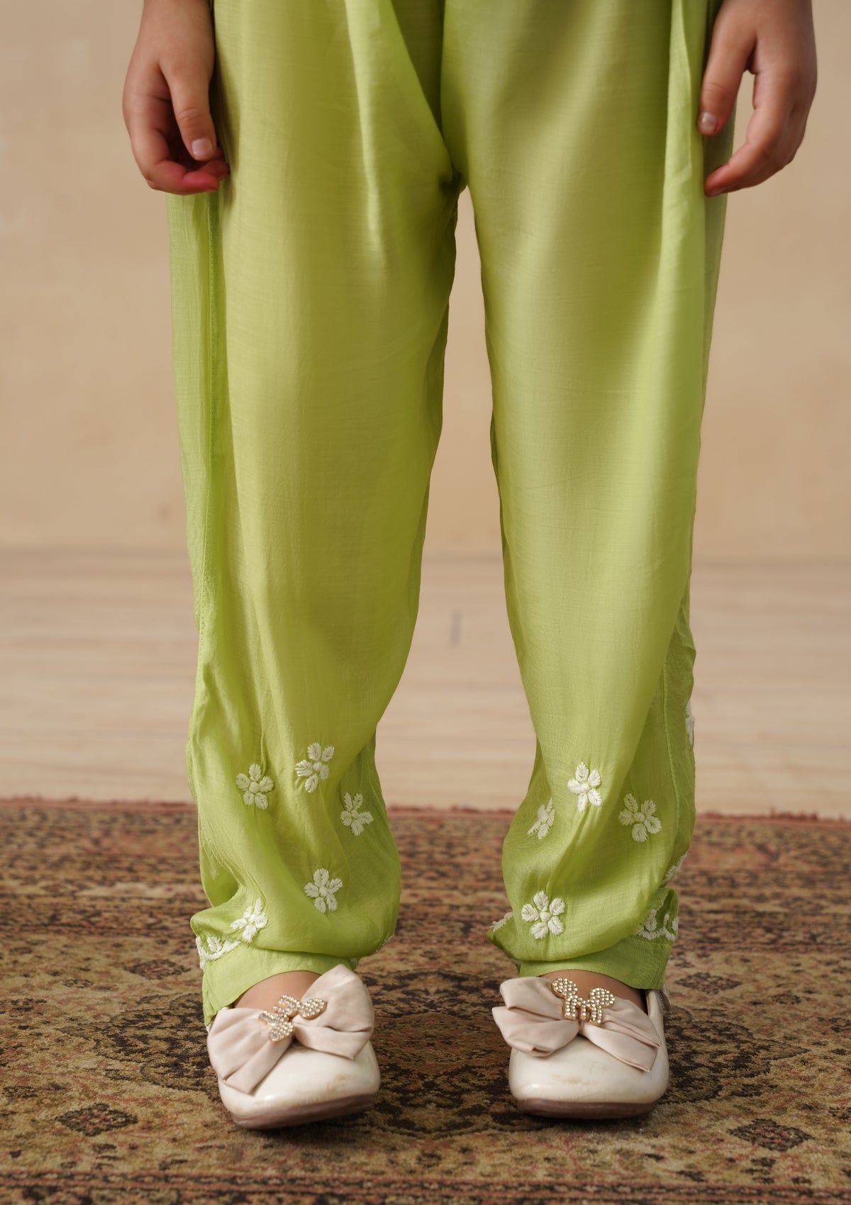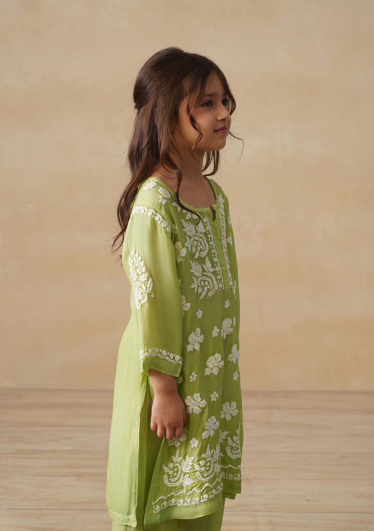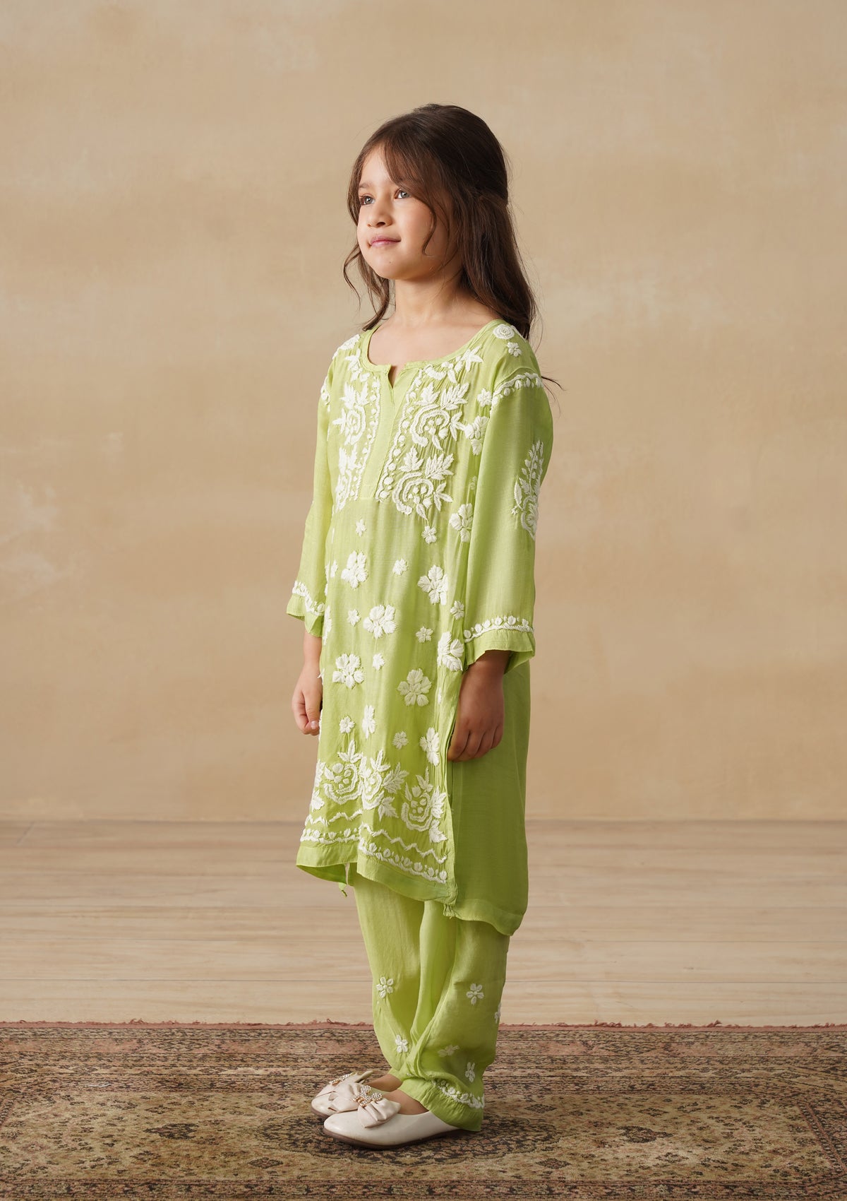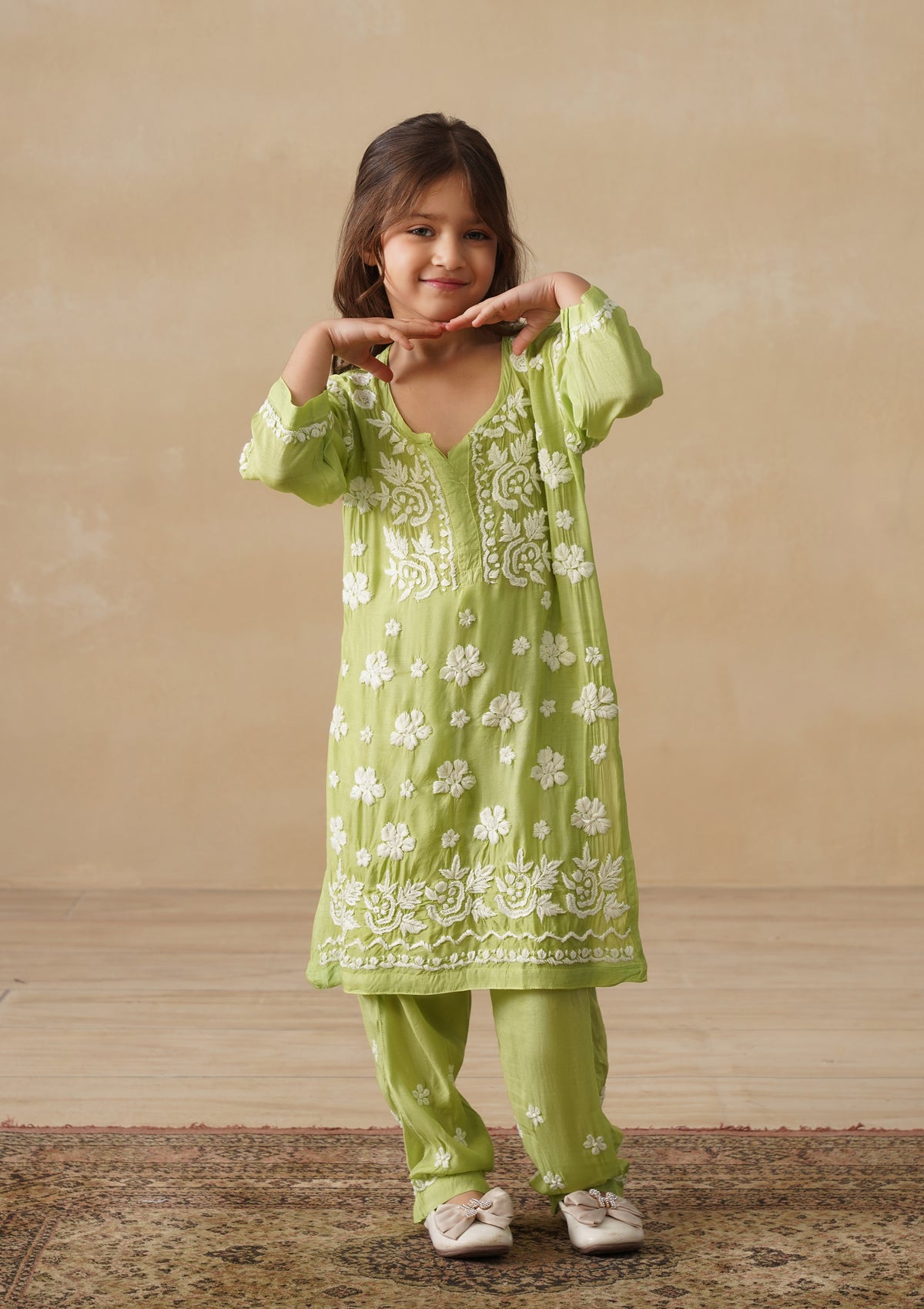 HOC Muslin Chikankari Solid Girls 2 PC Long Kurta Set - Pista green
