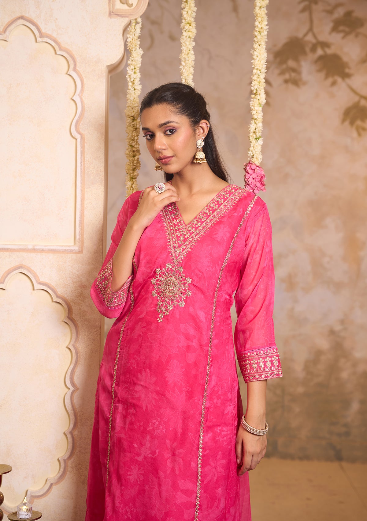 HOC Organza Blend Embroidered Zardozi Printed Women's 3 PC A-Line Kurta Set-Pink