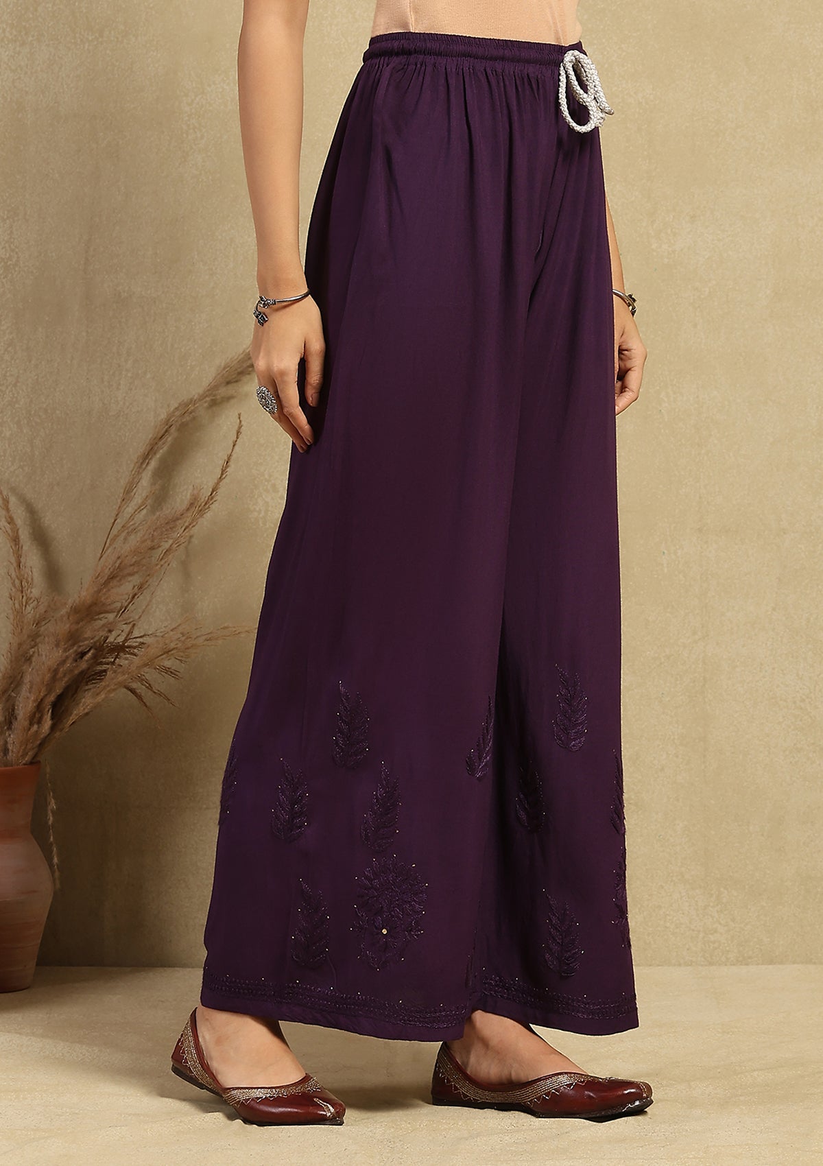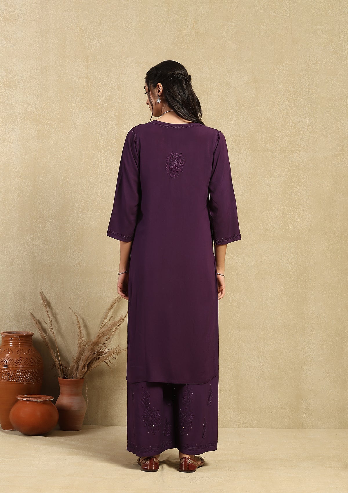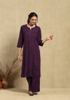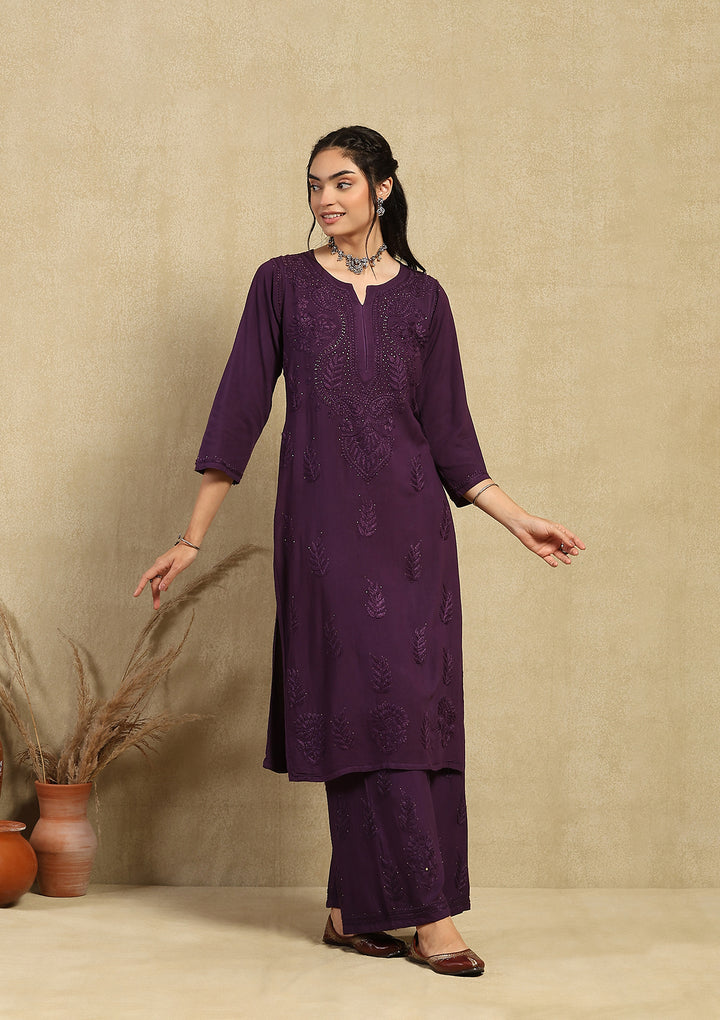 HOC Rayon Chikankari Mukaish Solid Women's 2PC Long Kurta Set -Dark Purple