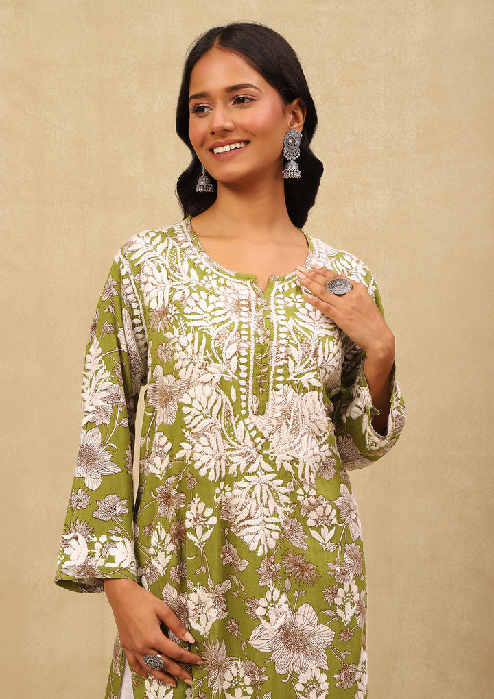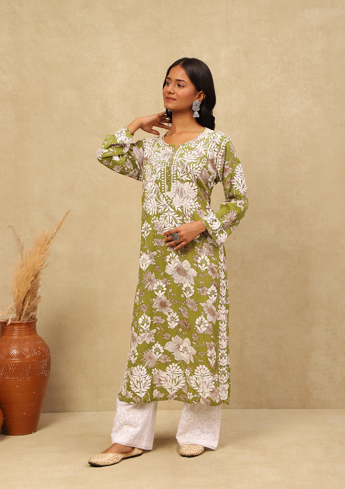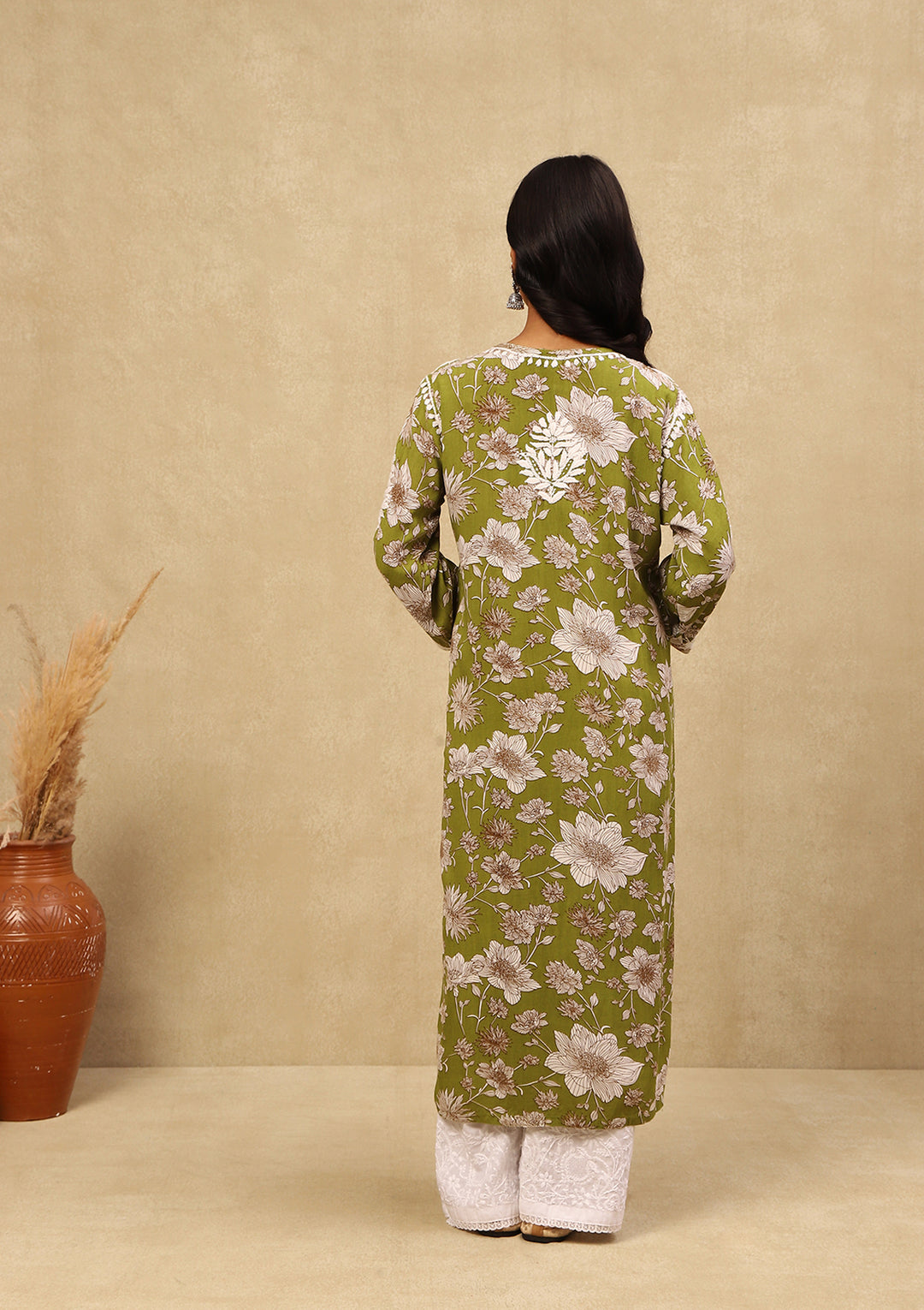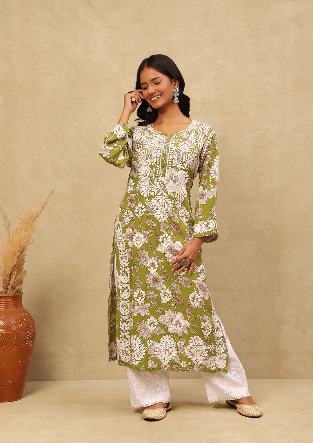 HOC Rayon Chikankari Printed Women's Long Kurta -Green