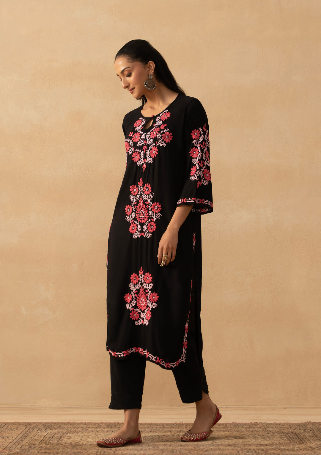 HOC Rayon Chikankari Solid Women's Long Kurta - Black