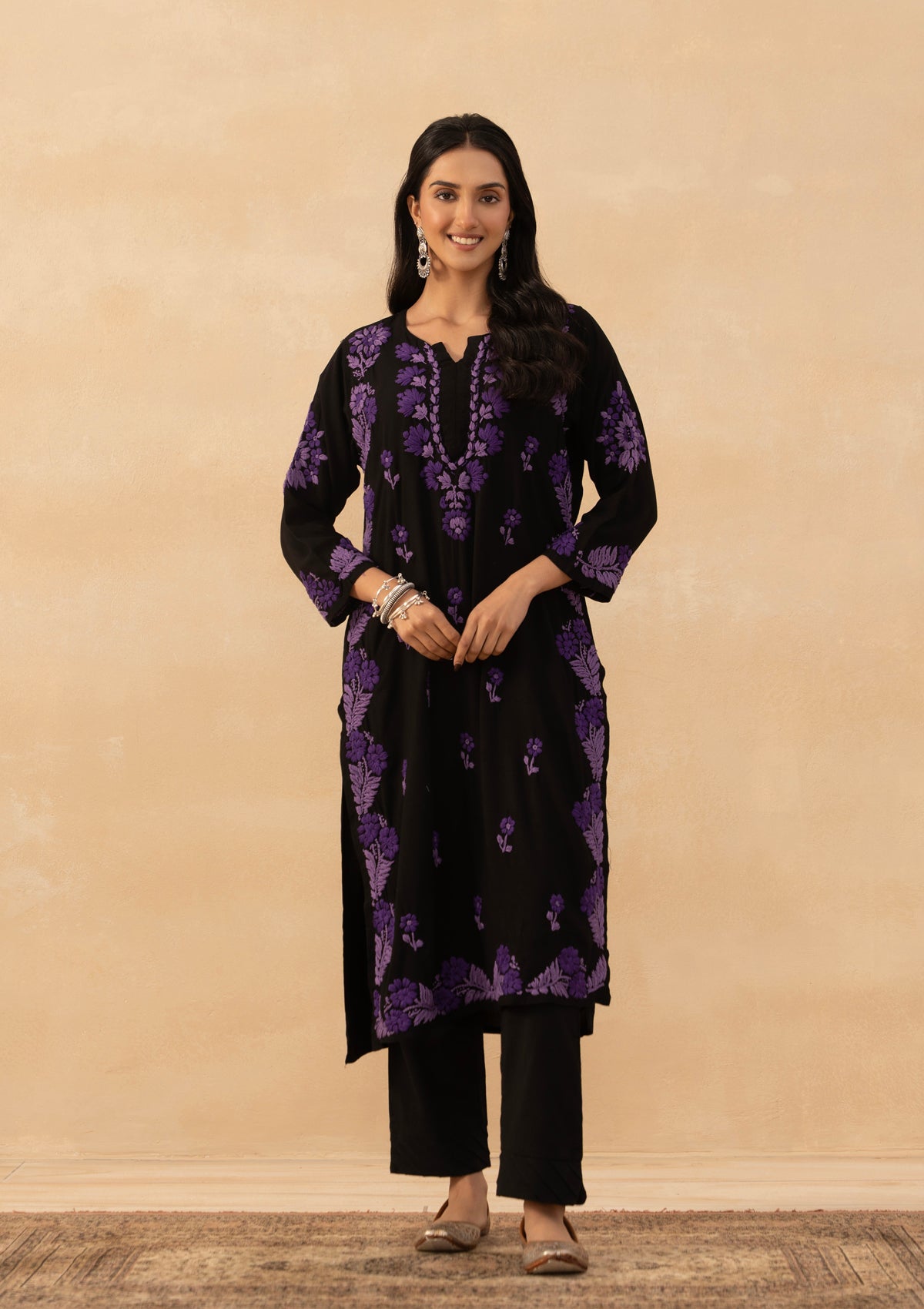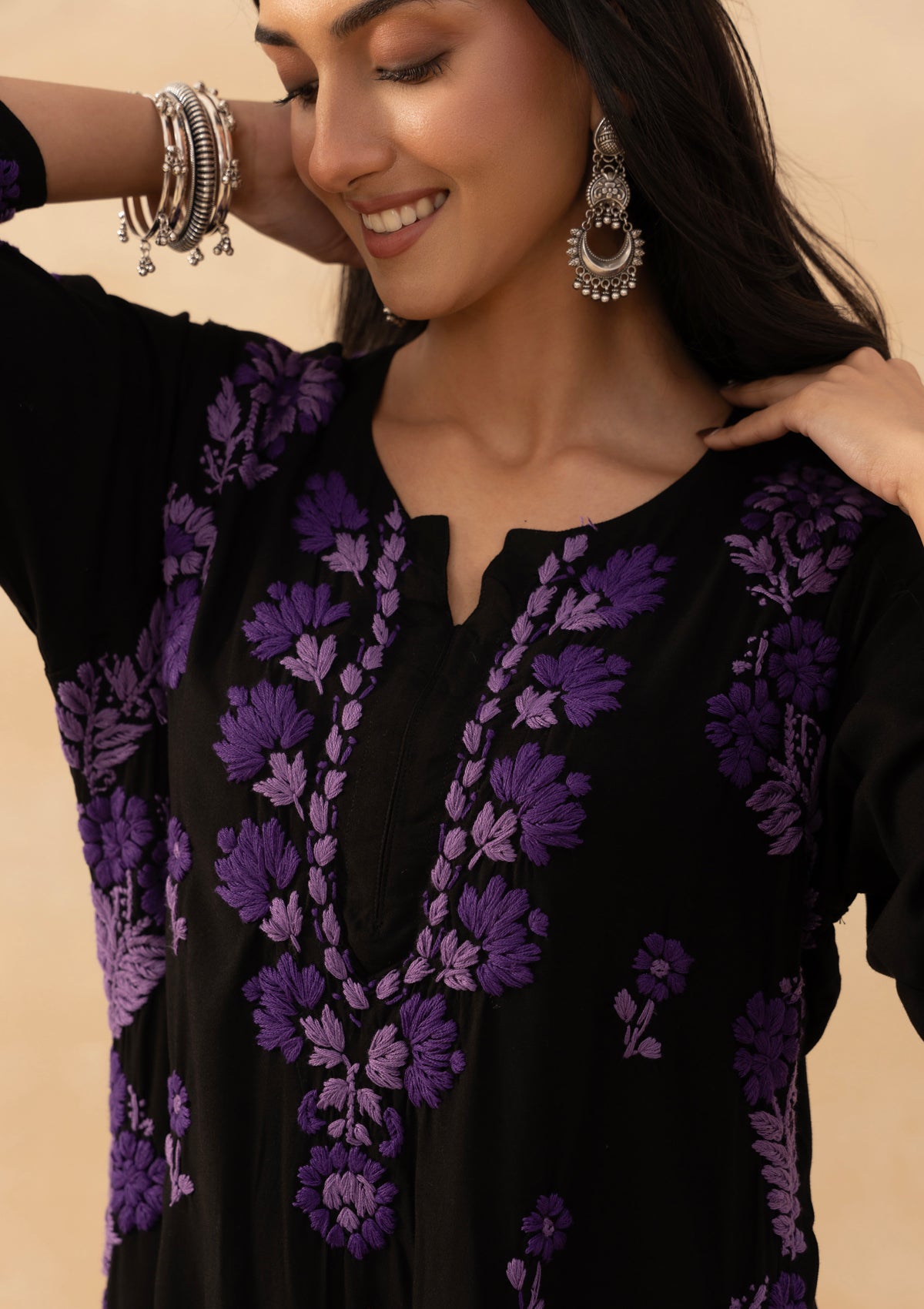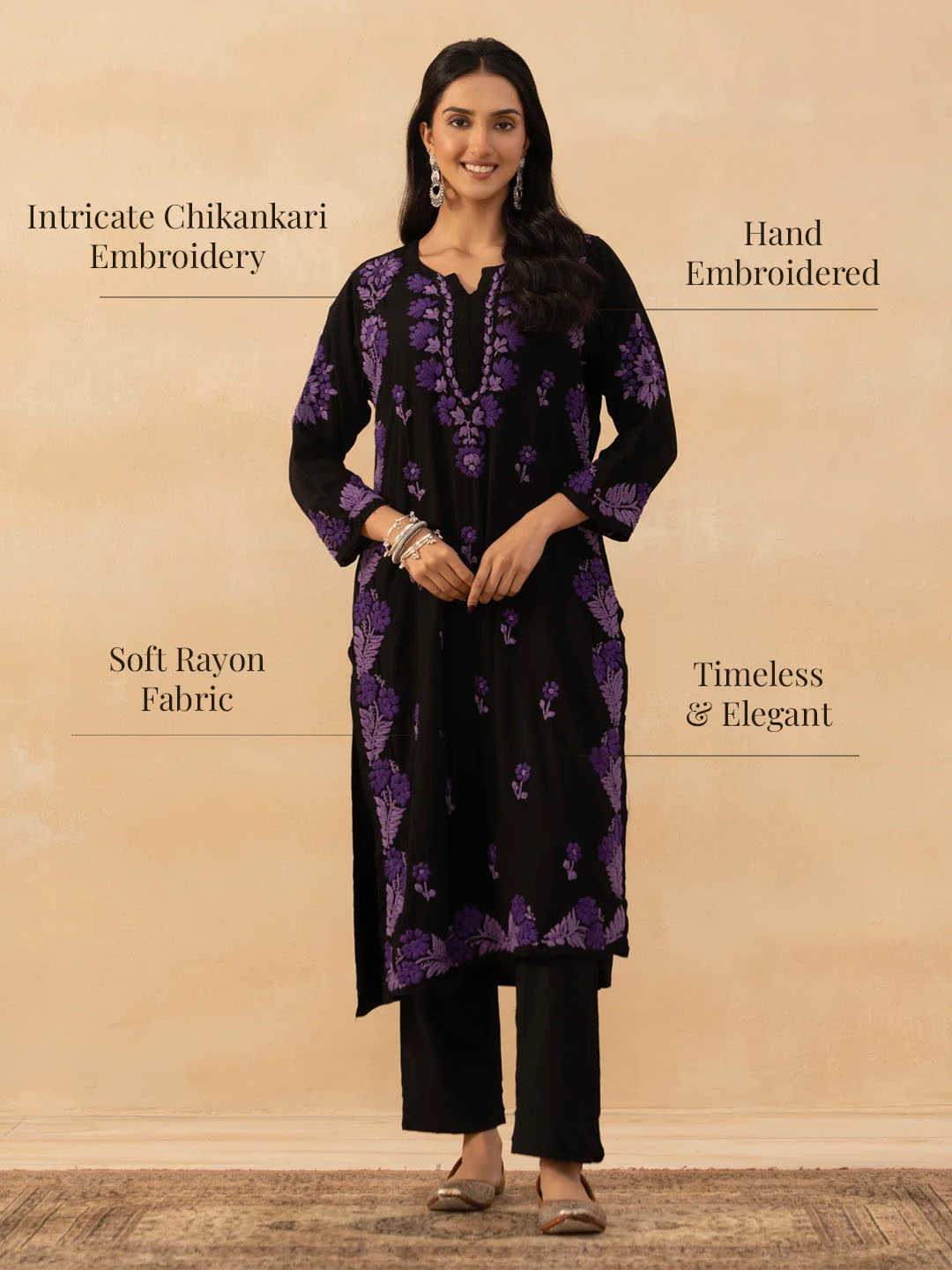 HOC Rayon Chikankari Solid Women's Long Kurta - Black