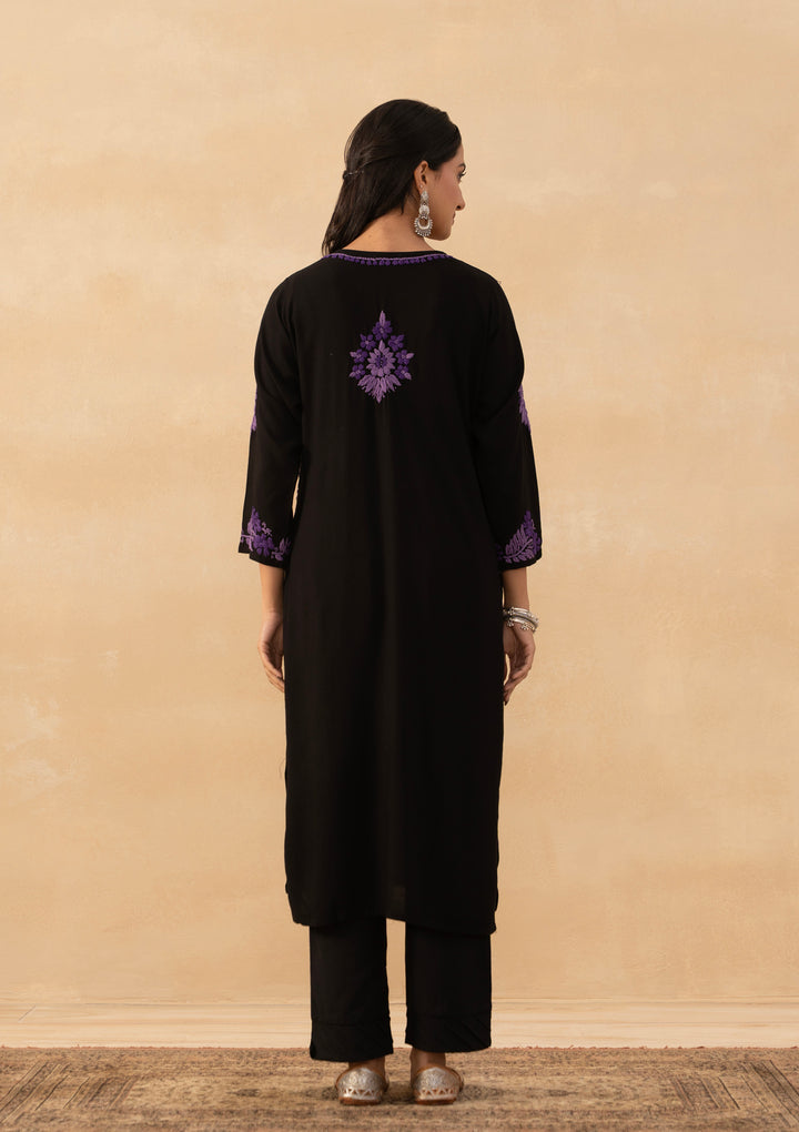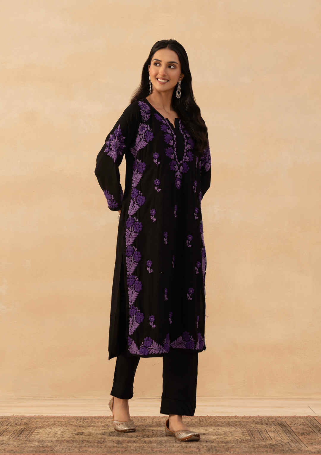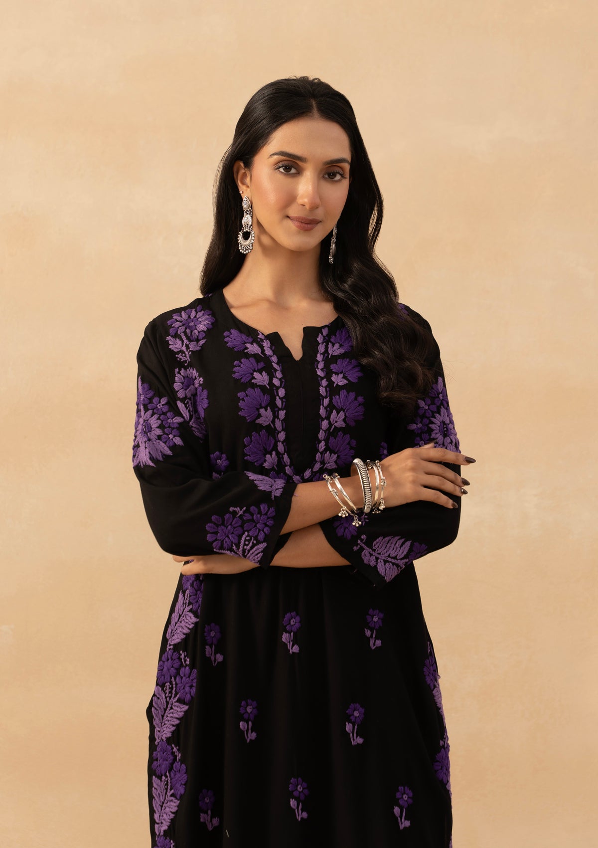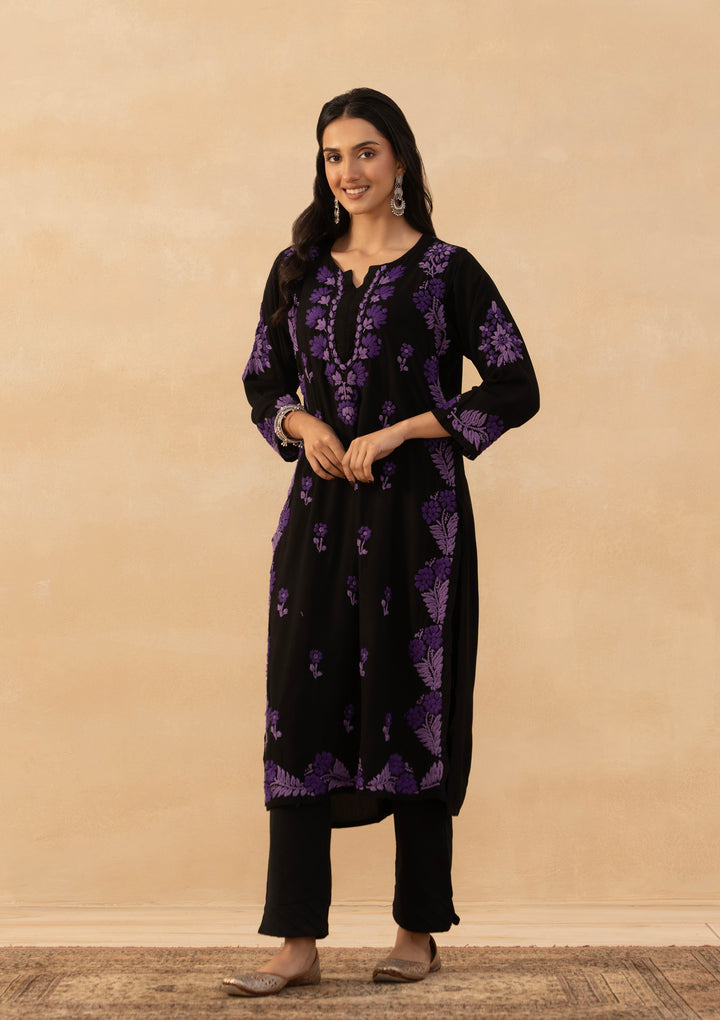 HOC Rayon Chikankari Solid Women's Long Kurta - Black