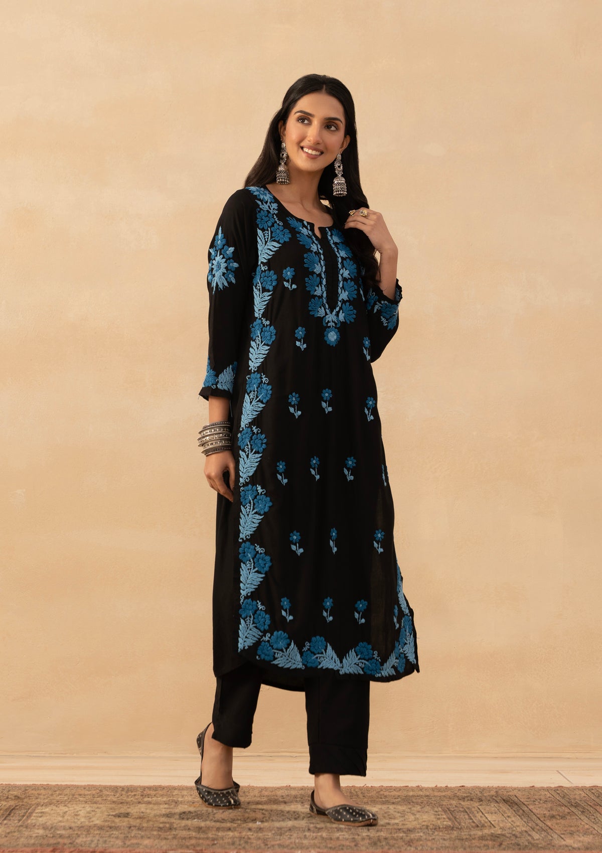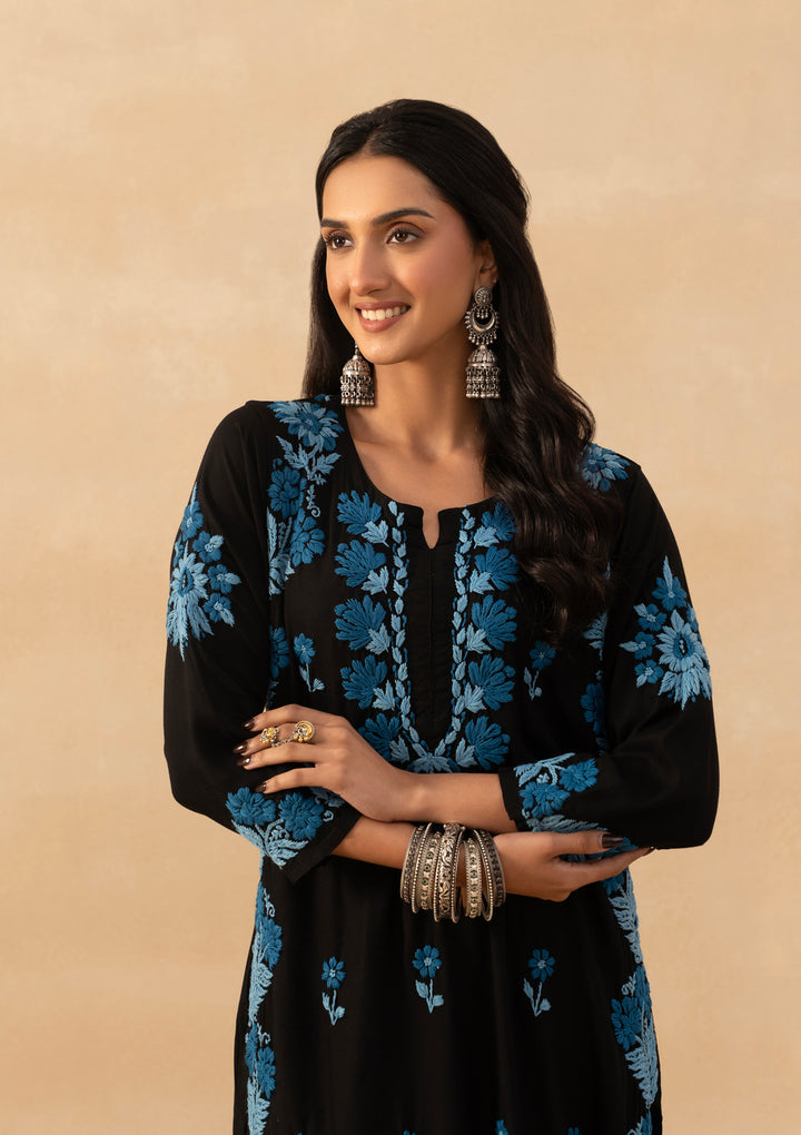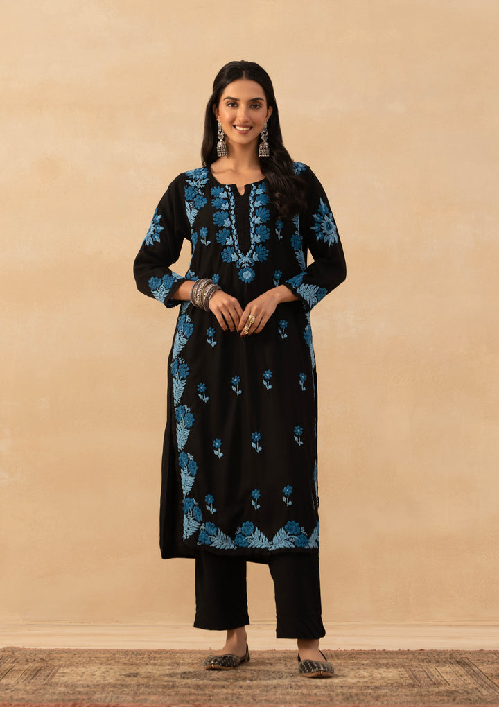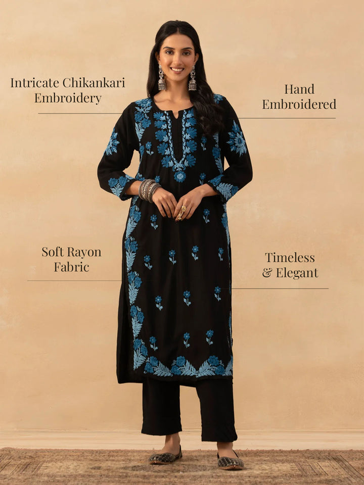 HOC Rayon Chikankari Solid Women Long Kurta - Black