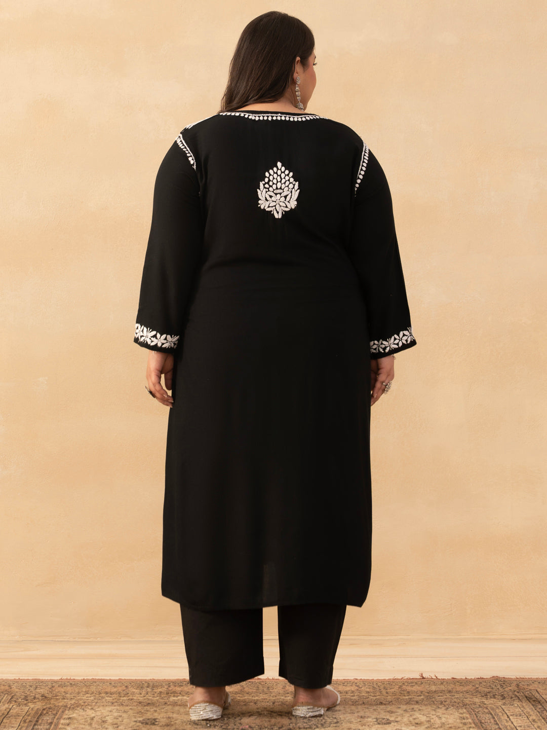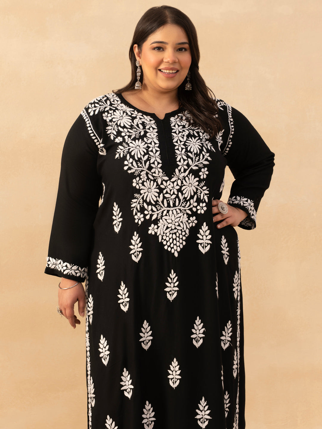HOC Rayon Chikankari Solid Women's Long Kurta - Black