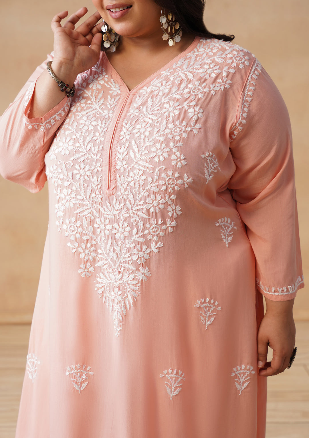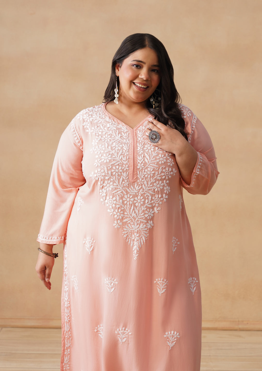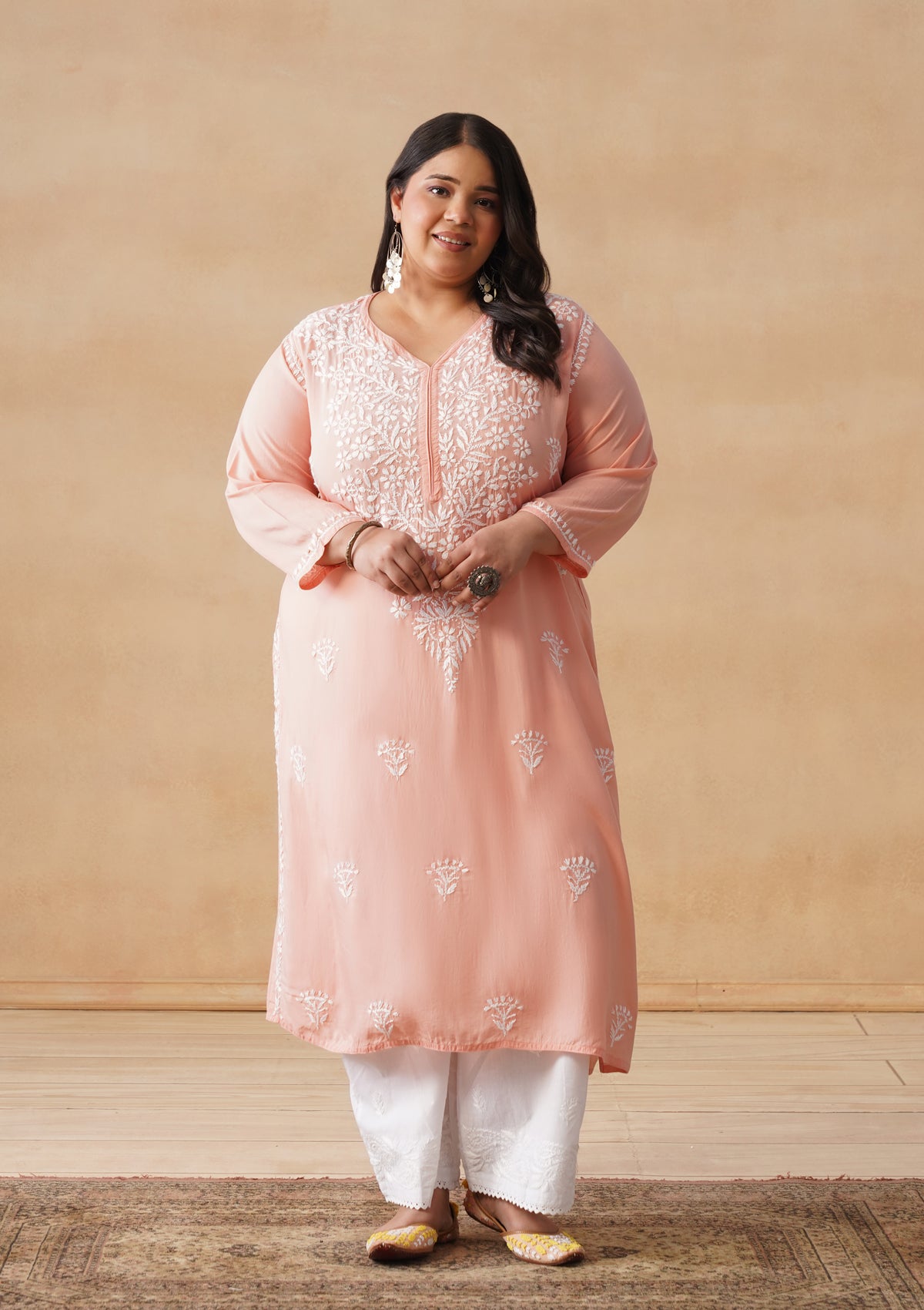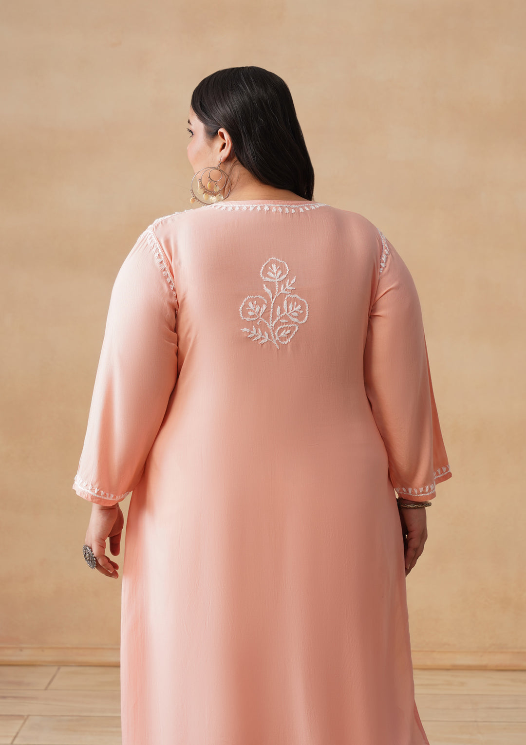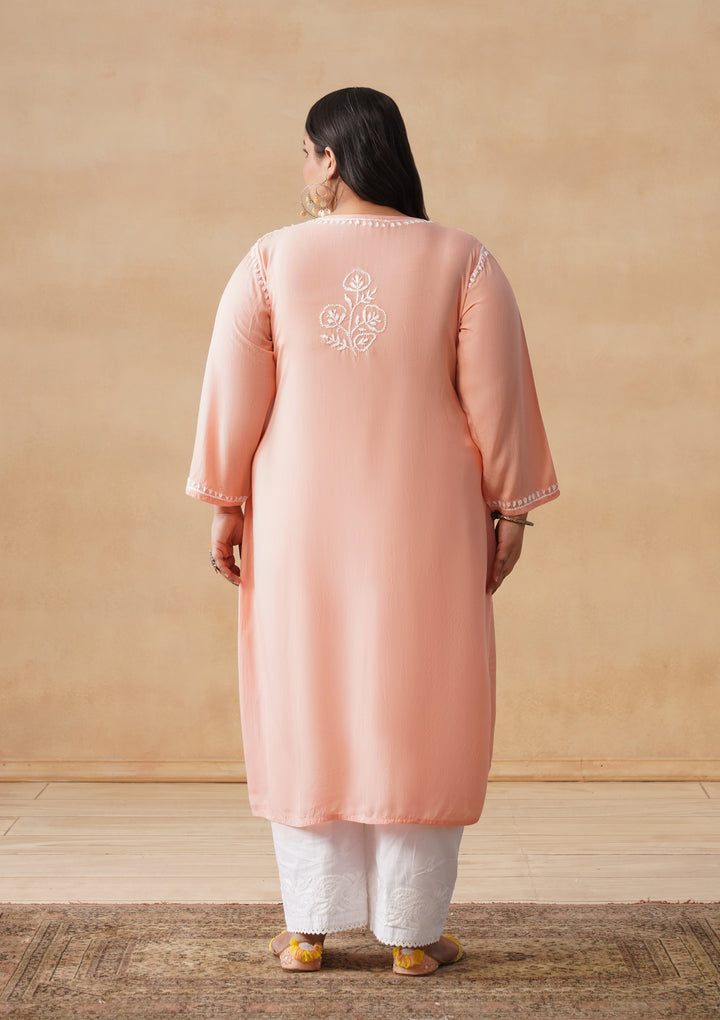 HOC Rayon Chikankari Solid Women's Long Kurta - Peach